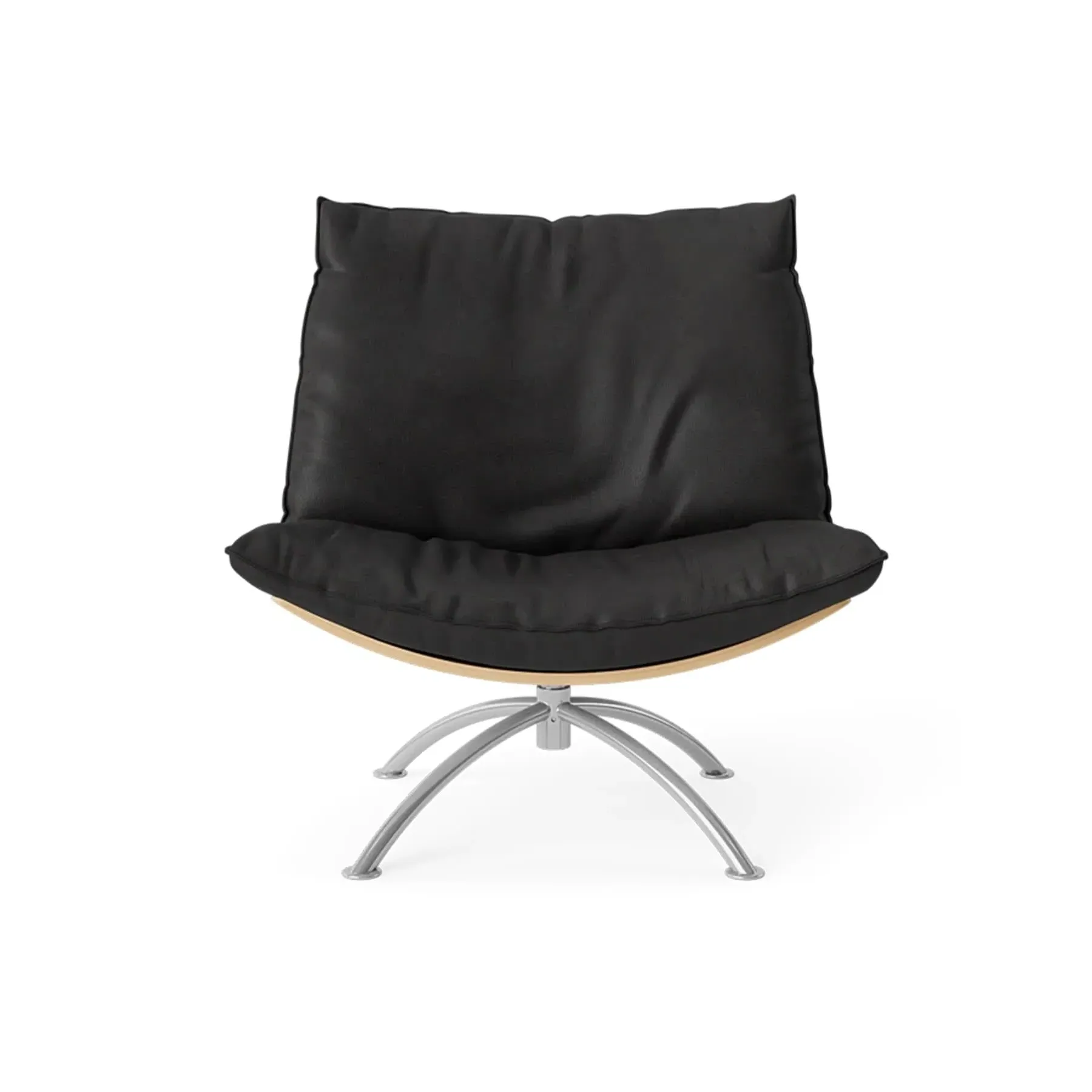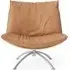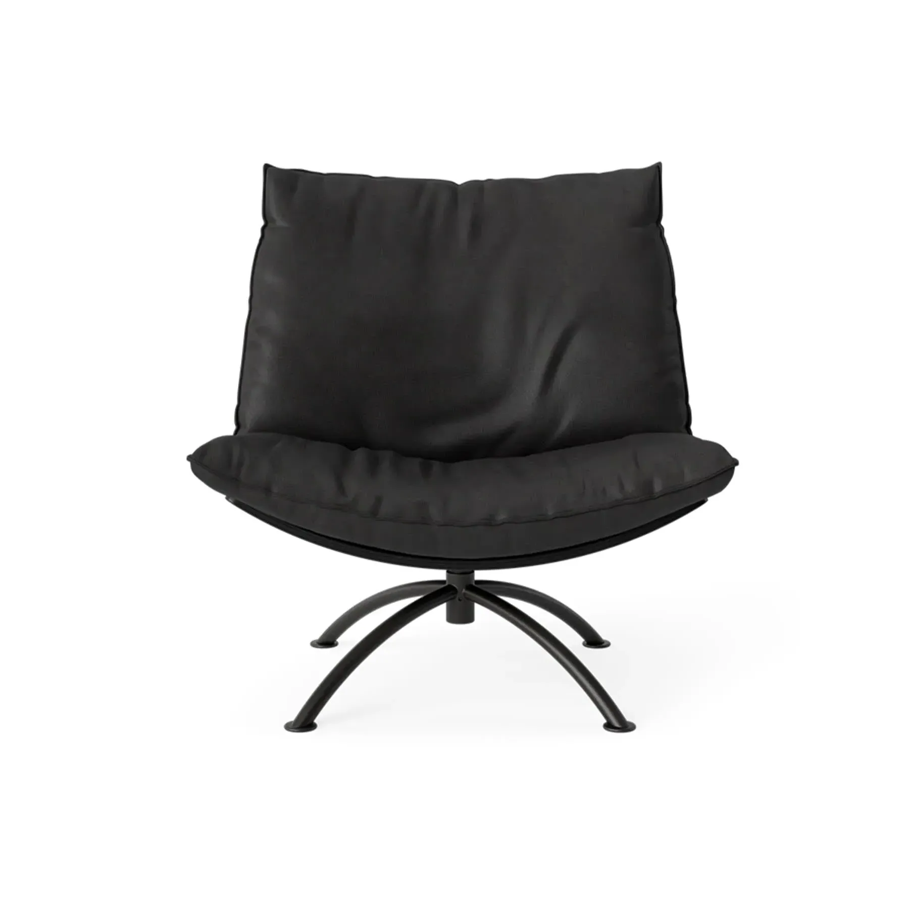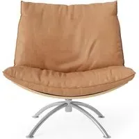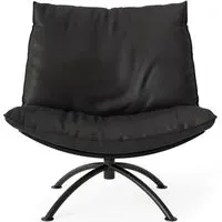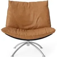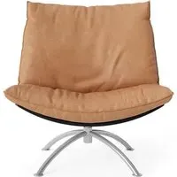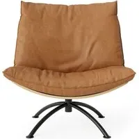 The Primetime armchair provides comfort through its cold foam and down-filled cushions, featuring a functional swivel mechanism. Its black oak frame offers durability with a sophisticated finish, while the black steel base ensures reliable support. The cognac Dunes leather develops a rich patina over time, and the FSC-certified construction supports environmental responsibility.