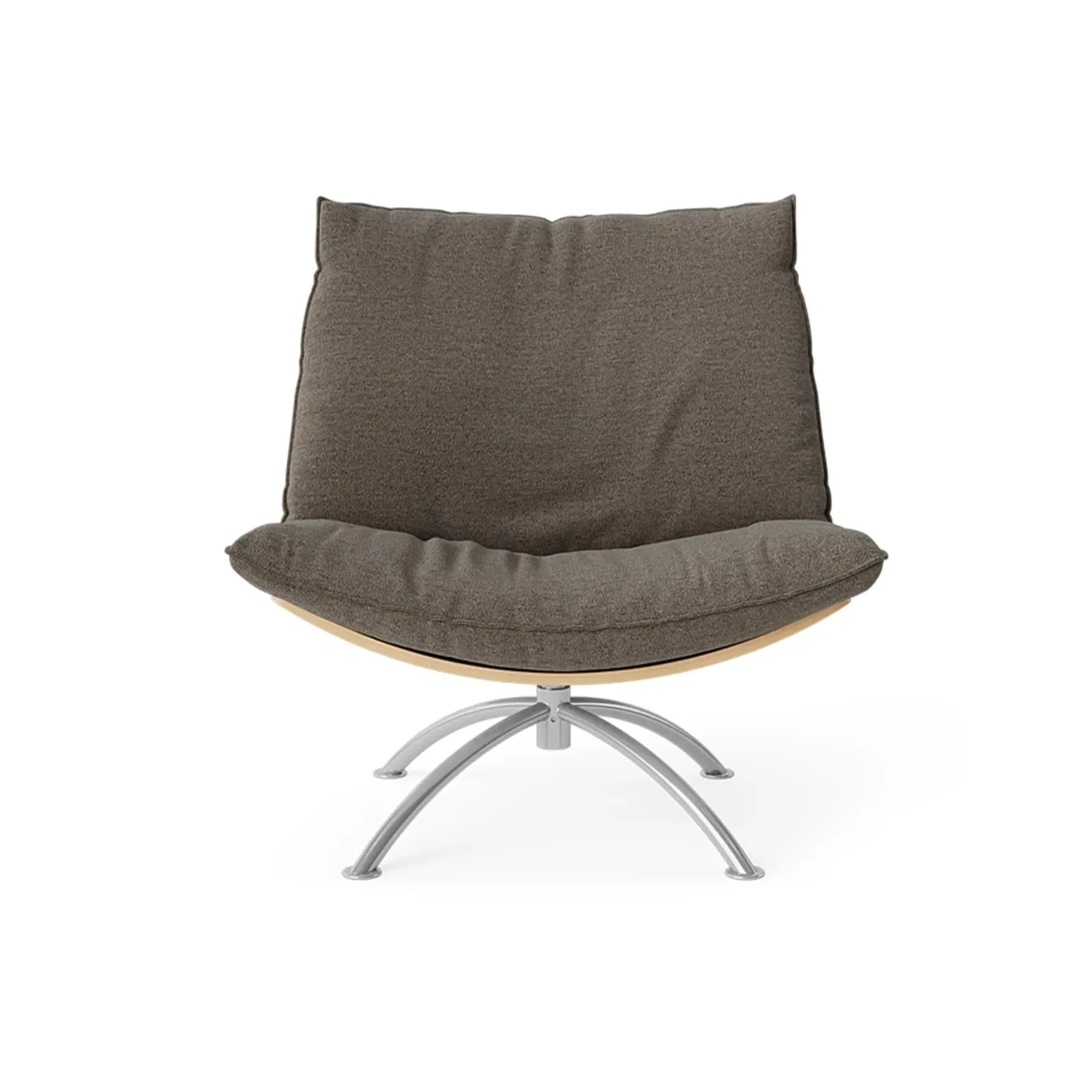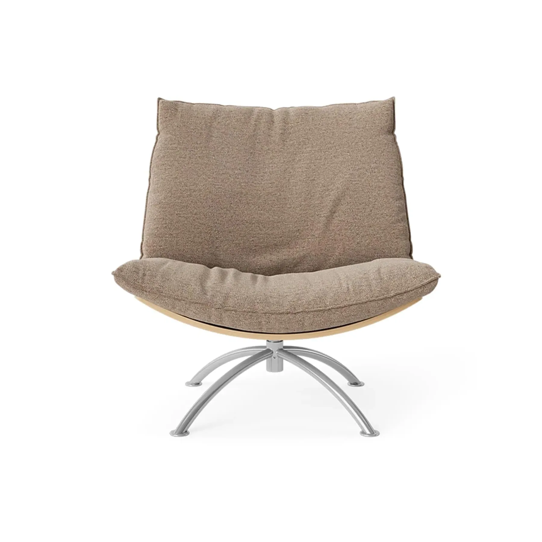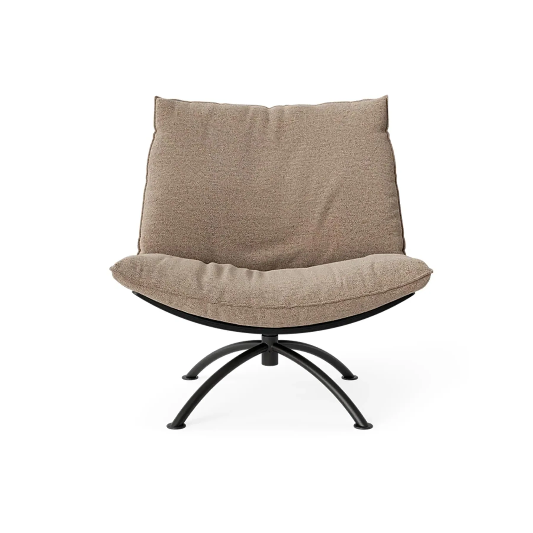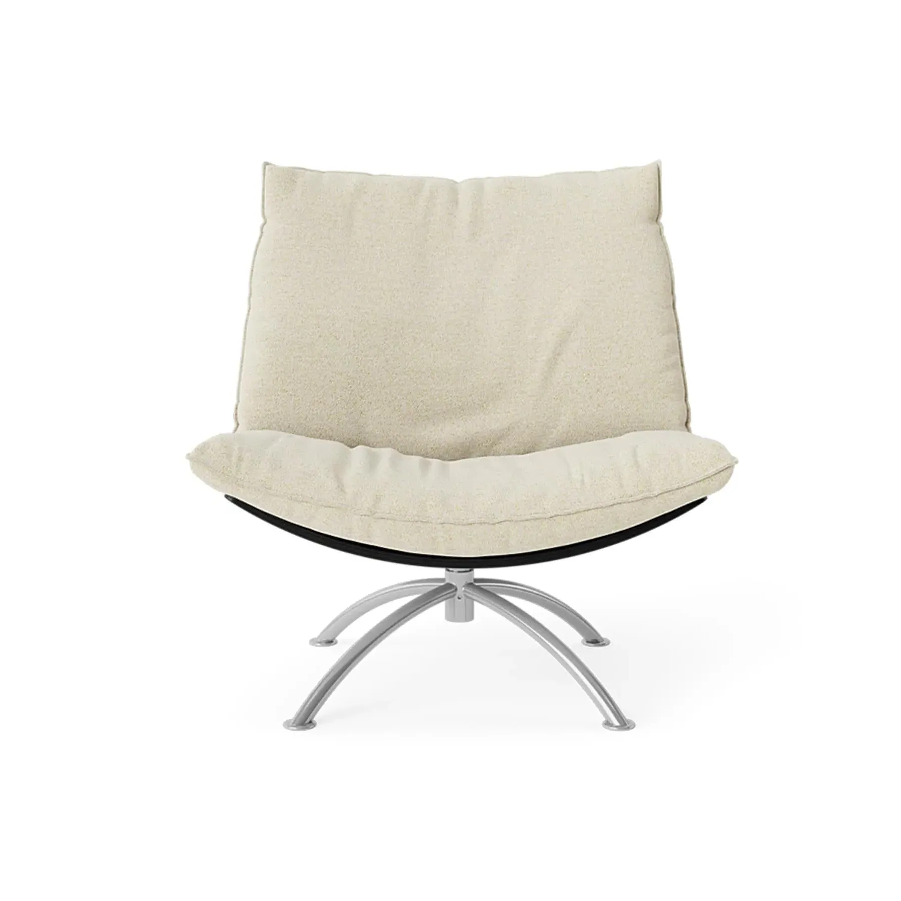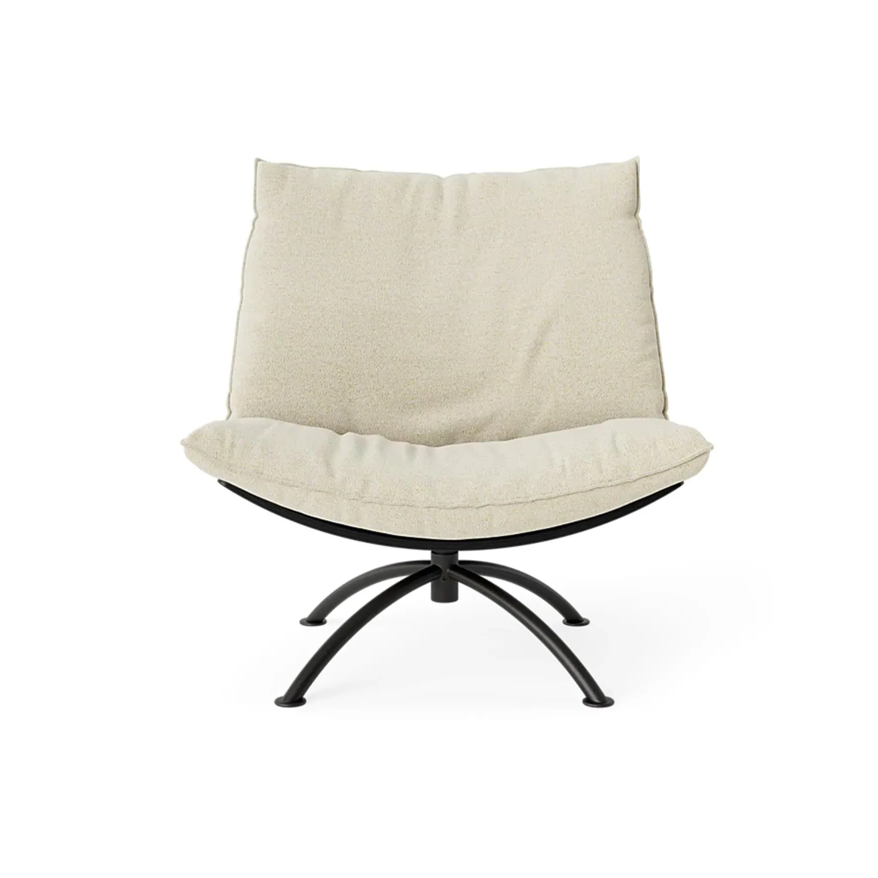 The armchair combines supportive seating with its cold foam and down-filled cushions, housed in a natural oak construction. Its swivel mechanism enhances functionality for various activities, while the boucle upholstery delivers comfort and visual interest. The black steel base provides sturdy support, and the sustainable wood materials champion environmental responsibility.