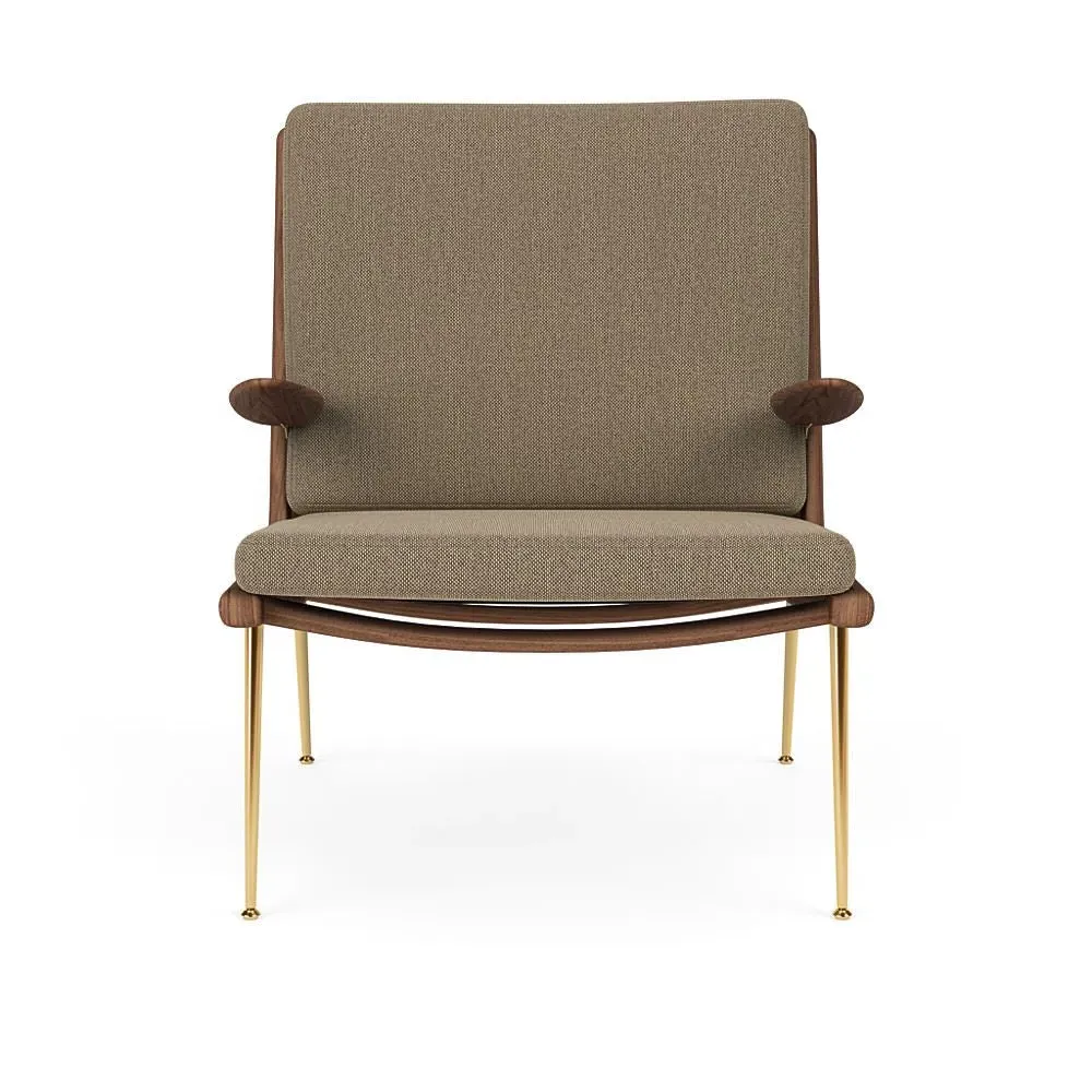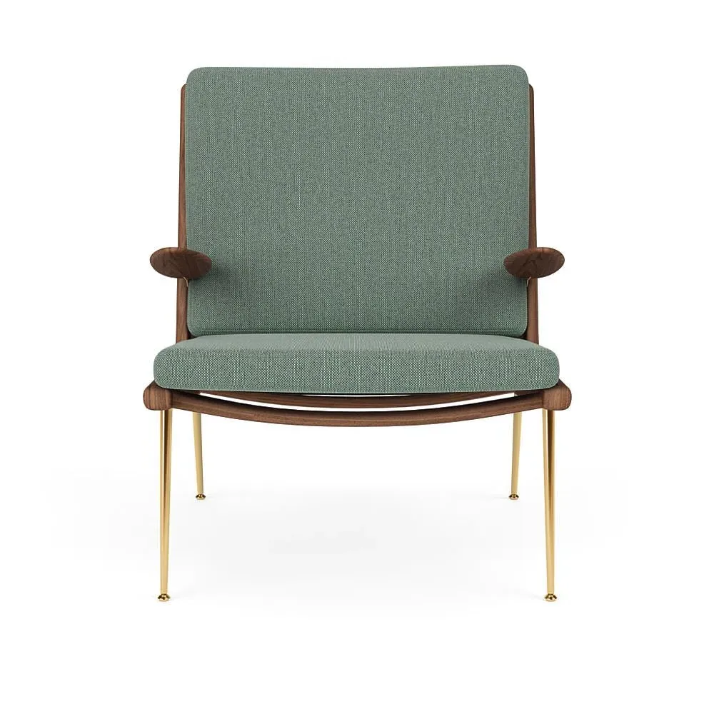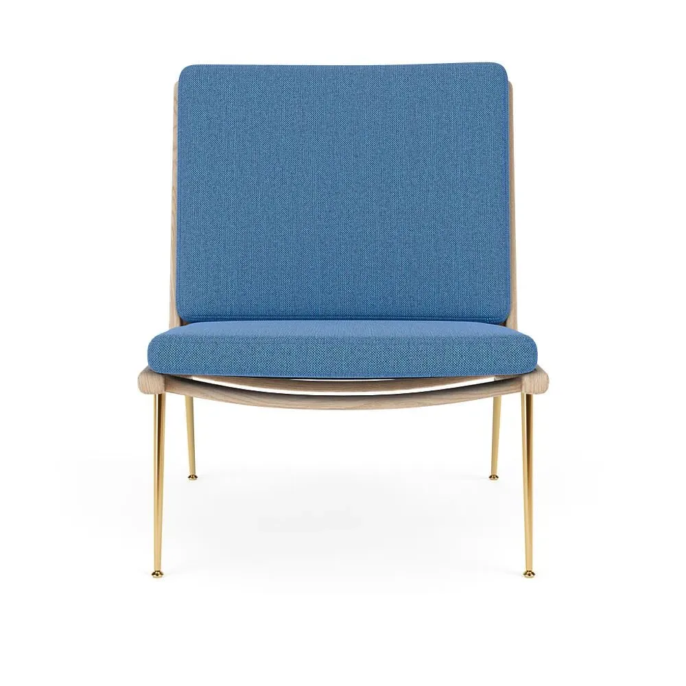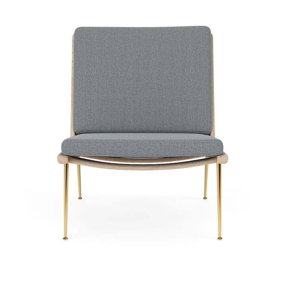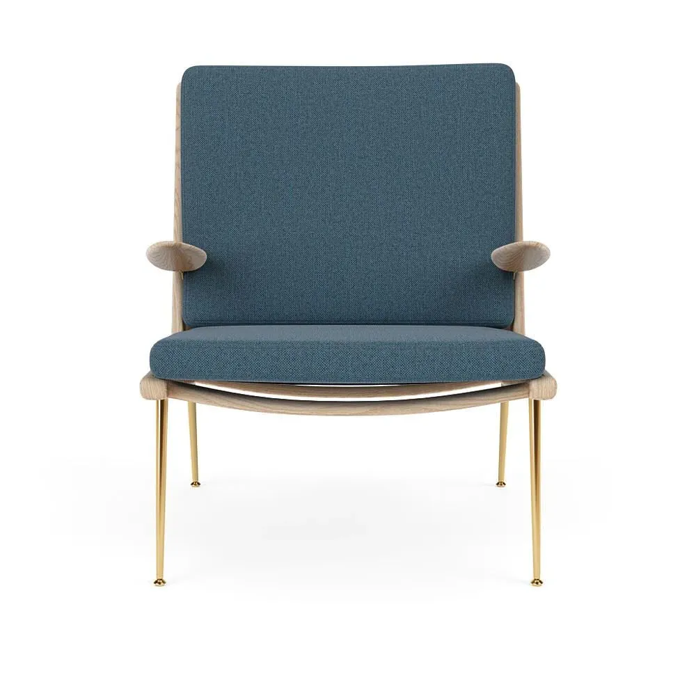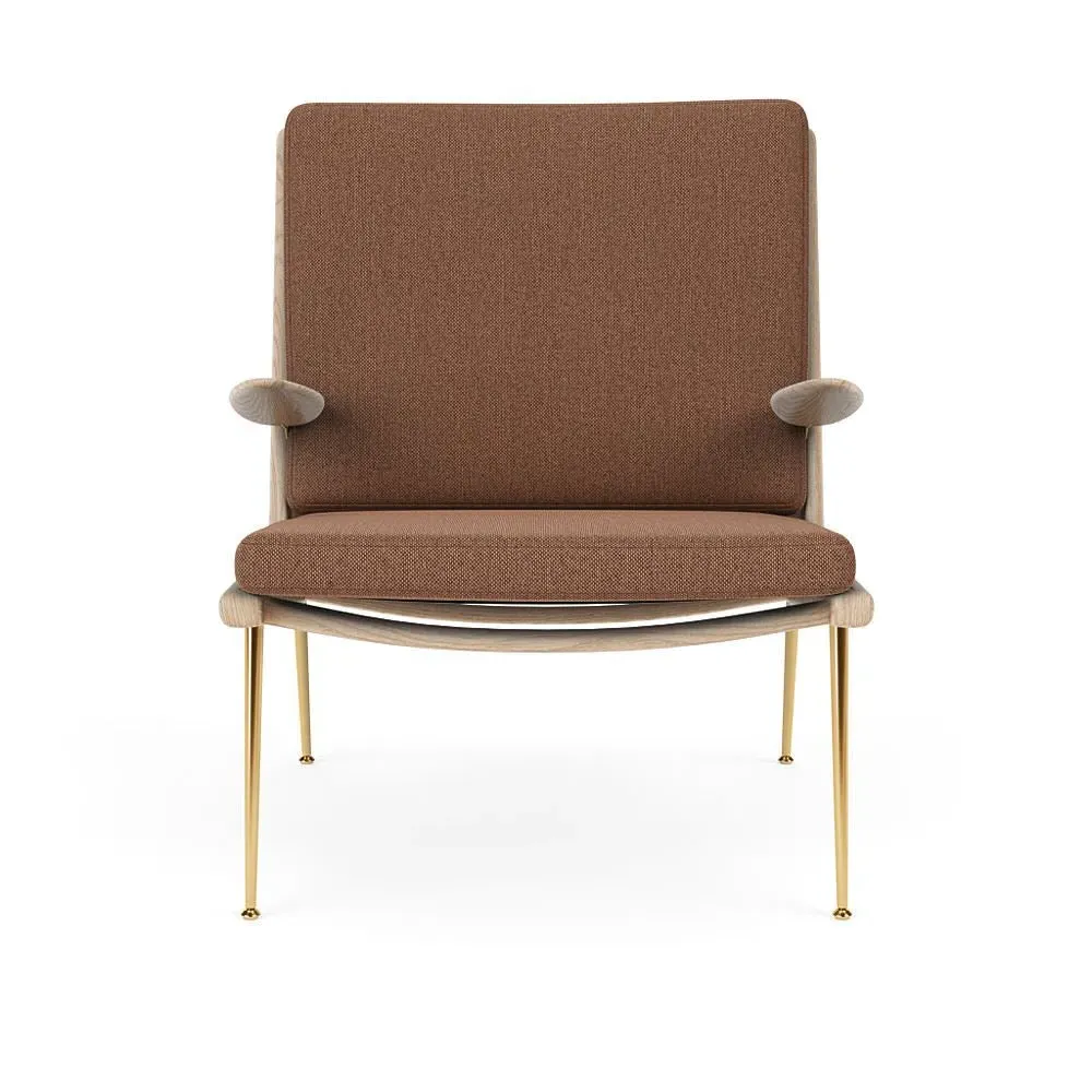 The Boomerang Lounge Chair combines handcrafted wooden construction with upholstered comfort, featuring a distinctive curved frame and slender brass base. Its upholstered seat and back provide relaxation support, while the oiled oak finish adds natural warmth. The streamlined design includes optional pointed armrests, and the Re-Wool 108 fabric offers sustainable comfort.