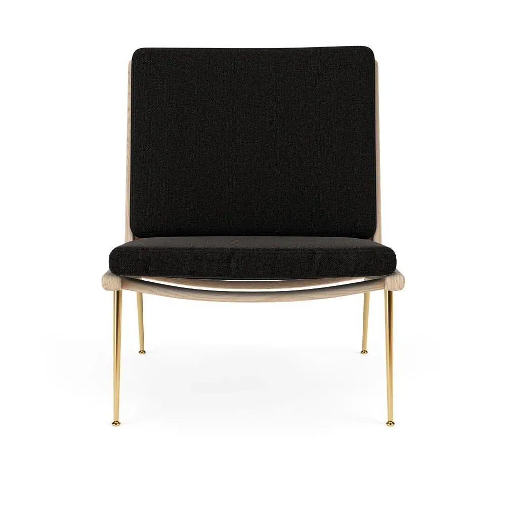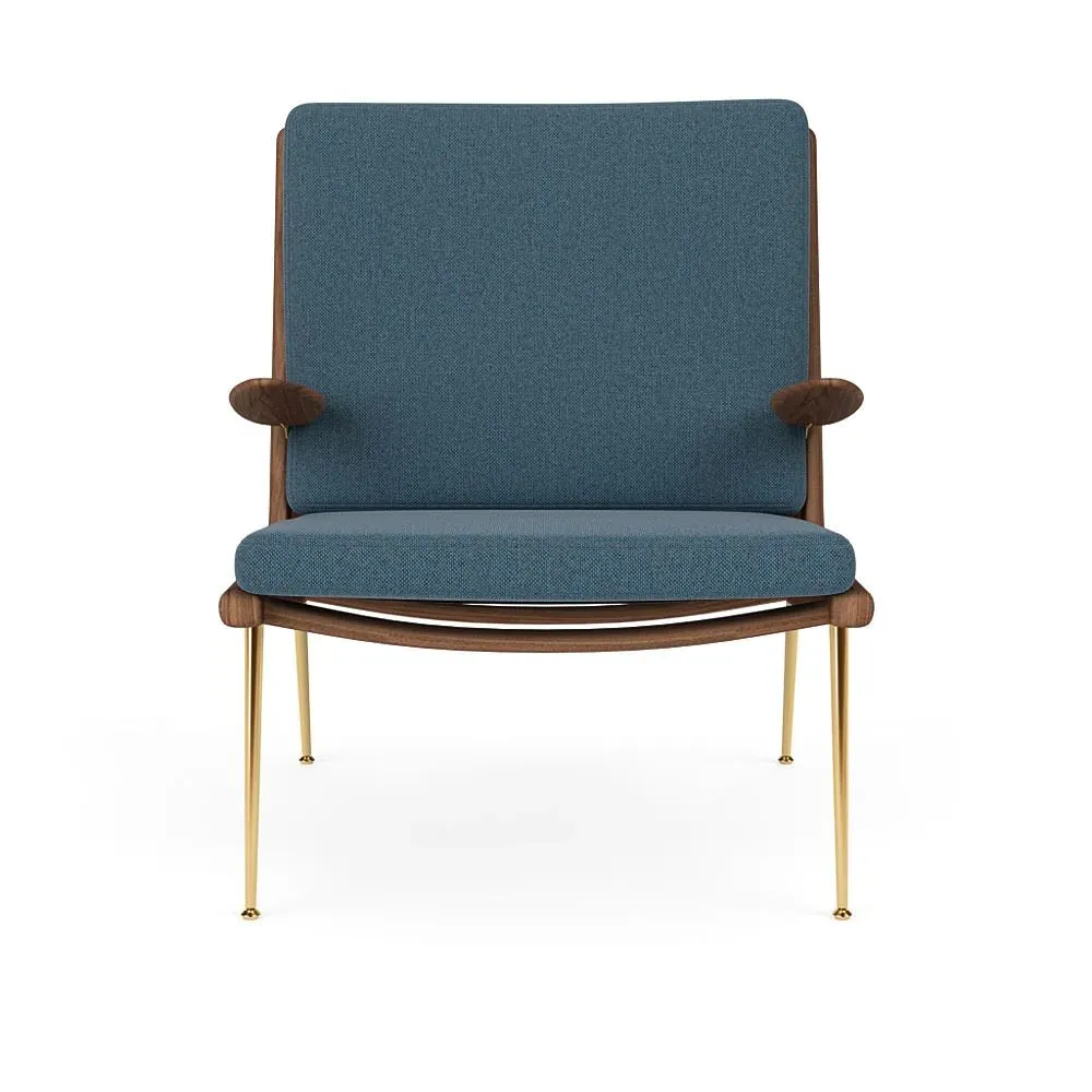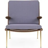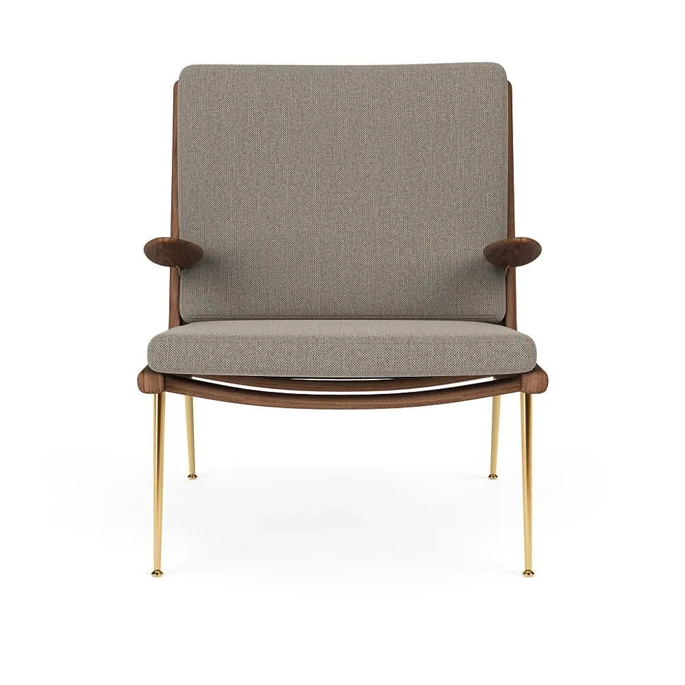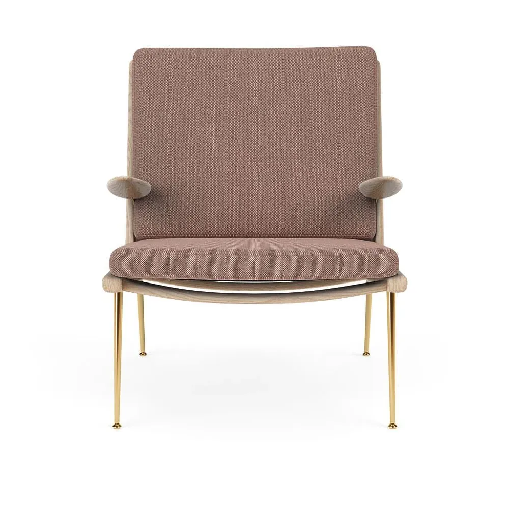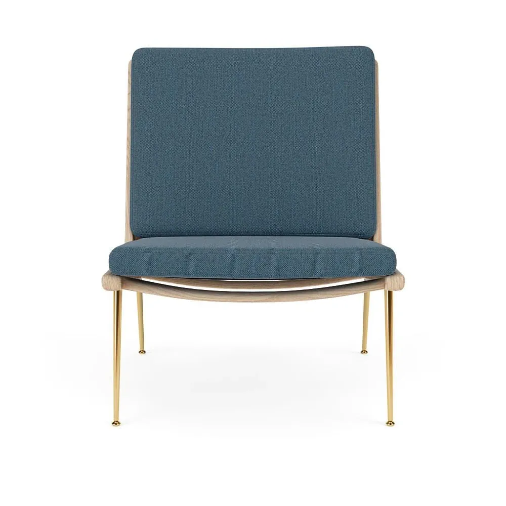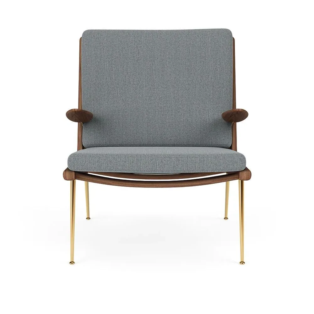 The Boomerang Lounge Chair combines handcrafted wooden construction with upholstered comfort, featuring a distinctive curved frame and slender brass base. Its upholstered seat and back provide relaxation support, while the oiled oak finish adds natural warmth. The streamlined design includes optional pointed armrests, and the Re-Wool 108 fabric offers sustainable comfort.
