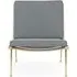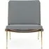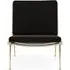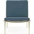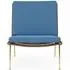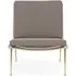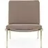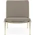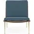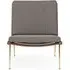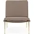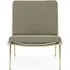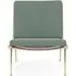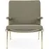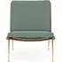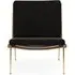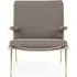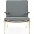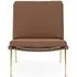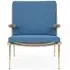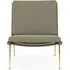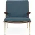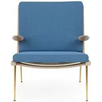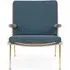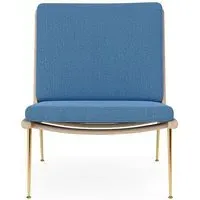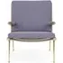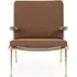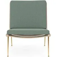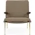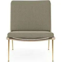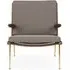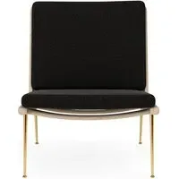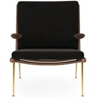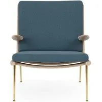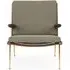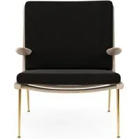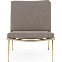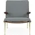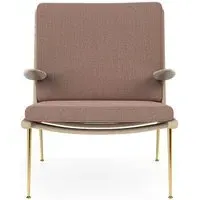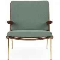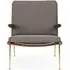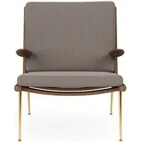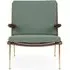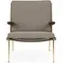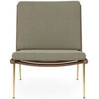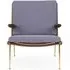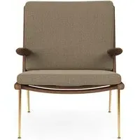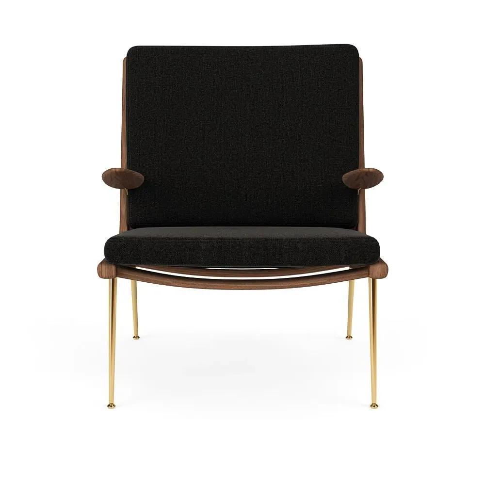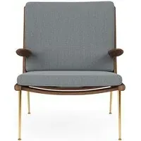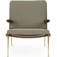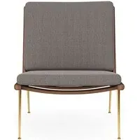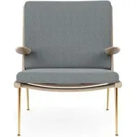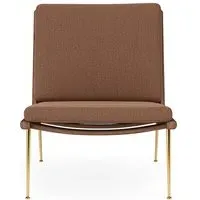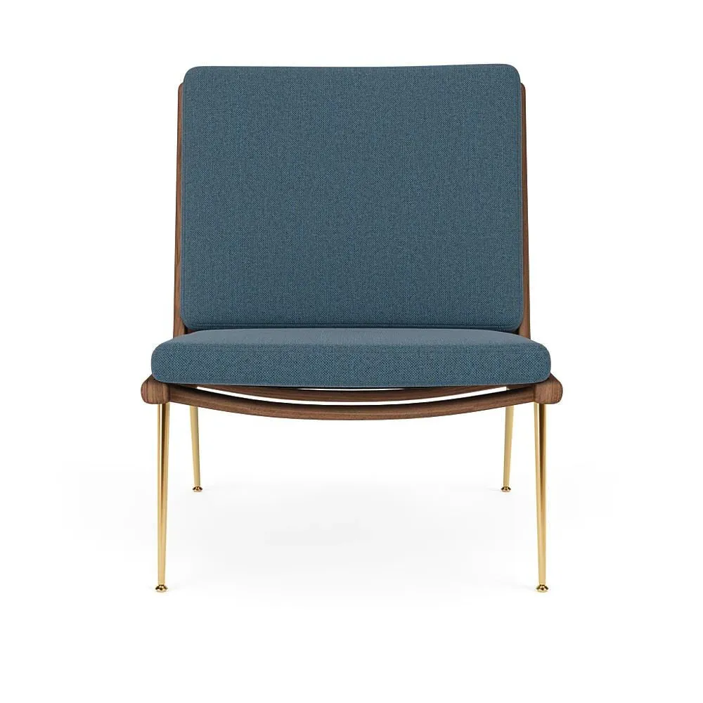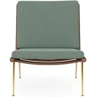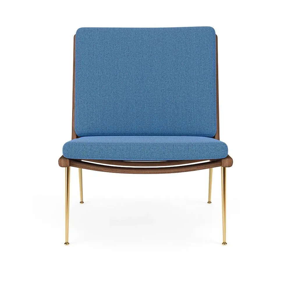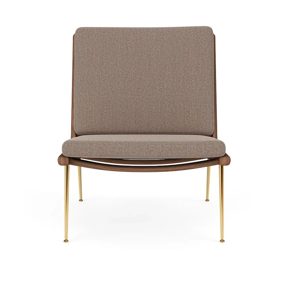 The Boomerang Lounge Chair combines handcrafted wooden construction with upholstered comfort, featuring a distinctive curved frame and slender brass base. Its upholstered seat and back provide relaxation support, while the oiled oak finish adds natural warmth. The streamlined design includes optional pointed armrests, and the Re-Wool 108 fabric offers sustainable comfort.