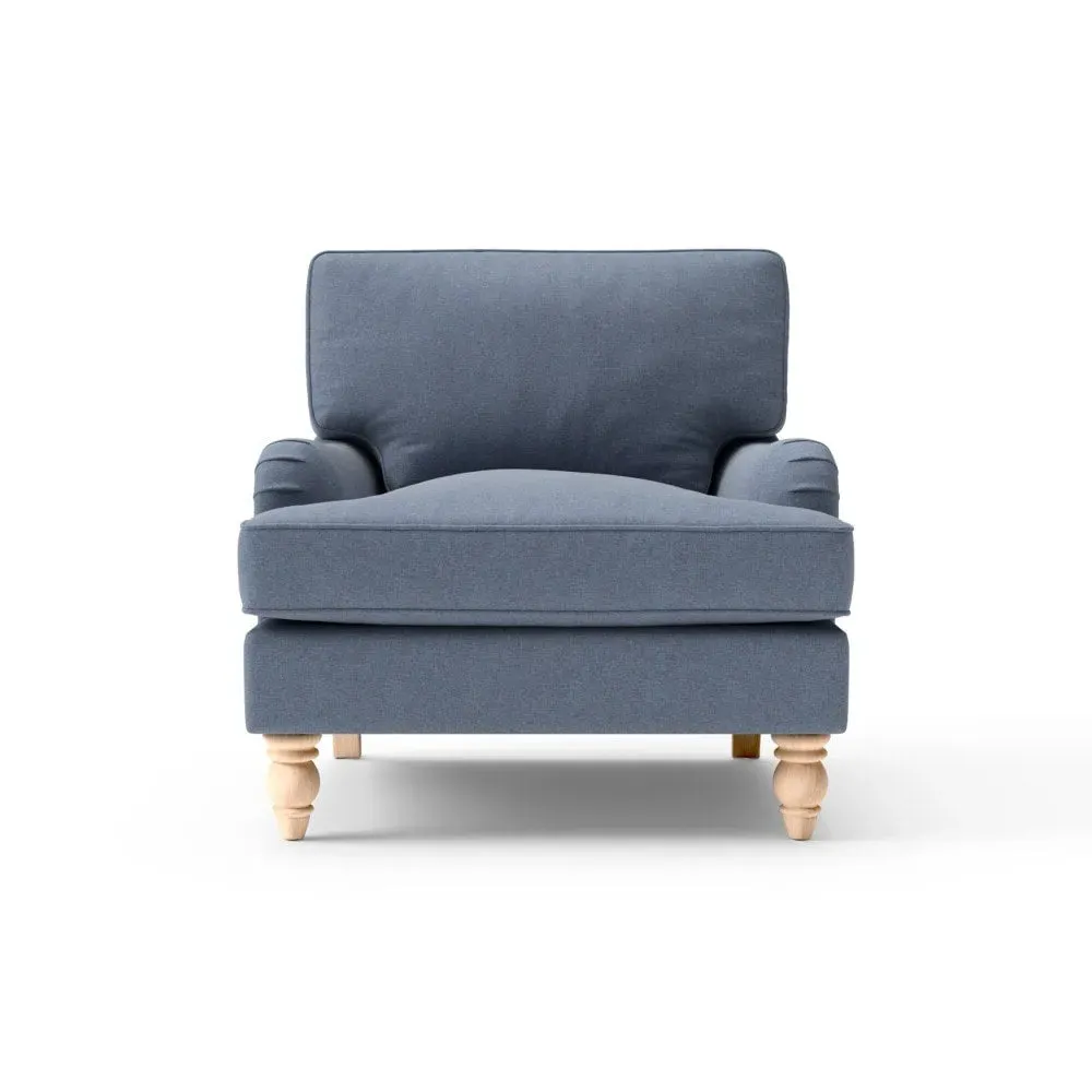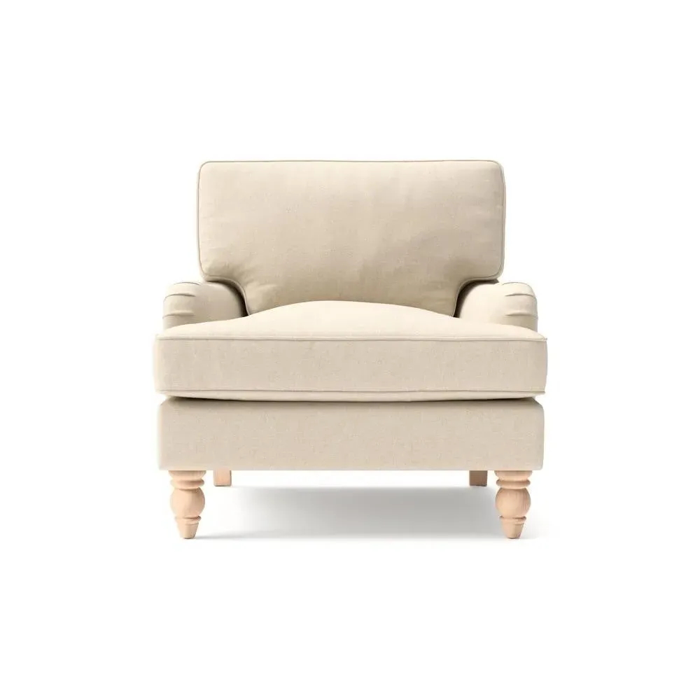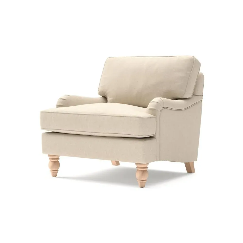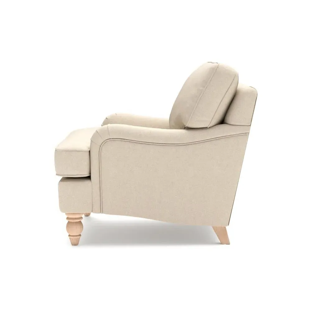 The armchair offers sink-in comfort with its low arms that accommodate stretching out with feet up. Its relaxed design features house linen mix upholstery, while the construction provides both luxurious feather and low maintenance interior options. The supportive frame ensures lasting durability for everyday use.