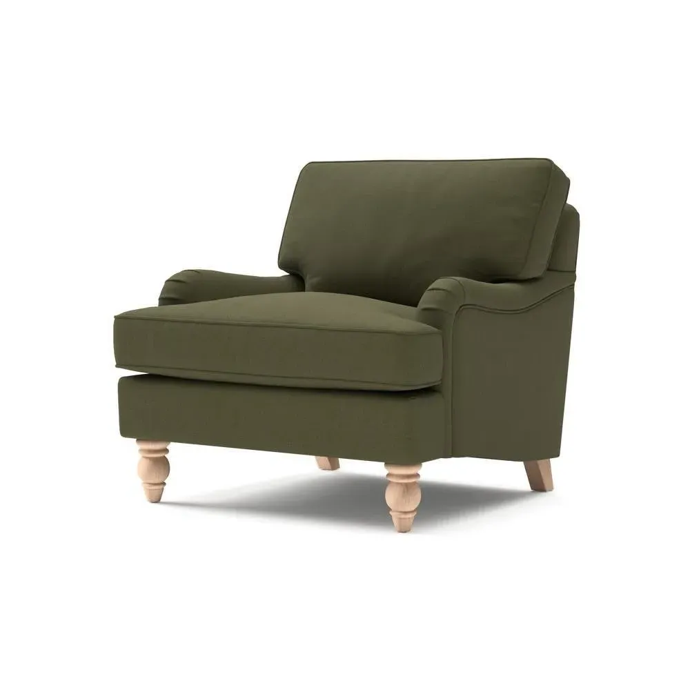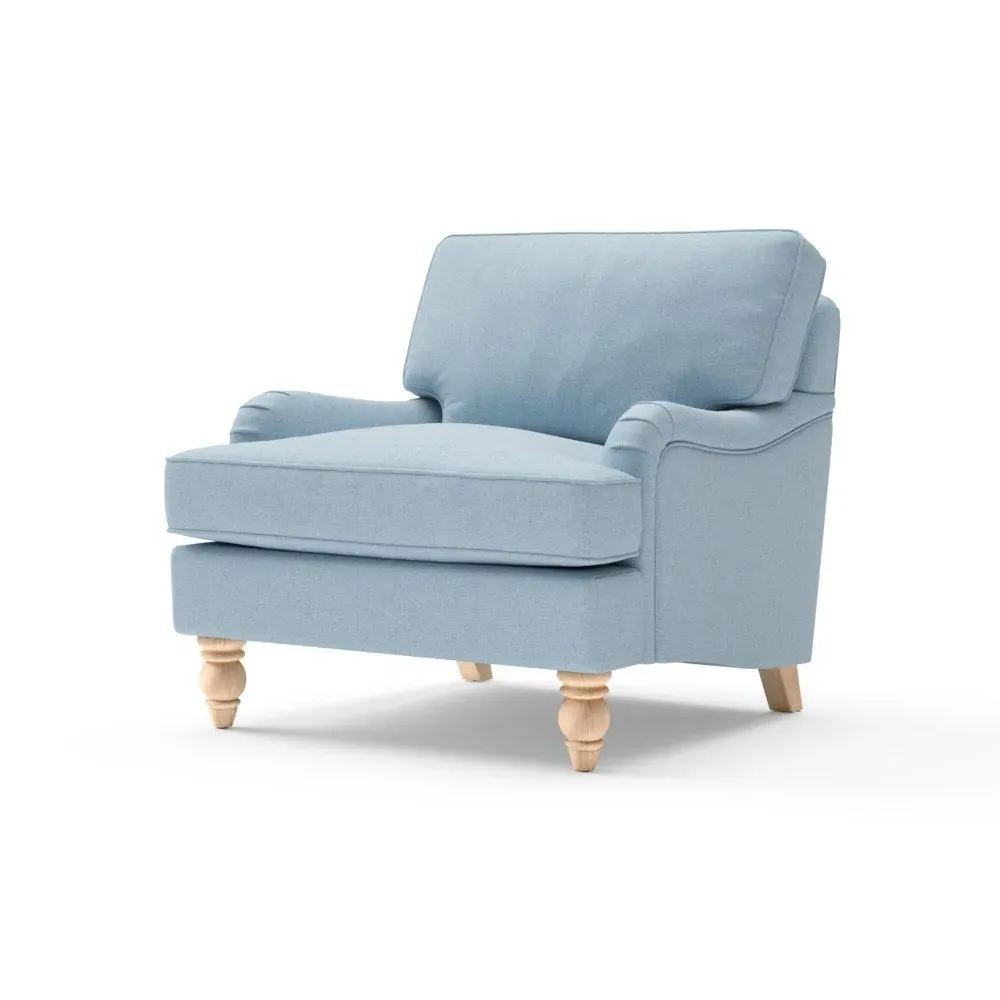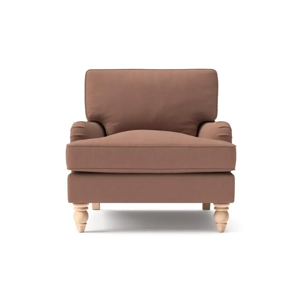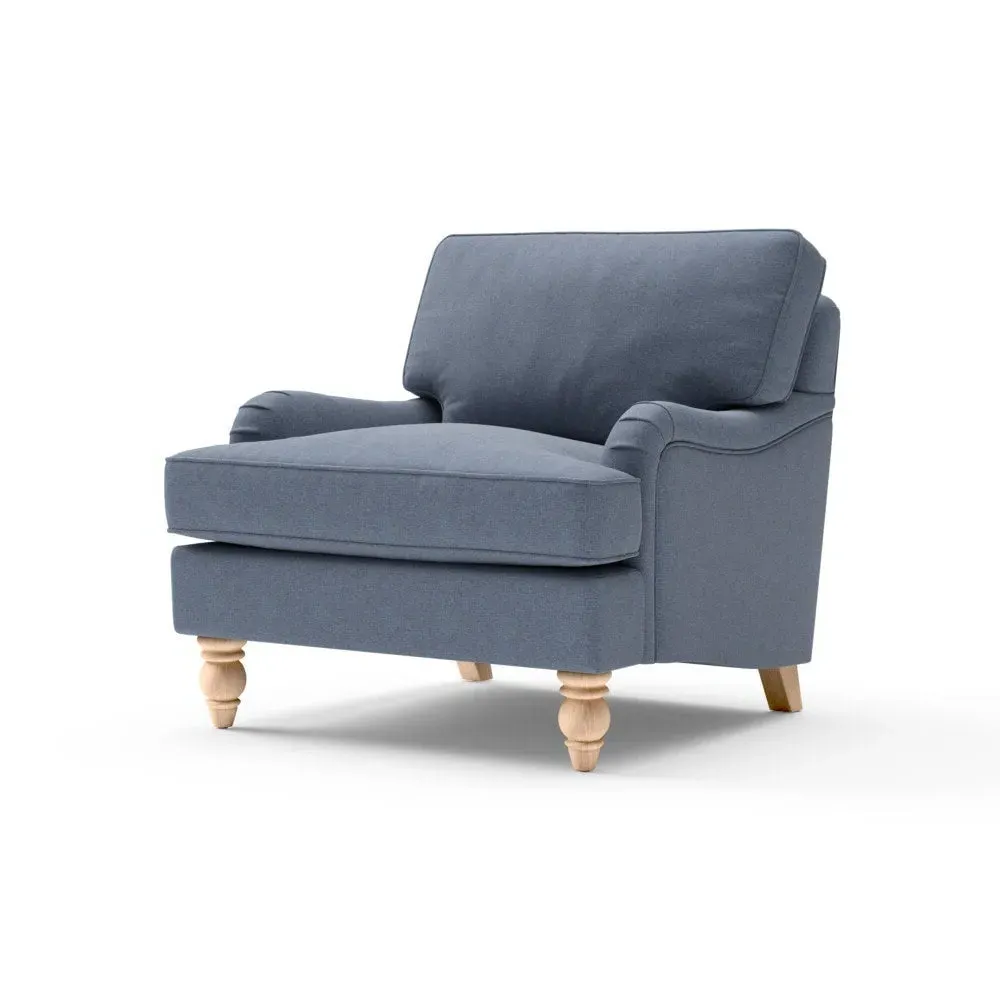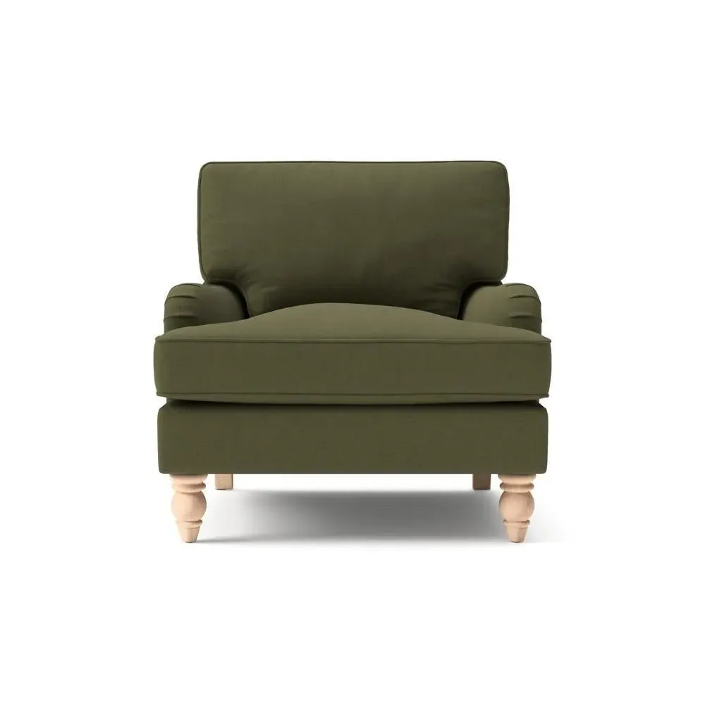 The armchair offers sink-in comfort with its low arms that accommodate stretching out with feet up. Its relaxed design features house linen mix upholstery, while the construction provides both luxurious feather and low maintenance interior options. The supportive frame ensures lasting durability for everyday use.