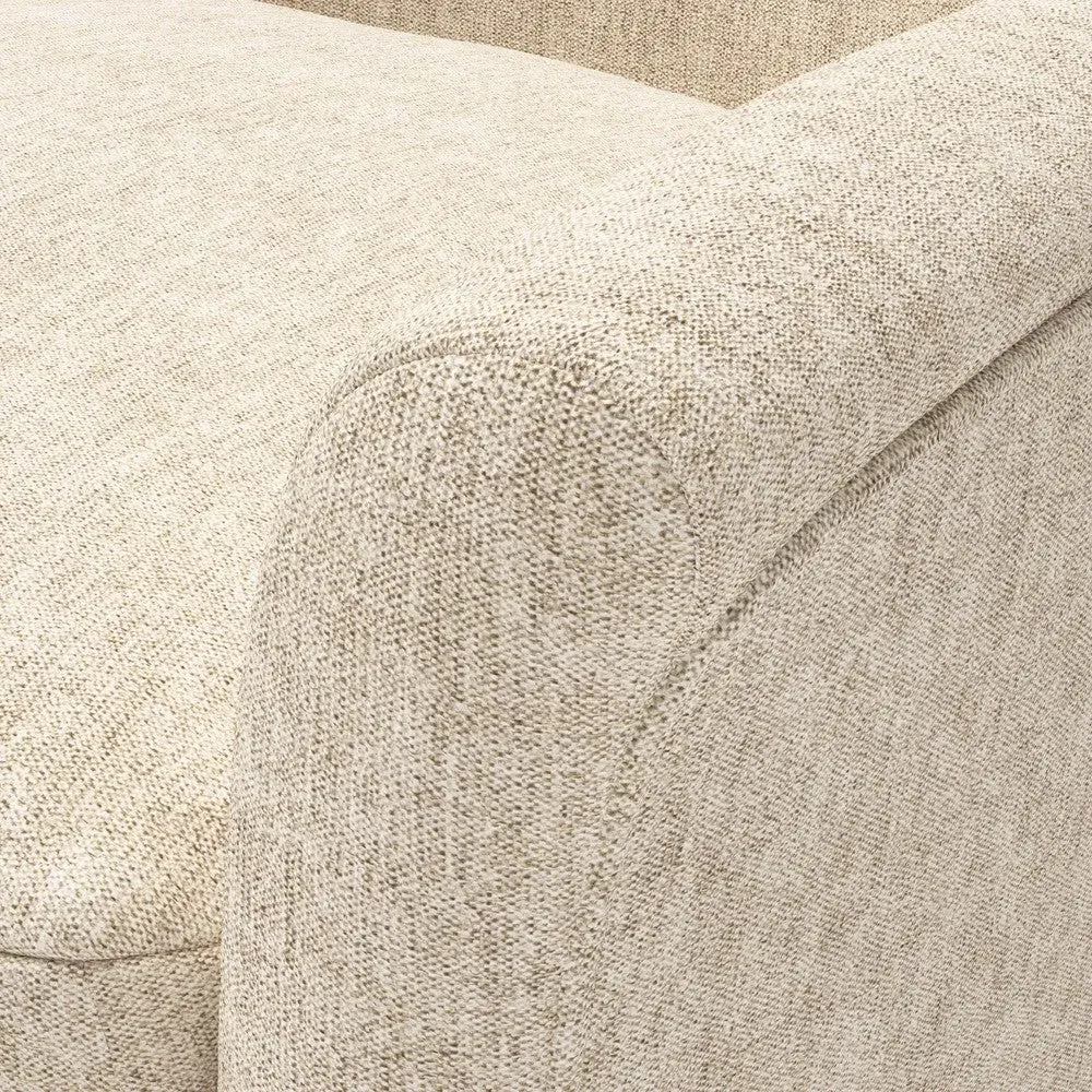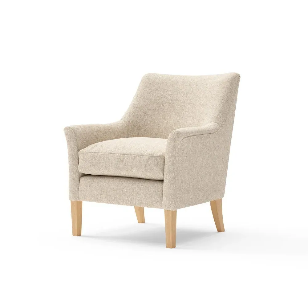 The armchair combines comfort with its supportive back and gently curved arms, accented by tapered legs. Its compact construction provides versatility for tighter corners, while the house weave fabric adds textural interest. The curved design enhances seating comfort, and the tapered legs ensure reliable stability.