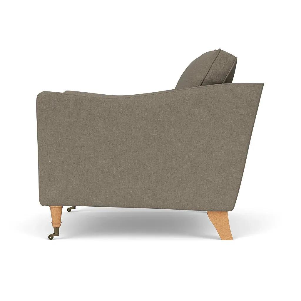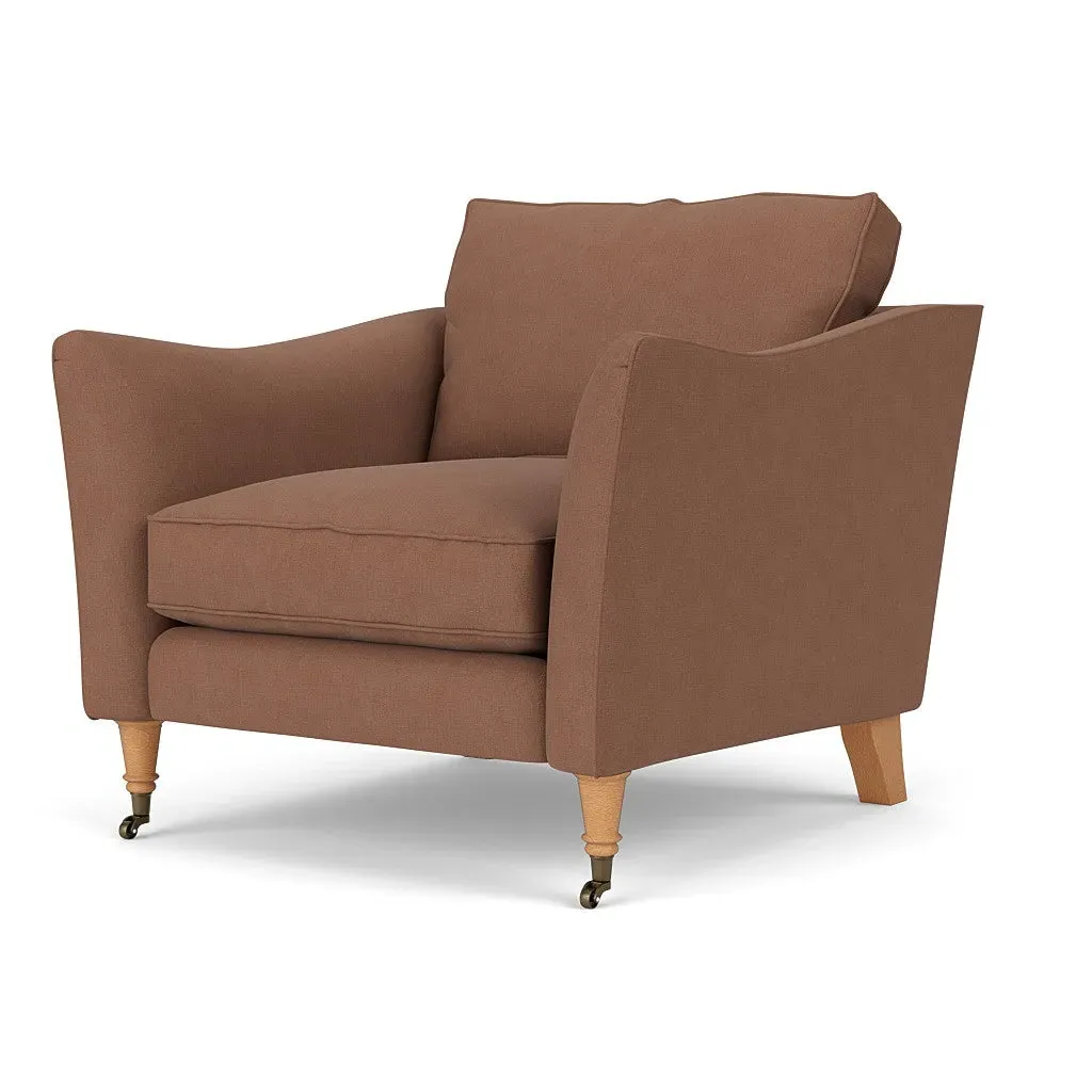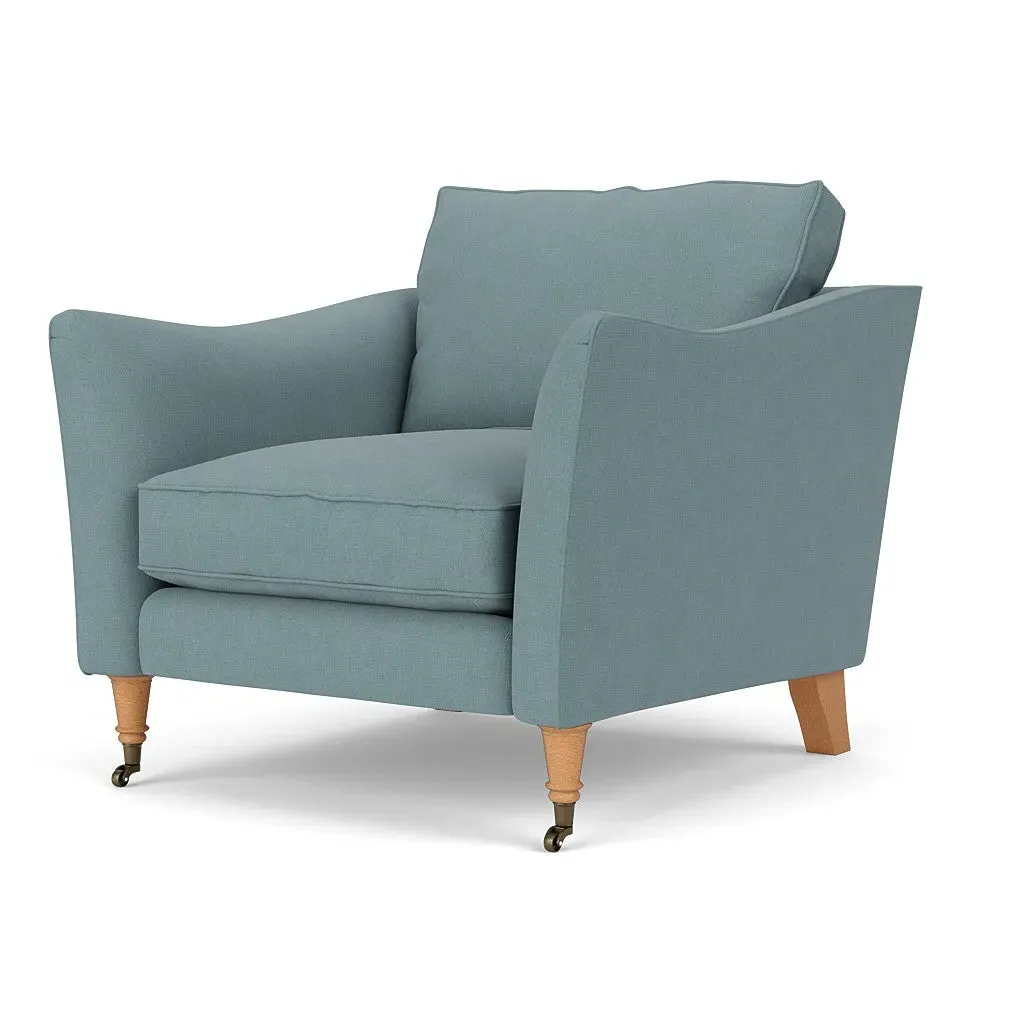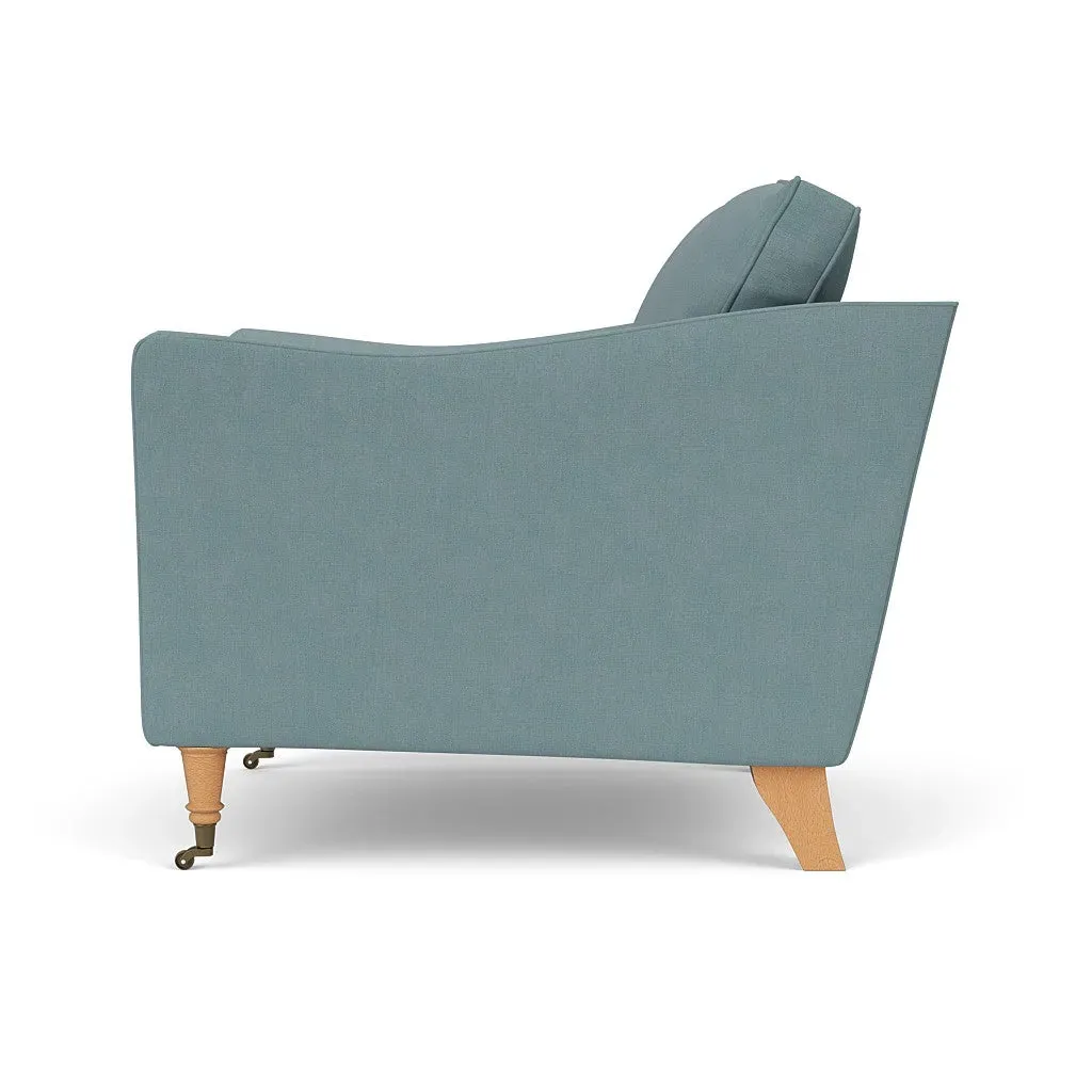 The armchair combines comfort with its high sculpted arms and deep generous seat. Its cushions feature piped edges for a tailored finish, while the castor legs provide mobility and complement various decor styles. Available with choice of feather or fibre fillings to suit your comfort preference.