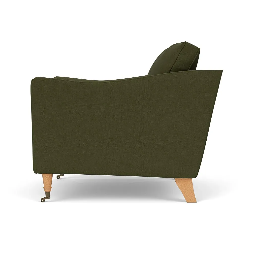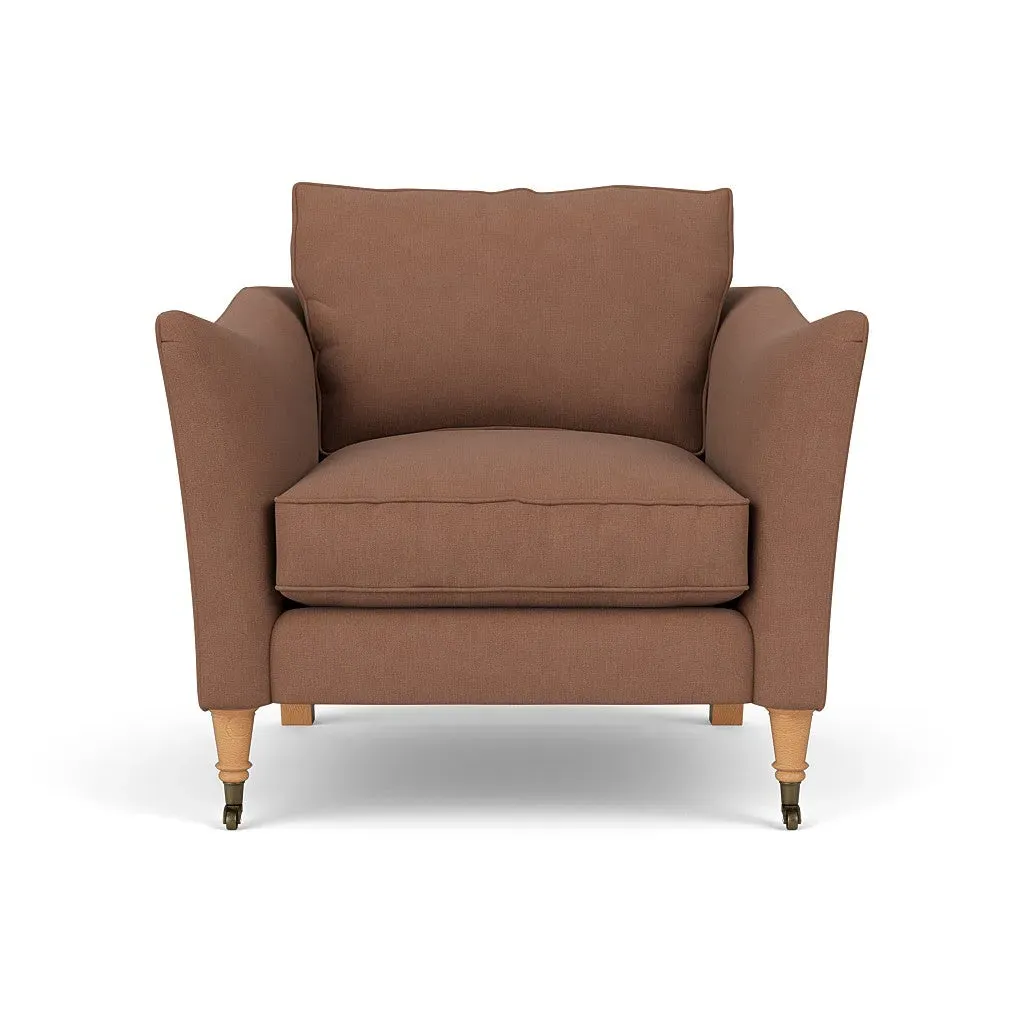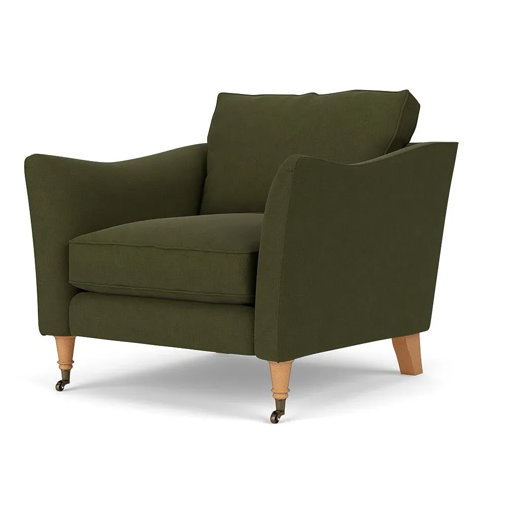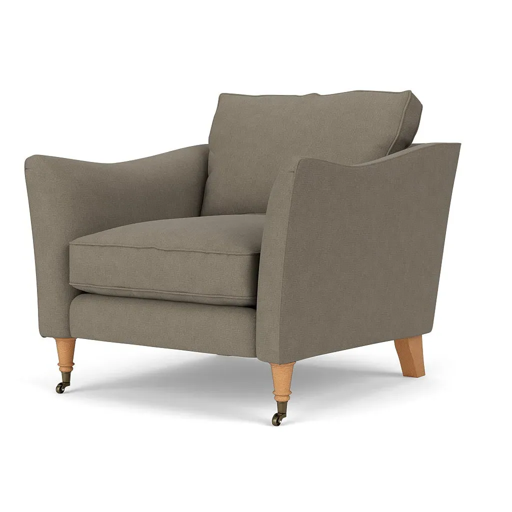 The armchair combines comfort with its high sculpted arms and deep generous seat. Its cushions feature piped edges for a tailored finish, while the castor legs provide mobility and complement various decor styles. Available with choice of feather or fibre fillings to suit your comfort preference.