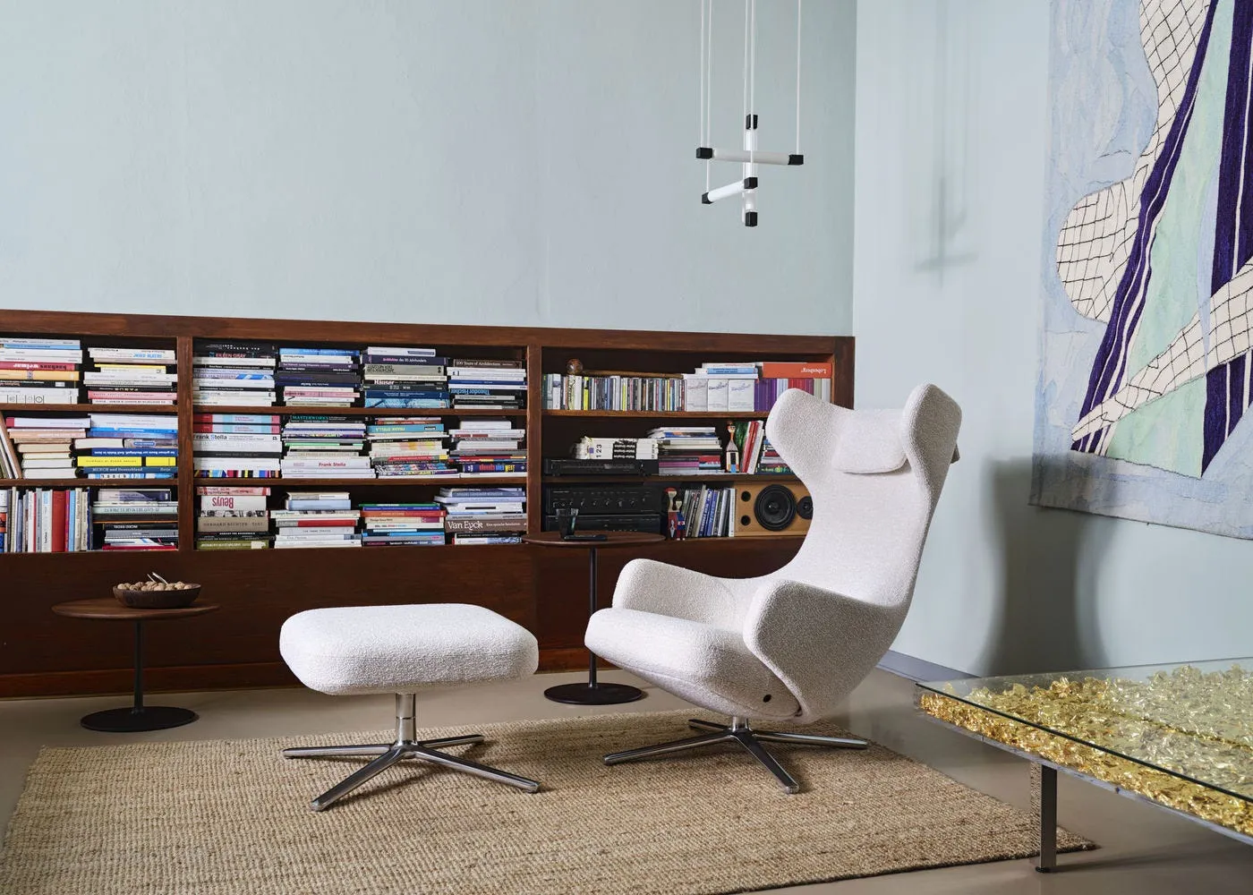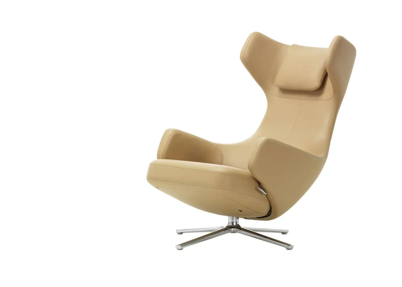 Jointly developed by Vitra and Antonio Citterio, the lounge chairs Grand Repos introduce a new level of comfort and flexibility to the home environment: with their generous padding, inviting armrests and high backrest, these elegant swivel-based lounge chairs impart an image of supreme comfort. Thanks to the synchronised mechanism concealed beneath the upholstery, sitters can move from an upright posture to a reclined angle for resting and lock the backrest in any position. The resistance of the backrest can be manually adjusted to the user's weight. This ensures great comfort and optimal spinal support across the entire range of movement.