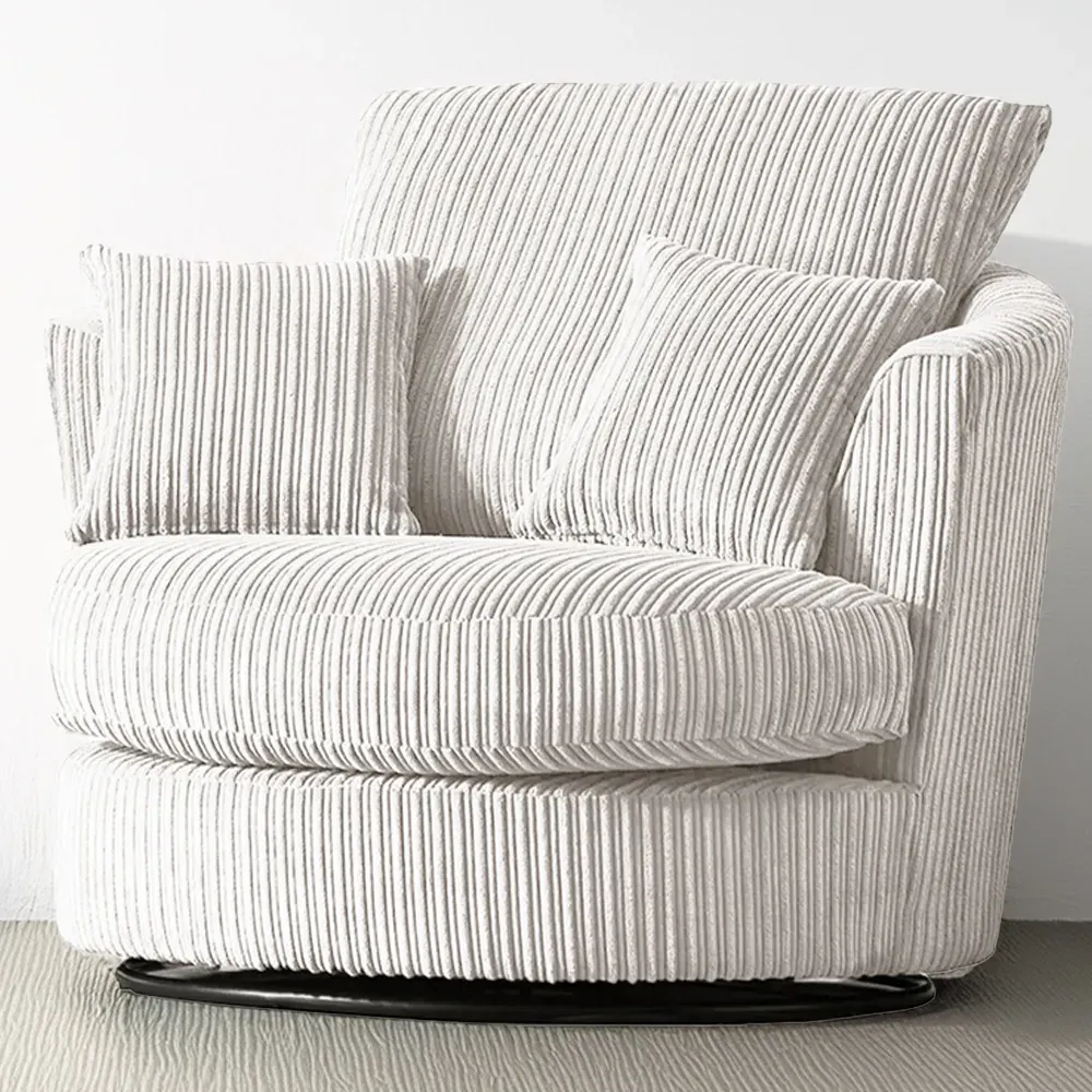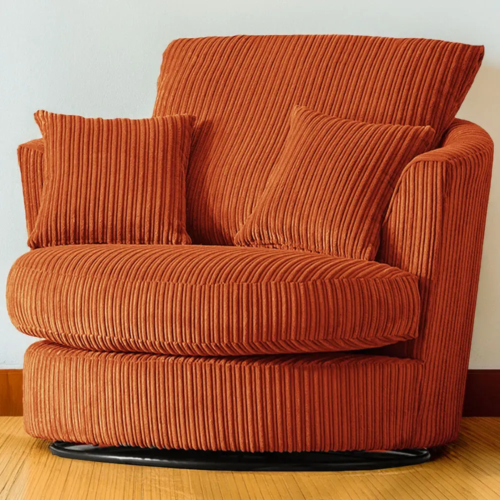 The swivel chair offers deep comfort with its foam and fibre cushions that are generously filled. Its soft jumbo cord fabric provides both comfort and durability, while the 360-degree rotation mechanism adds versatility. The deep-filled cushioning ensures lasting support for extended use.