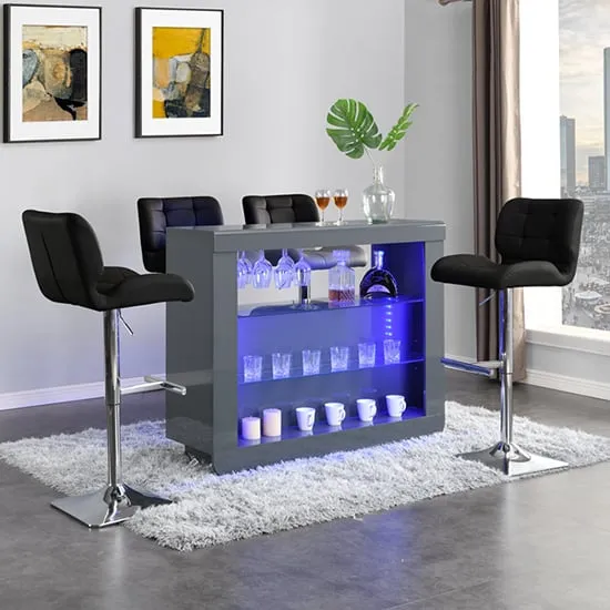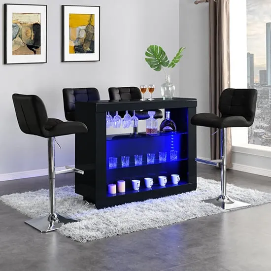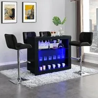 The Fiesta Bar Table offers rustic charm with its oak finish and integrated LED lighting. Its MDF construction provides durability while the glass shelves and holder add practical storage. The two Candid stools feature comfortable padded seats upholstered in black faux leather, with chrome bases and adjustable height mechanism for added comfort. The compact design suits smaller spaces while maintaining functionality through high-quality materials. Table: W125 x D38 x H100 cm, Stools: W44.5 x D51 x H88-109 cm.