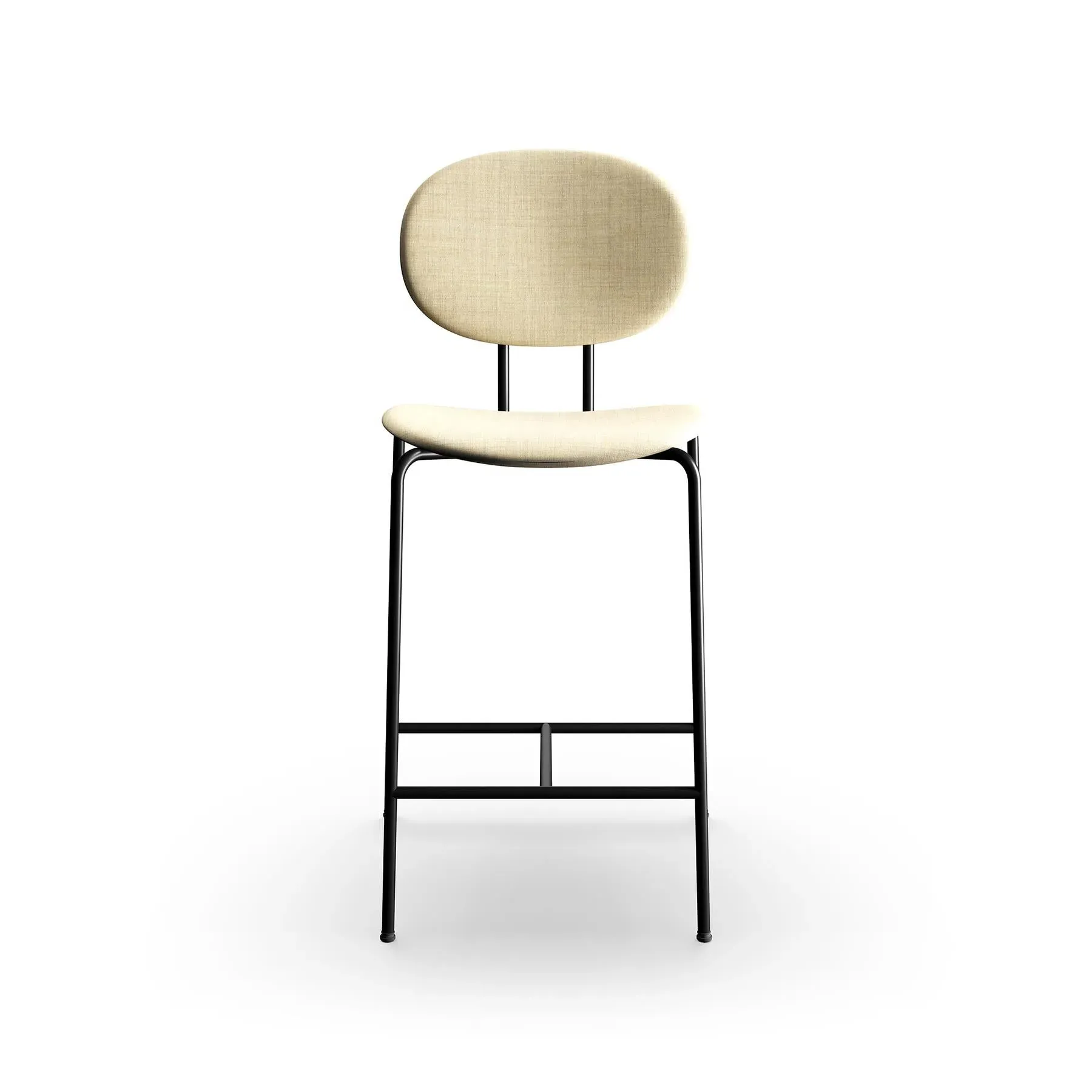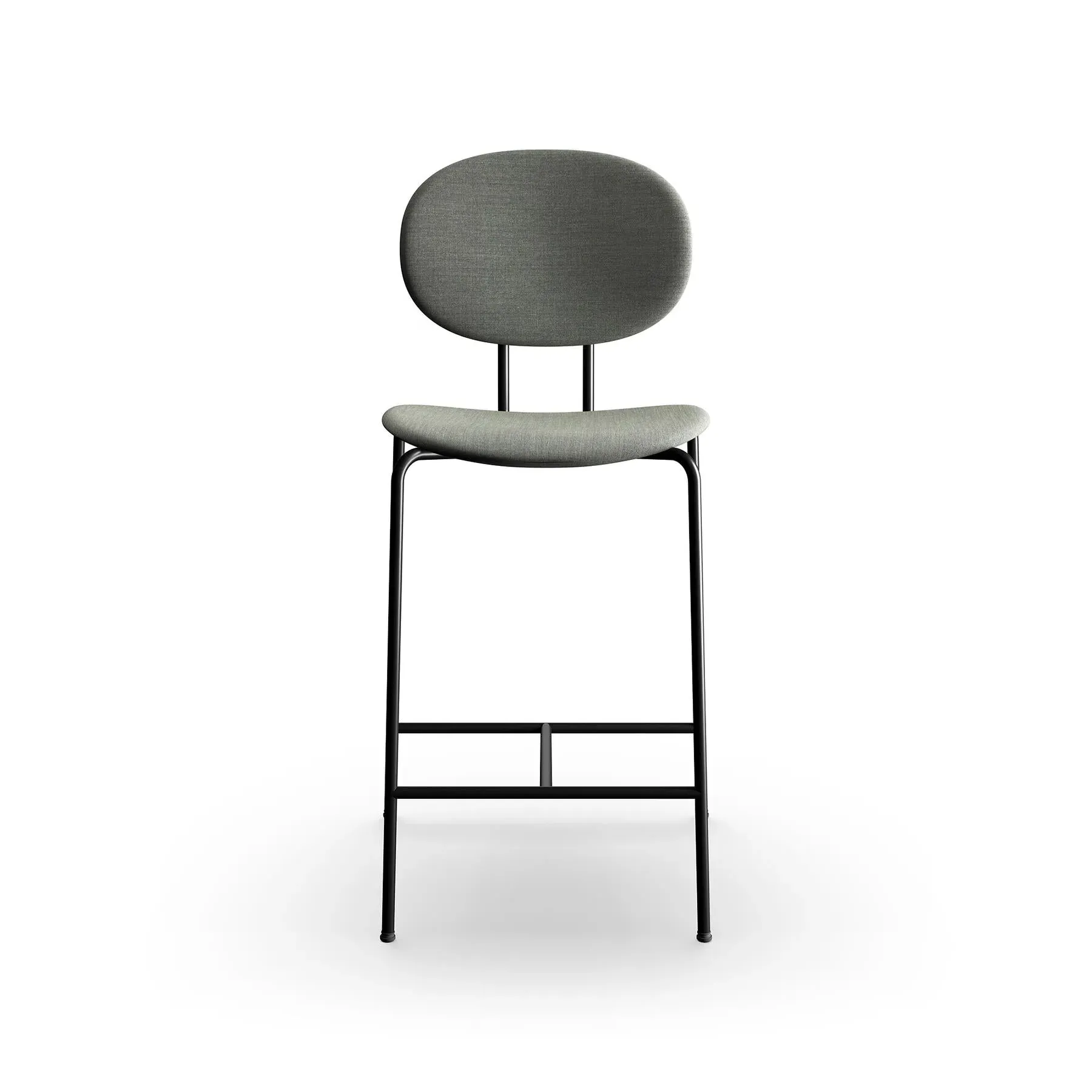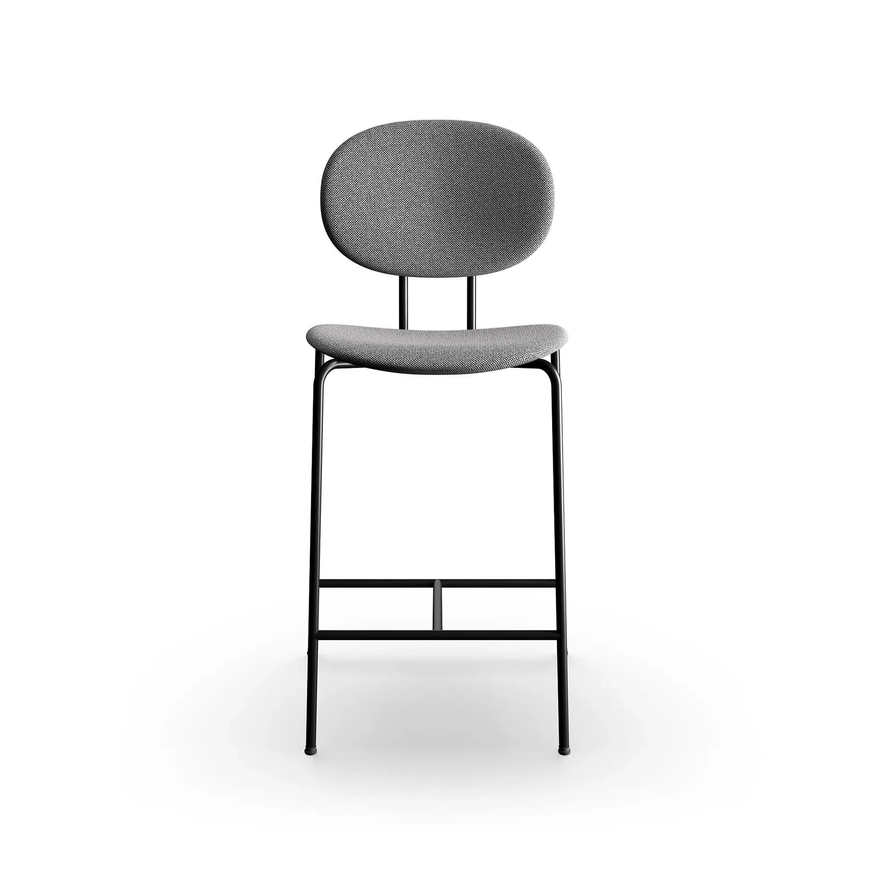 The bar stool combines Danish design heritage with its distinctive super-ellipse shape, featuring Remix 612 fabric upholstery. Its black steel frame provides sturdy support, while the upholstered seat offers comfort during extended use. The 65cm height suits standard bar counters, and the steel base ensures stability and durability.