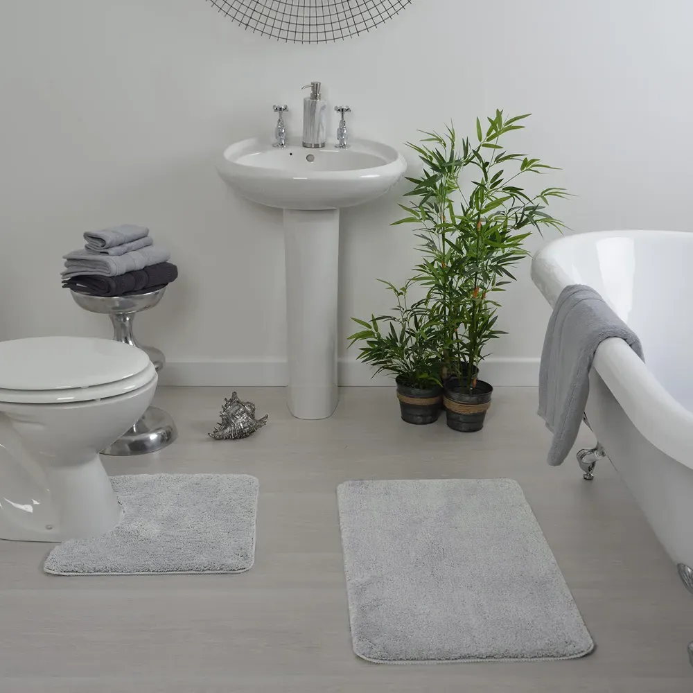 The microfibre pedestal mat offers deep pile comfort with its extra soft polyester construction. Its microfibre material provides superior absorption that exceeds most natural fibres, while the non-slip backing keeps the mat firmly in place. The shiny polyester fibres create a soft feel underfoot, and the secure grip ensures safety during use. W50 x D50 cm.