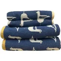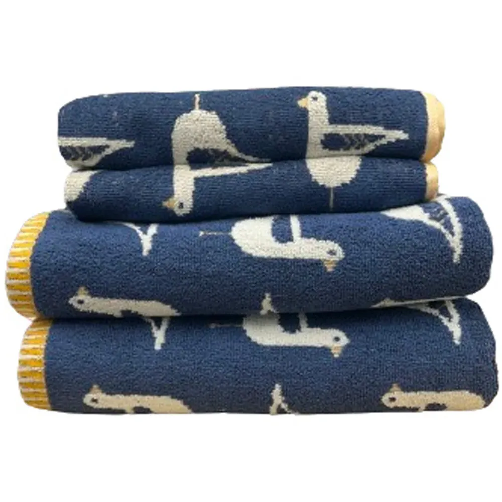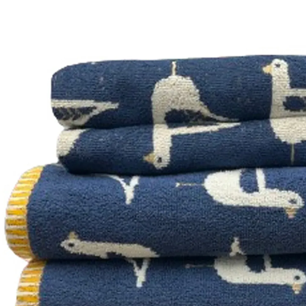The Sea Gull Bath Towel combines absorbency with decorative appeal through its 100% Turkish cotton weave. Its white seagull motif creates visual contrast, while the yellow and white border complements the design. The machine-washable construction provides convenient care and maintains fabric quality.