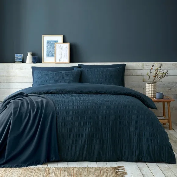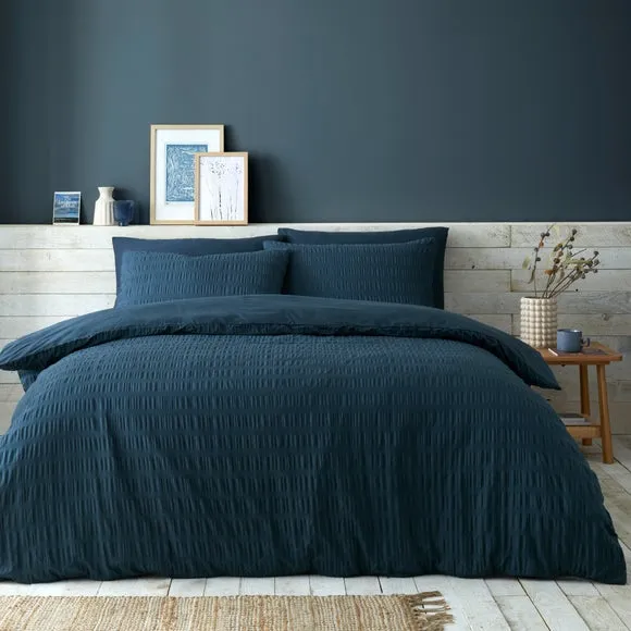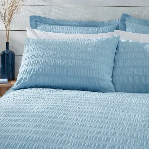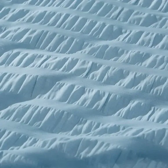 The duvet cover set offers textured comfort with its soothing seersucker weave, crafted from 100% cotton for natural breathability. The tactile surface adds visual interest while maintaining softness against the skin. Machine washable construction ensures easy care, and the OEKO-TEX certification confirms safe, sustainable manufacturing processes.