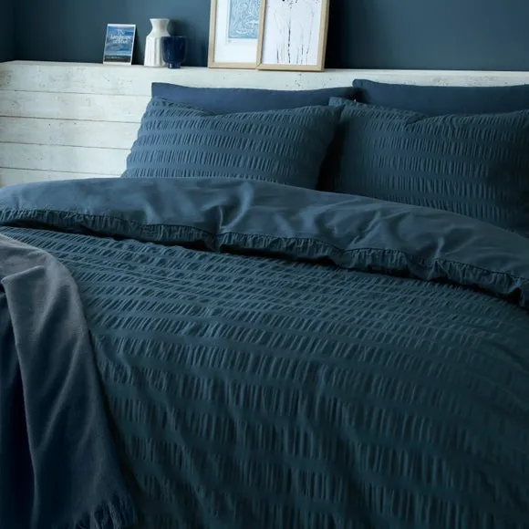 * Duvet and Pillowcase set* Soothing, textured design* Crafted from 100% Cotton* Machine Washable Introduce sophistication to your space with our Aria seersucker duvet set, blending comfort and style for a luxurious touch. The tactile seersucker texture adds visual interest, while the cotton composition ensures breathability for a cozy sleep. Transform your bedroom into a haven of relaxation and style. This collection is verified by OEKO-TEX and independently tested for harmful substances as well as manufactured using sustainable processes under socially responsible working conditions. MADE IN GREEN by OEKO-TEX is a unique product label to trace the countries and production facilities - search the product label for more information.