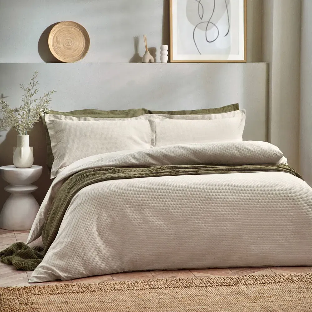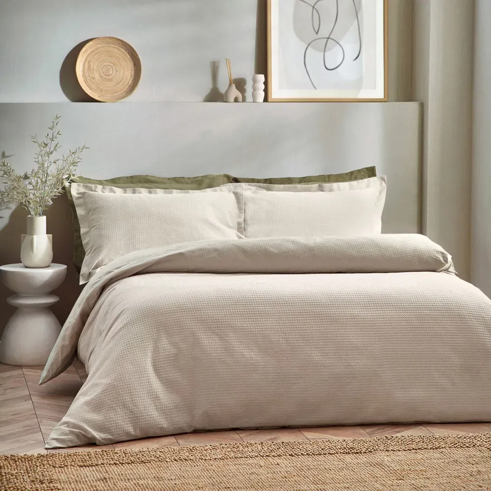 The Yard Double Waffle Duvet Set features a unique 3D waffle weave design created from soft, durable cotton fabric. Its Oxford border finish provides a refined appearance, while the large surface area ensures comprehensive coverage. The breathable construction maintains comfort throughout the year, offering cosiness in cold weather and breathability in warmth.