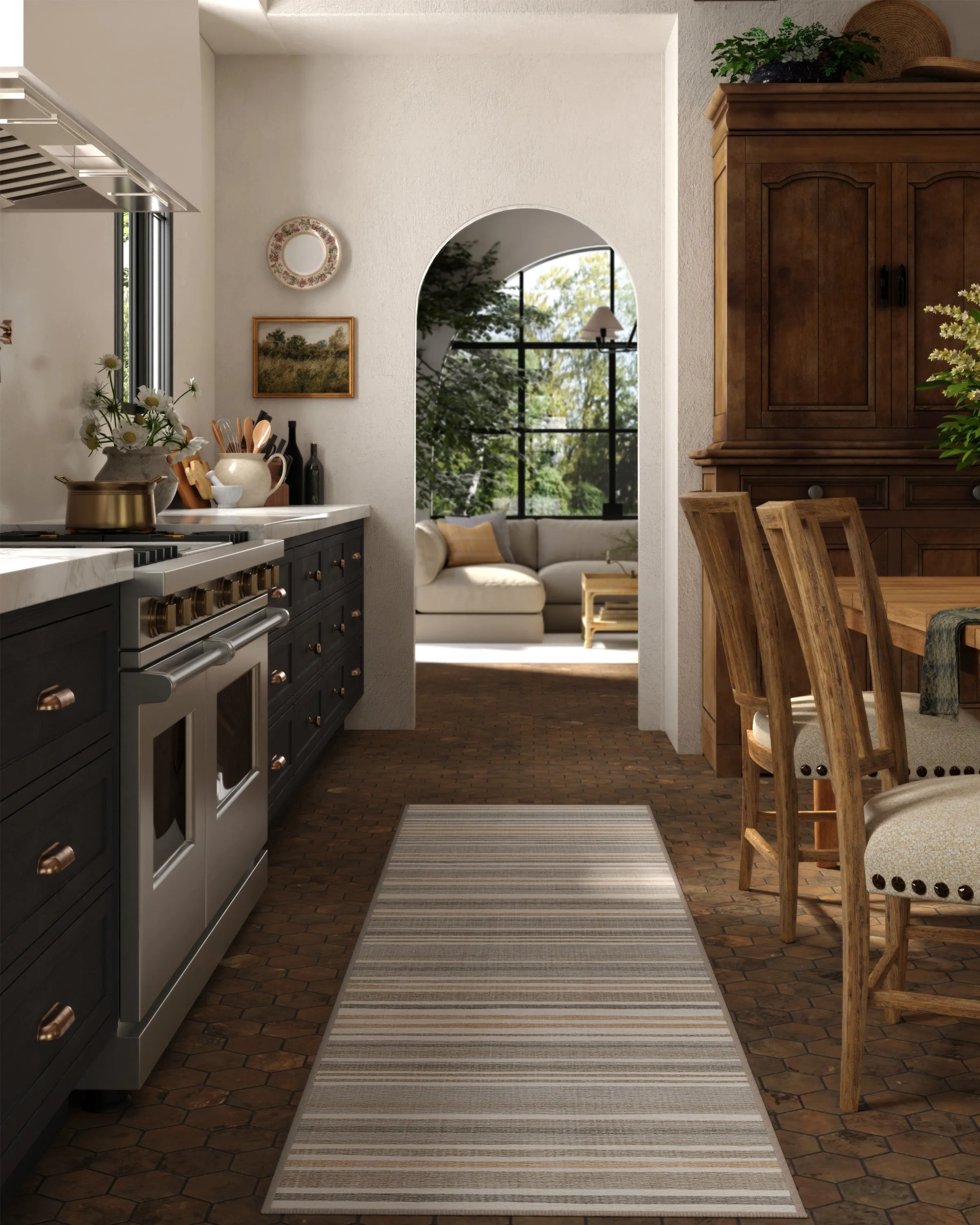 The area rug features horizontal neutral stripes with organic linework in warm taupes, greys, and beige tones. Its flatwoven construction provides durability, while the machine-washable design offers easy maintenance. The water-resistant and stain-resistant properties make it suitable for high-traffic areas, and the neutral palette complements various decor styles. W60 x D90 cm.