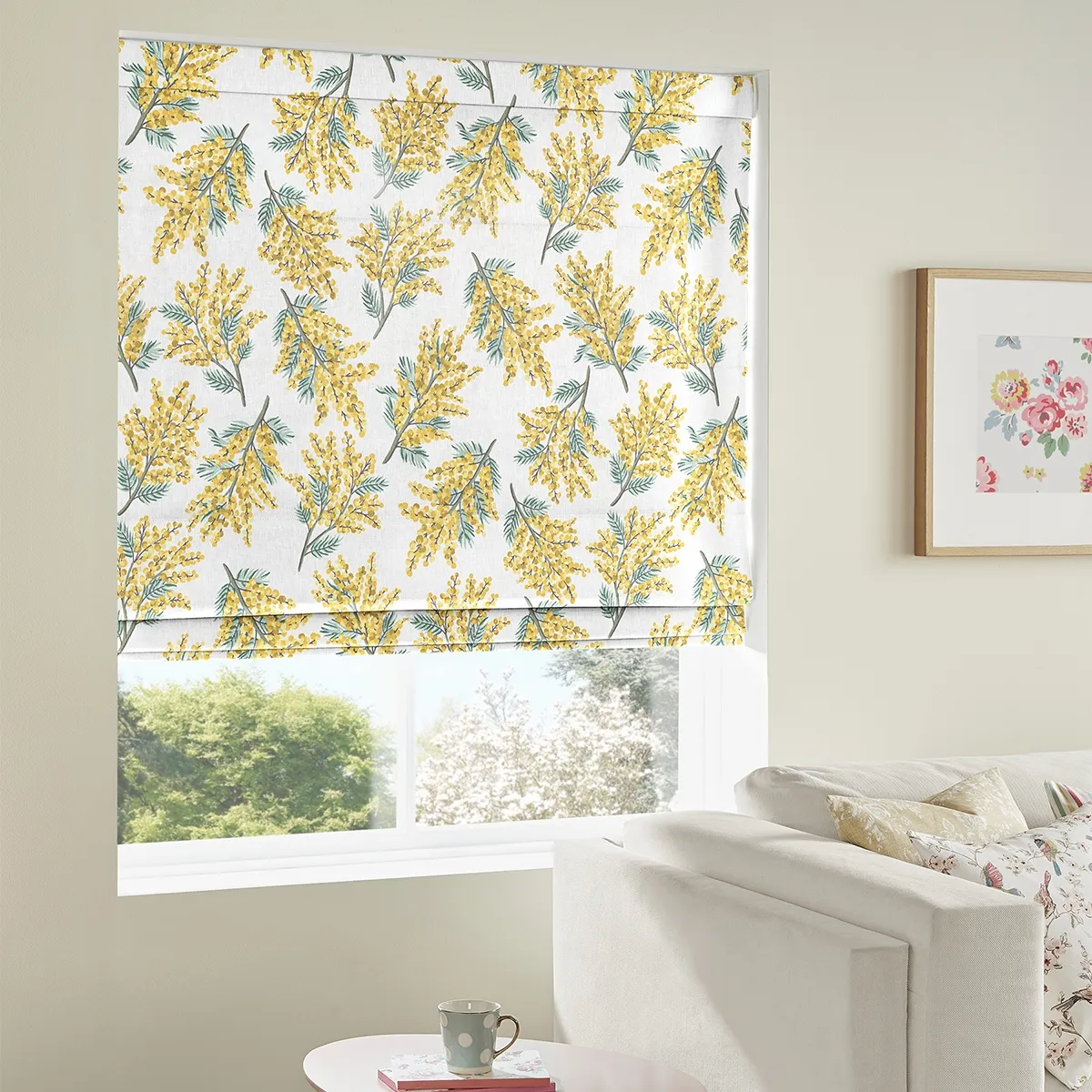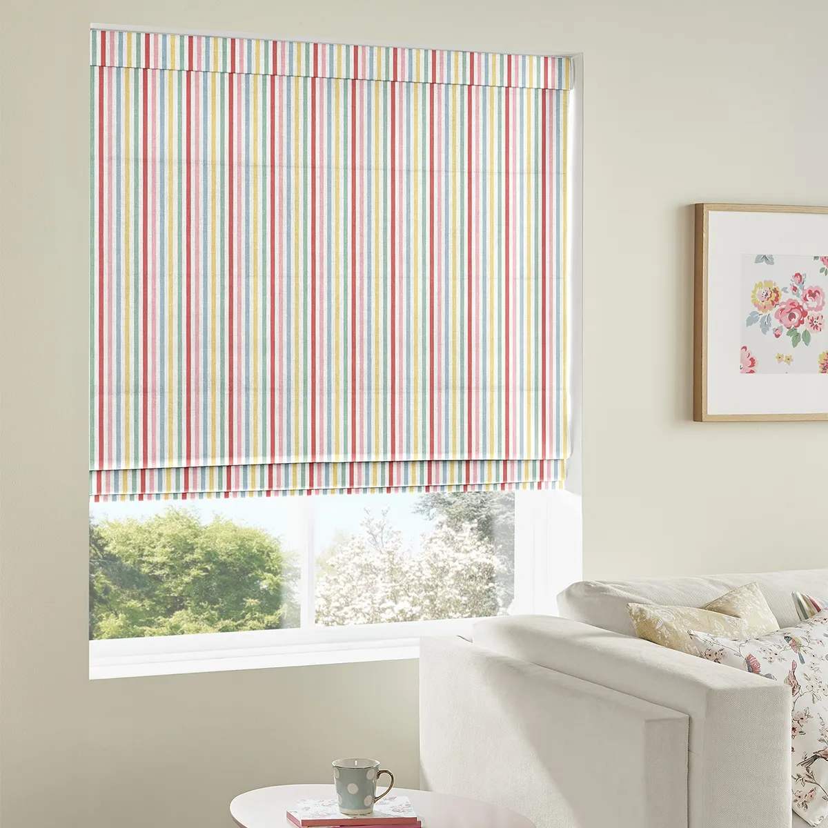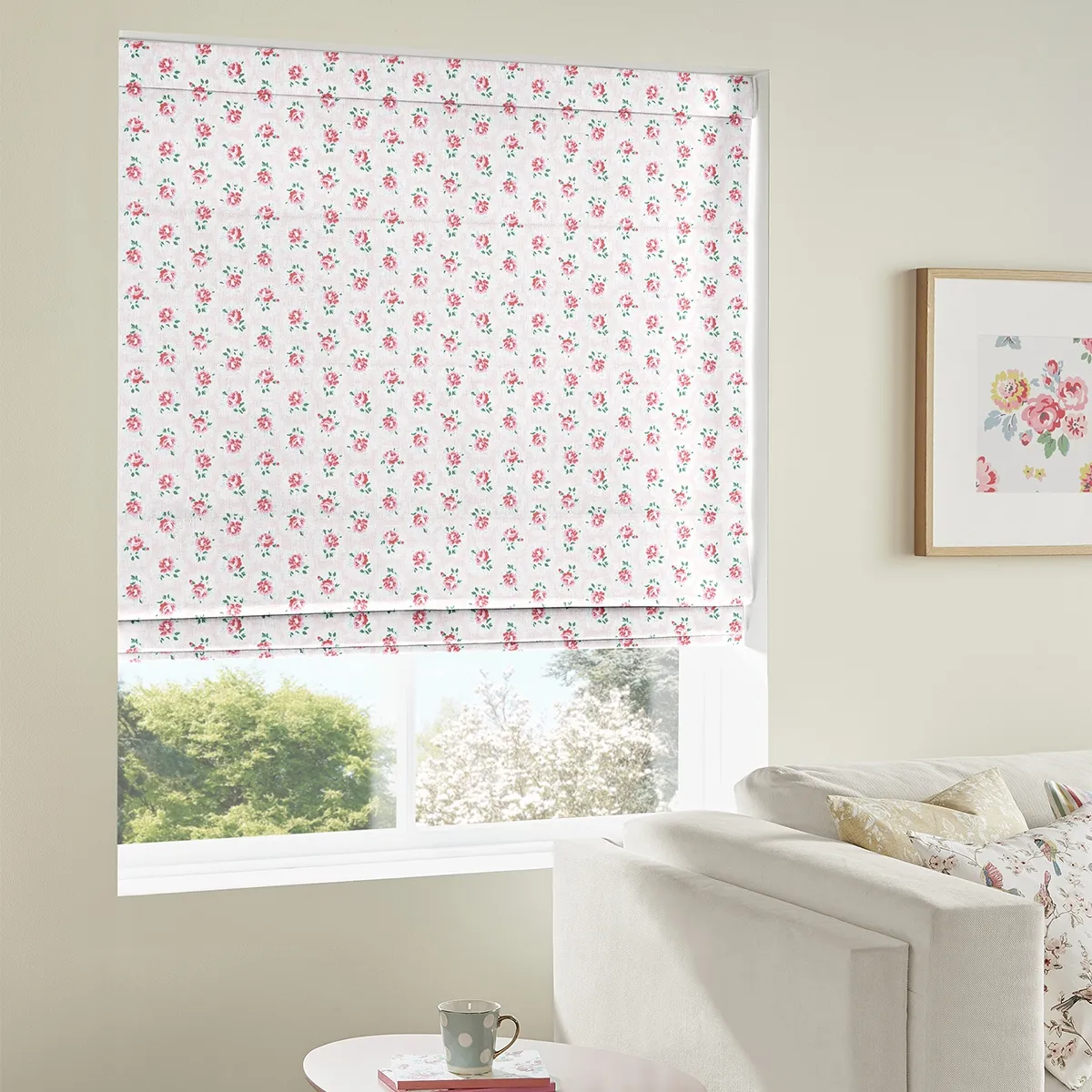 Introducing the Cath Kidston Antique Rose Pink Roman Blind by Urban Deco Blinds. Made from high-quality cotton fabric, this beautiful blind features a charming floral design of bright pink and green roses, along with delicate leaves. The traditional style of this blind adds a touch of elegance to any room, creating a warm and inviting atmosphere. Whether you want to enhance your kitchen, bathroom, or living room, this versatile blind is perfect for any space. It is made to measure, ensuring a perfect fit for your windows. The pink color adds a pop of vibrancy to your decor, making it a stunning focal point. This blind is in stock and available to purchase online. We offer free delivery all over the UK, so you can easily get your hands on this exquisite piece. Explore our wide range of kitchen blinds, living room blinds, and much more. Elevate your home with the Cath Kidston Antique Rose Pink Roman Blind today!