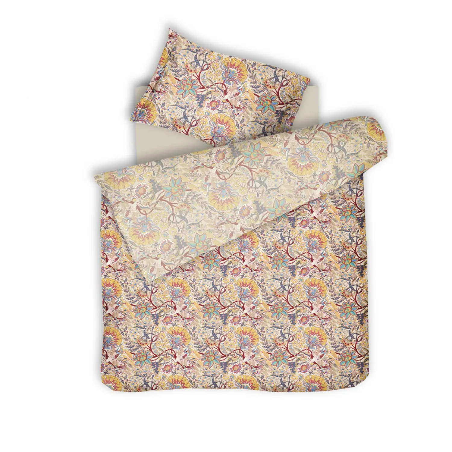 The Boho bed linen set offers dual character with its reversible design featuring subtle floral and botanical motifs on one side and gently muted patterns on the other. The long-fiber cotton sateen with TC300 weaving density provides durability and natural shine, while its soft texture ensures comfort and harmony. The reversible design allows you to switch between vivid intricate details and softer fog-like atmospheres. Made from 100% cotton sateen, the fabric combines luxurious softness with easy care maintenance.