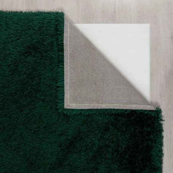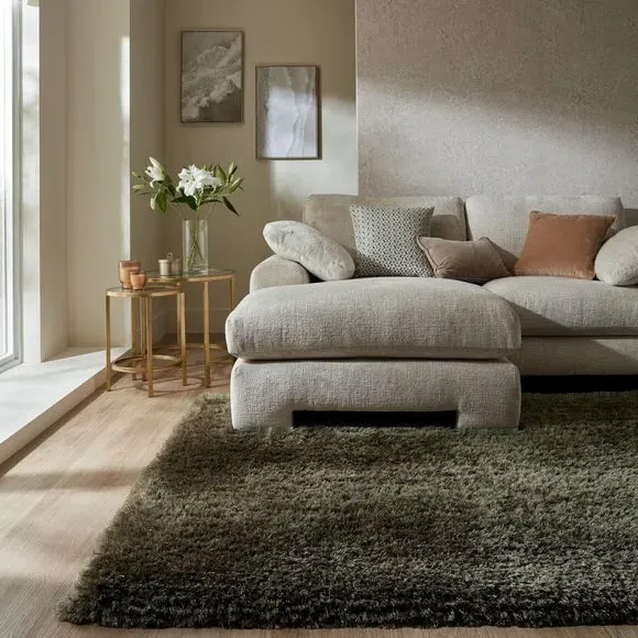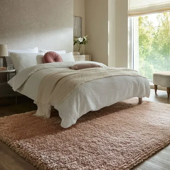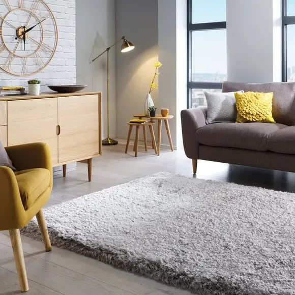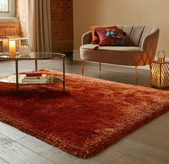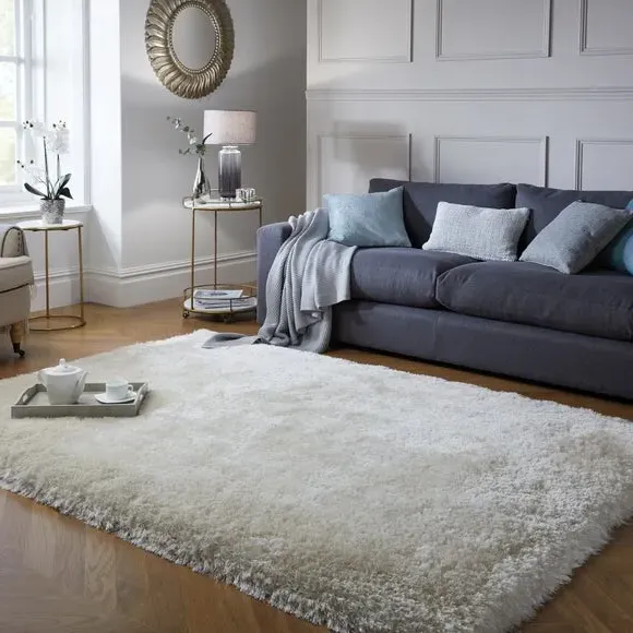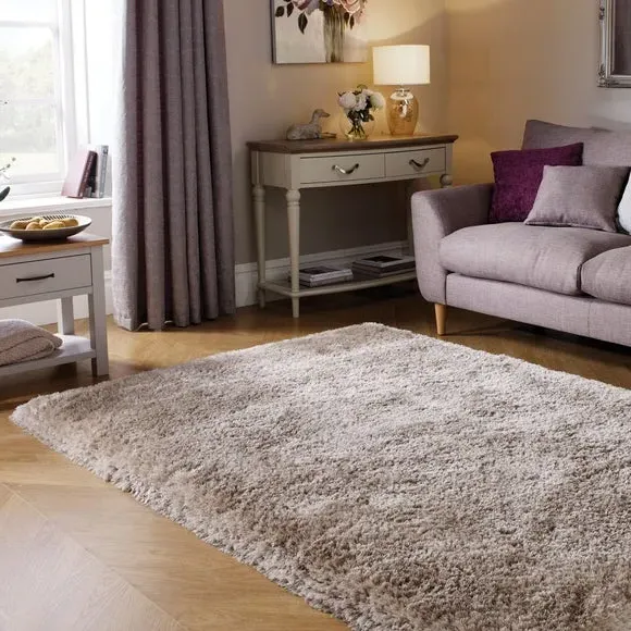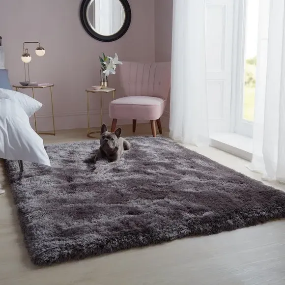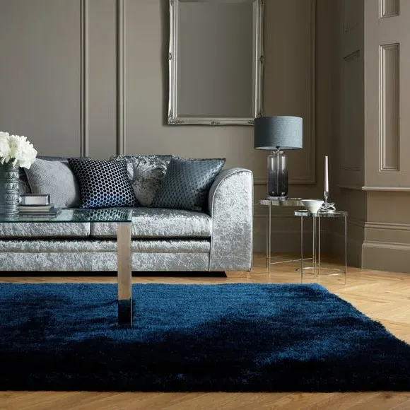* Jewel Shaggy Rug* Available in a range of sizes and shapes. The Jewel rug uses a clever combination of 7cm long, thick and thin yarns to create a plush, sumptuous feel underfoot. Available in a range of Jewel-inspired shades and crafted with lustrous silky yarns for extra shine, Jewel adds a touch of luxe that sits perfectly in living rooms and bedrooms. Table tufted in 100% polyester, Jewel boasts fade-resistant and durable qualities, while the densely tufted yarn adds texture, warmth and an extra layer of sound insulation to your space. Rug pictured is 160cm x 230cm. When opening, re-roll your rug pile out and leave in a warm room for 24 hours before putting in place, this will help to reduce wrinkles and curling from packing. Do not pull any loose threads, please cut them carefully with scissors to remove. Turn your rug regularly to ensure even wear and to reduce pressure marks from furniture. Before using any cleaning products on your rug, test on an inconspicuous area first to ensure it does not affect the colour. Clean spills immediately by blotting with a clean dry white cloth - do not rub as this may stain the fibres. Vacuum your rug regularly to remove everyday dirt, we recommend the use of a suction type vacuum cleaner or change your roller setting to the highest setting to reduce contact with the pile. Draw the vacuum across the rug with the direction of the pile to avoid causing damage. Please note: This rug contains Latex. Young infants should not be left unsupervised on this rug. Keep away from fire.