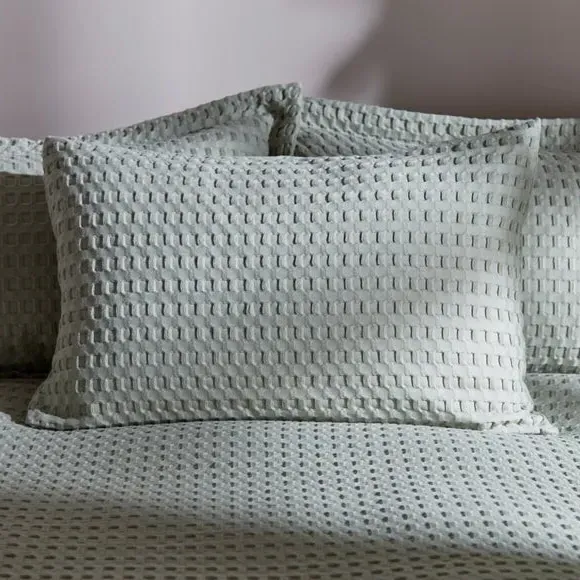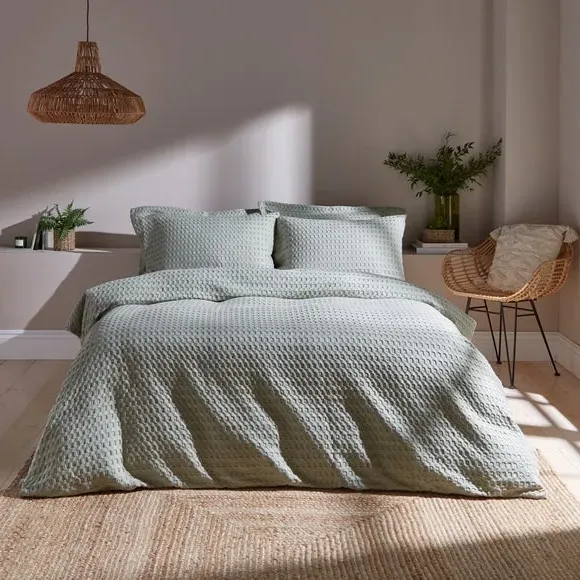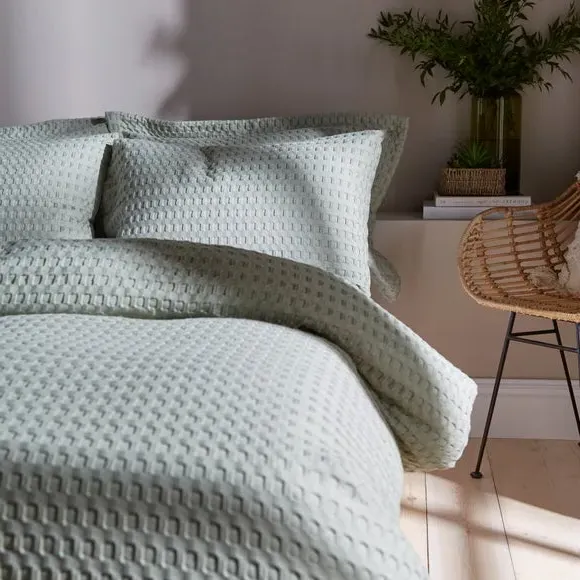* Waffle design* Made from 60% Cotton and 40% Recycled Polyester* Secure button closure* Includes standard pillowcase(s)* Machine washable* Available in 4 bedding sizes Add a contemporary finish to your bedroom with our Emerson Waffle Duvet Cover and Pillowcase Set, crafted from soft cotton to give you ultimate comfort and cosiness whilst sleeping. This bedding set is designed with a textured waffle design in a timeless sage green colourway. Finished with a secure button closure for an uninterrupted night sleep and comes complete with matching standard pillowcases for a complete bedding look. Easy to wash by simply popping in the washing machine. This product is OEKO-TEX MADE IN GREEN certified, meaning it was produced in OEKO-TEX S Te P certified factories - verifying environmental, social, and chemical standards in the facility. It has also been certified to OEKO-TEX STANDARD 100, the original safety standard for everyday confidence. To offer full visibility, the production stages throughout the supply chain can be traced.