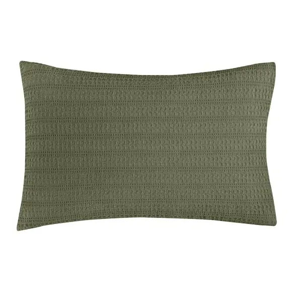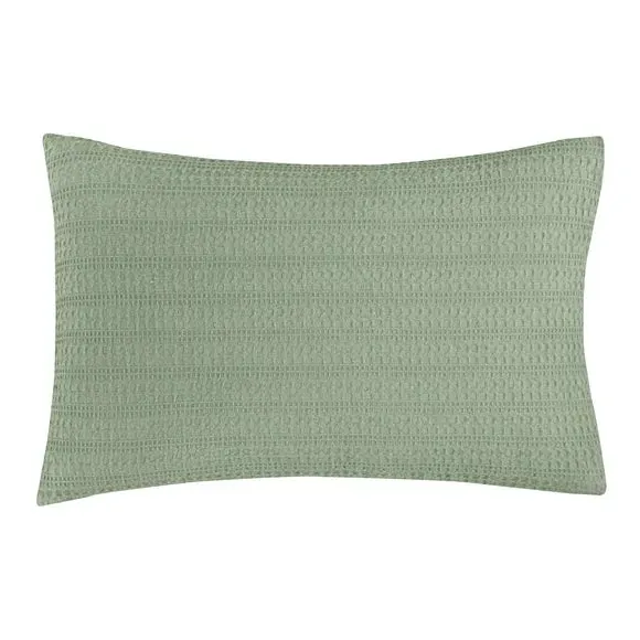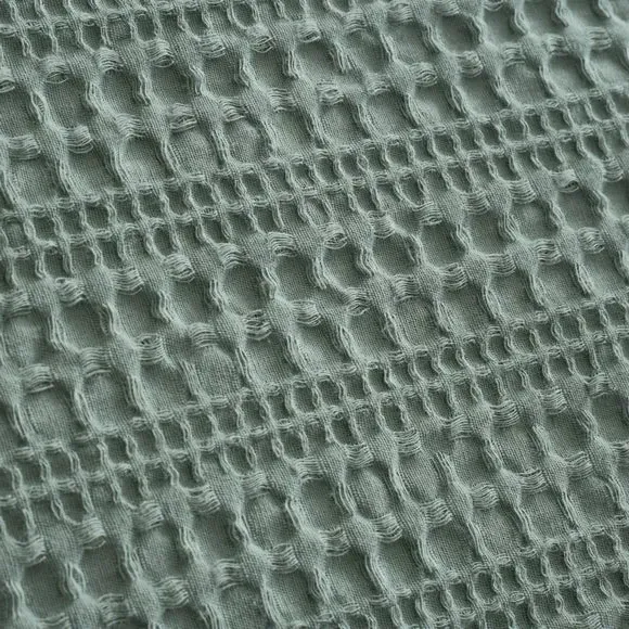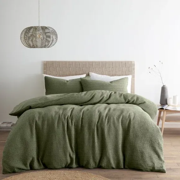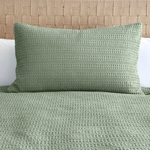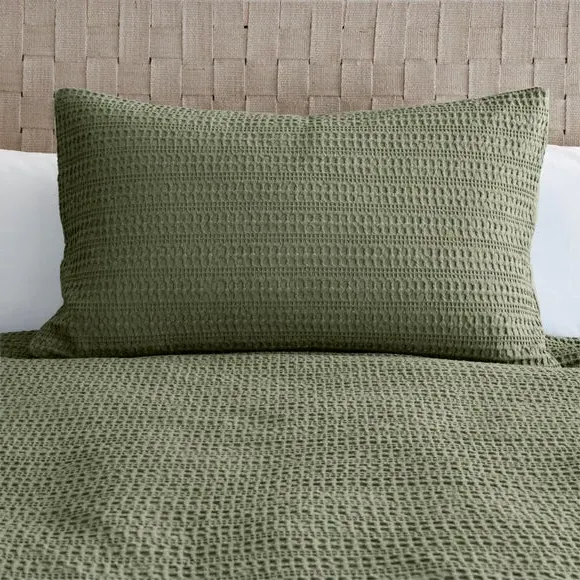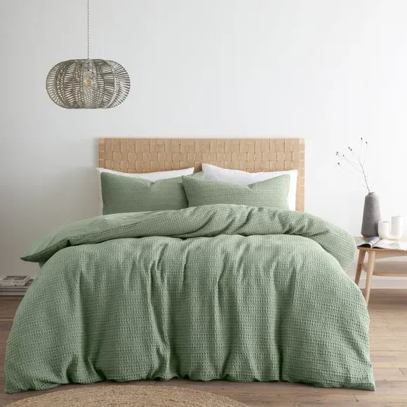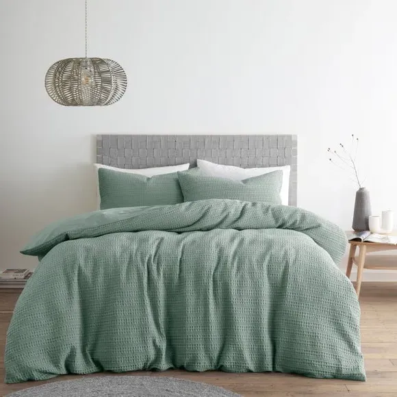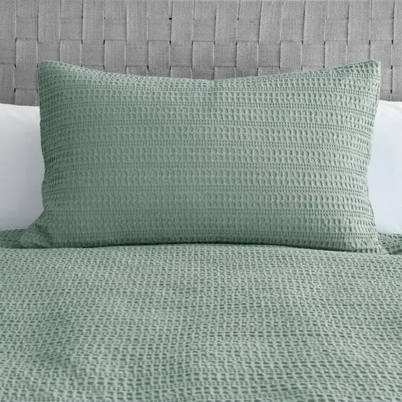 The waffle duvet cover set provides natural comfort with its 100% cotton waffle fabric in soothing sage. Its textured weave allows for better breathability, while the button closure ensures secure fastening throughout the night. The set comes with matching standard pillowcase and offers machine washable convenience with certified safety standards.