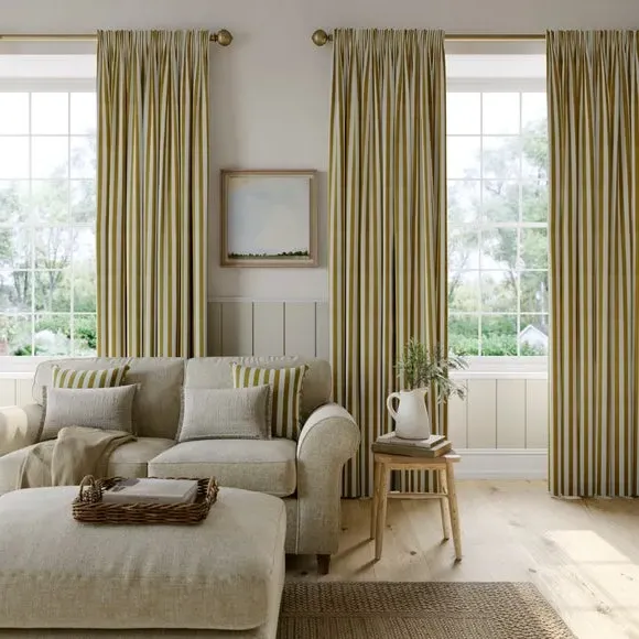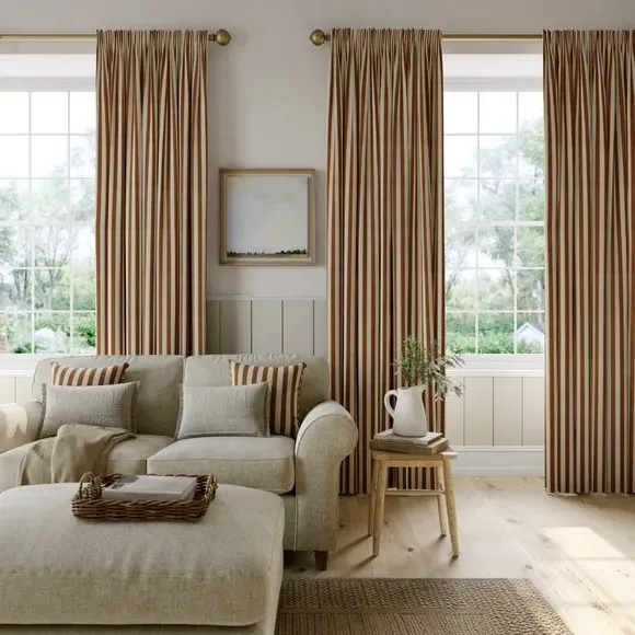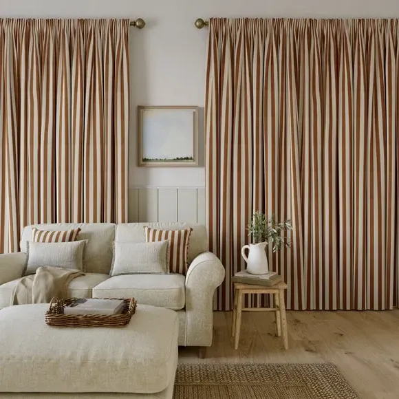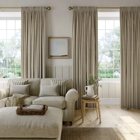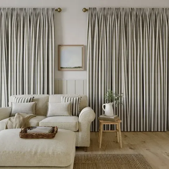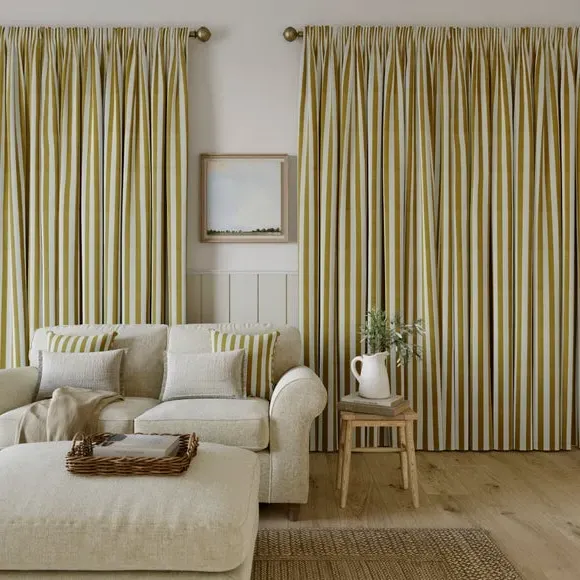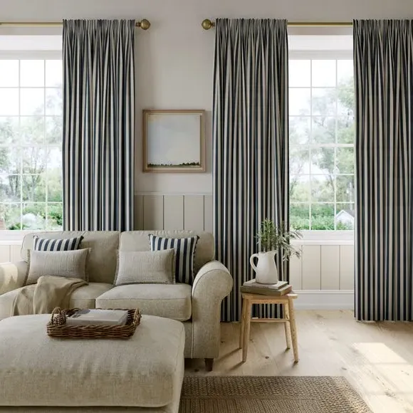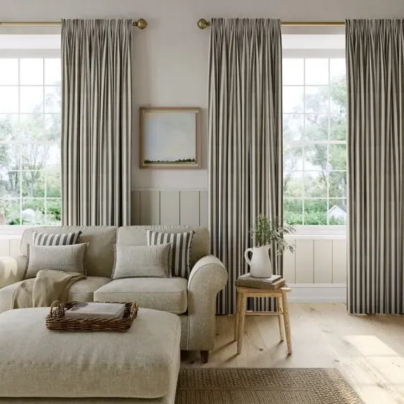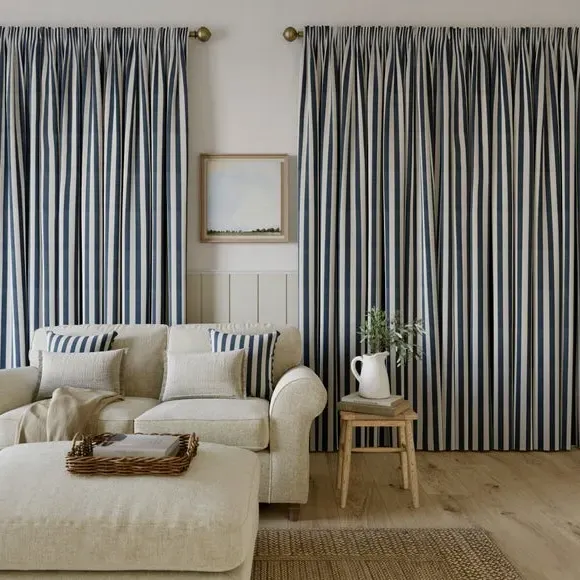 The curtains feature a robust 100% cotton composition with a linen-look finish and striped design. Multiple header options including pencil pleat, eyelet, and pinch pleat allow for customized hanging styles, while the heavy cotton construction maintains quality and hangs neatly without creasing. Choose from regular, blackout, or thermal linings for enhanced functionality and privacy. The durable cotton fabric is designed for busy homes and coordinates with matching items for a cohesive look.