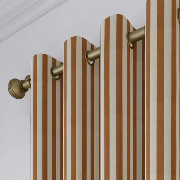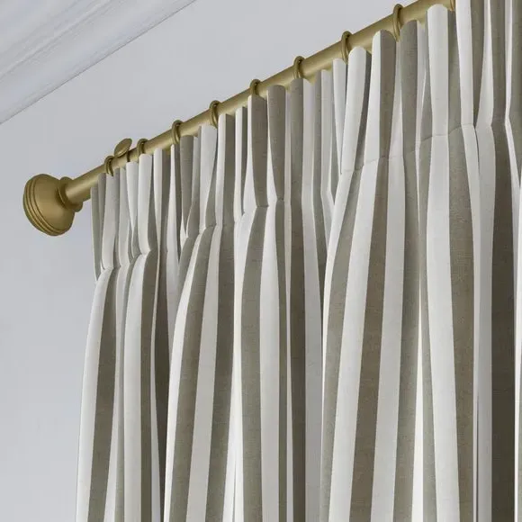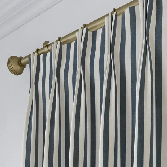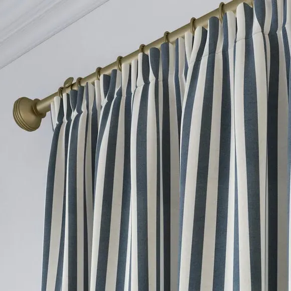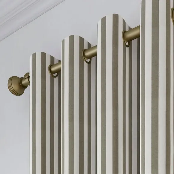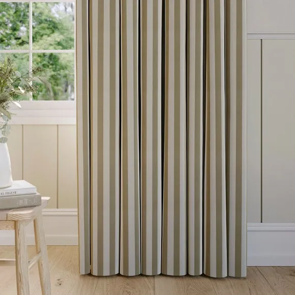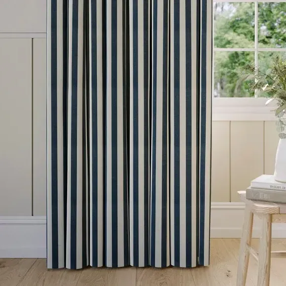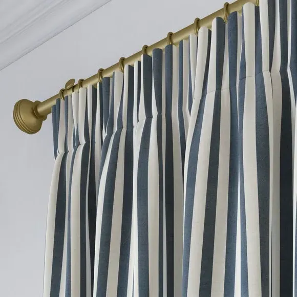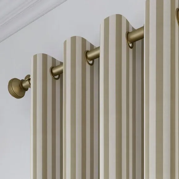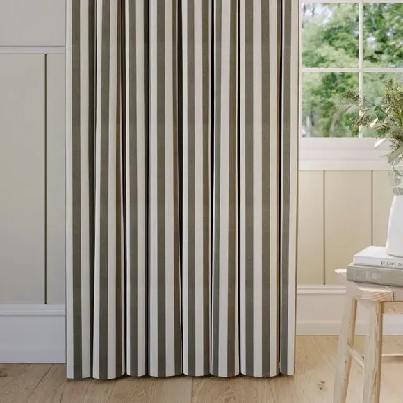 The curtains feature a robust 100% cotton composition with a linen-look finish and striped design. Multiple header options including pencil pleat, eyelet, and pinch pleat allow for customized hanging styles, while the heavy cotton construction maintains quality and hangs neatly without creasing. Choose from regular, blackout, or thermal linings for enhanced functionality and privacy. The durable cotton fabric is designed for busy homes and coordinates with matching items for a cohesive look.