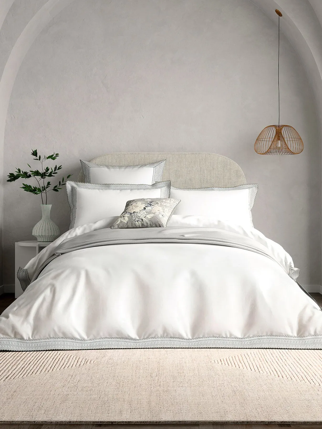 Add pure sophisticated to your bedroom scheme with Astrid. Presenting a semi plain bedding design in white with intricate embroidered detailing around duvet sides and bottom, enhance the look with the matching standard and square pillowcases. Layer the look further with the Amalia wool herringbone blanket style throw with satin border and printed floral cushion to complete the look. | Bedeck of Belfast Astrid Cover Set in White/Silver, Wool/Satin, Size Double | Bedeck of Belfast Astrid Cover Set in White/Silver, Wool/Satin, Size Double