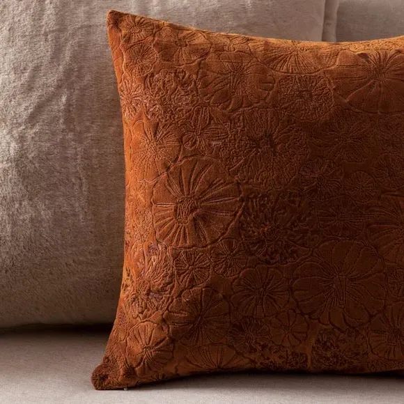 The cushion features an all-over embroidered pumpkin design in warm, earthy tones with luxurious velvet construction. Its soft texture provides comfort and elegance, while the plain reverse adds versatility for seasonal styling. The square shape suits various seating arrangements, and the choice of feather or polyester insert ensures customized support.