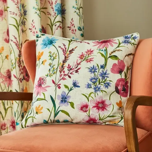 Amaryllis watercolour floral design cushion, in delightful shades of pink and green, set against a warm ivory background. Please note this is a cushion cover only. To complete the look, why not consider the coordinating ready-made curtains adorned with matching tie-backs and cushions, also available is a matching duvet set for an elegantly cohesive style.