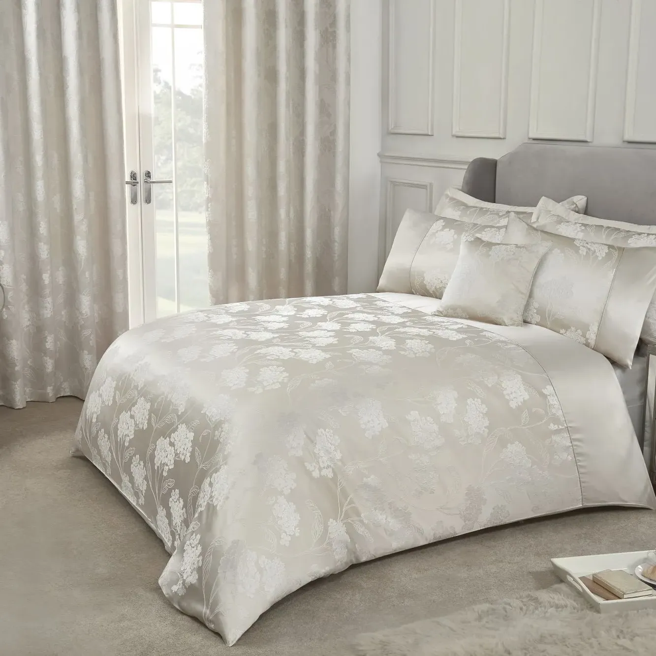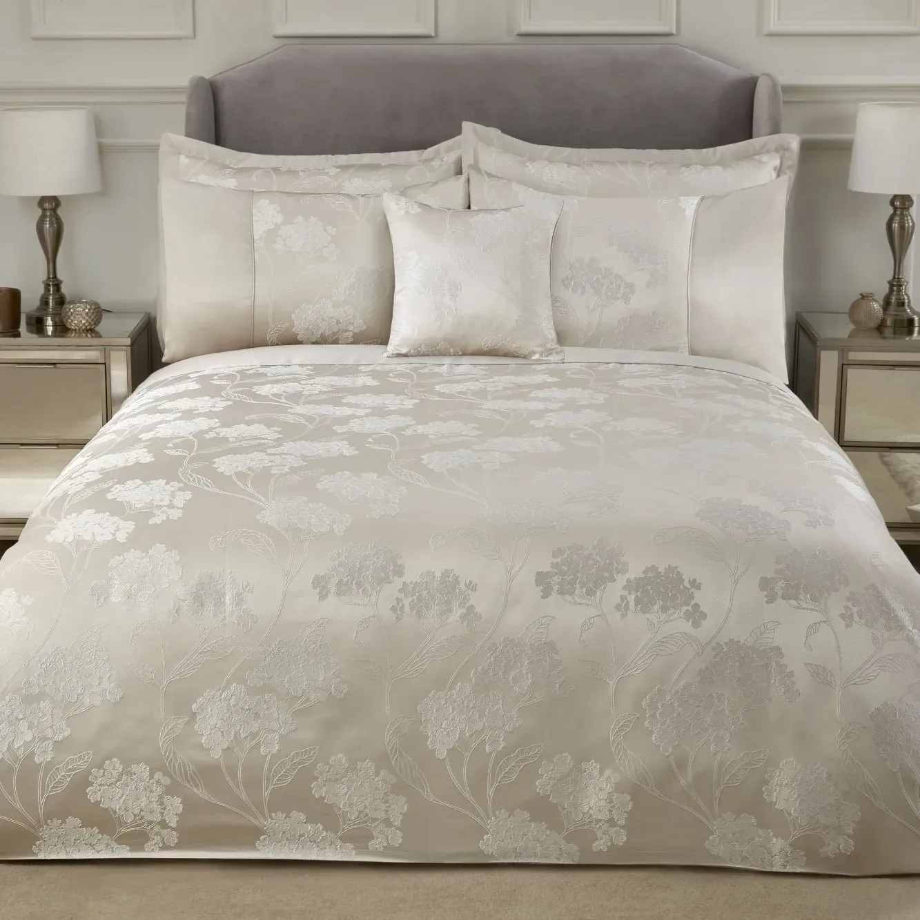 The duvet set features luxurious jacquard weaving with embellished floral motifs that add texture and visual interest. Its soft sateen finish border provides a smooth touch, while the light and whimsical tones create a fresh appearance. The jacquard construction combines durability with intricate pattern detail, and the single size offers comfortable coverage for restful sleep.