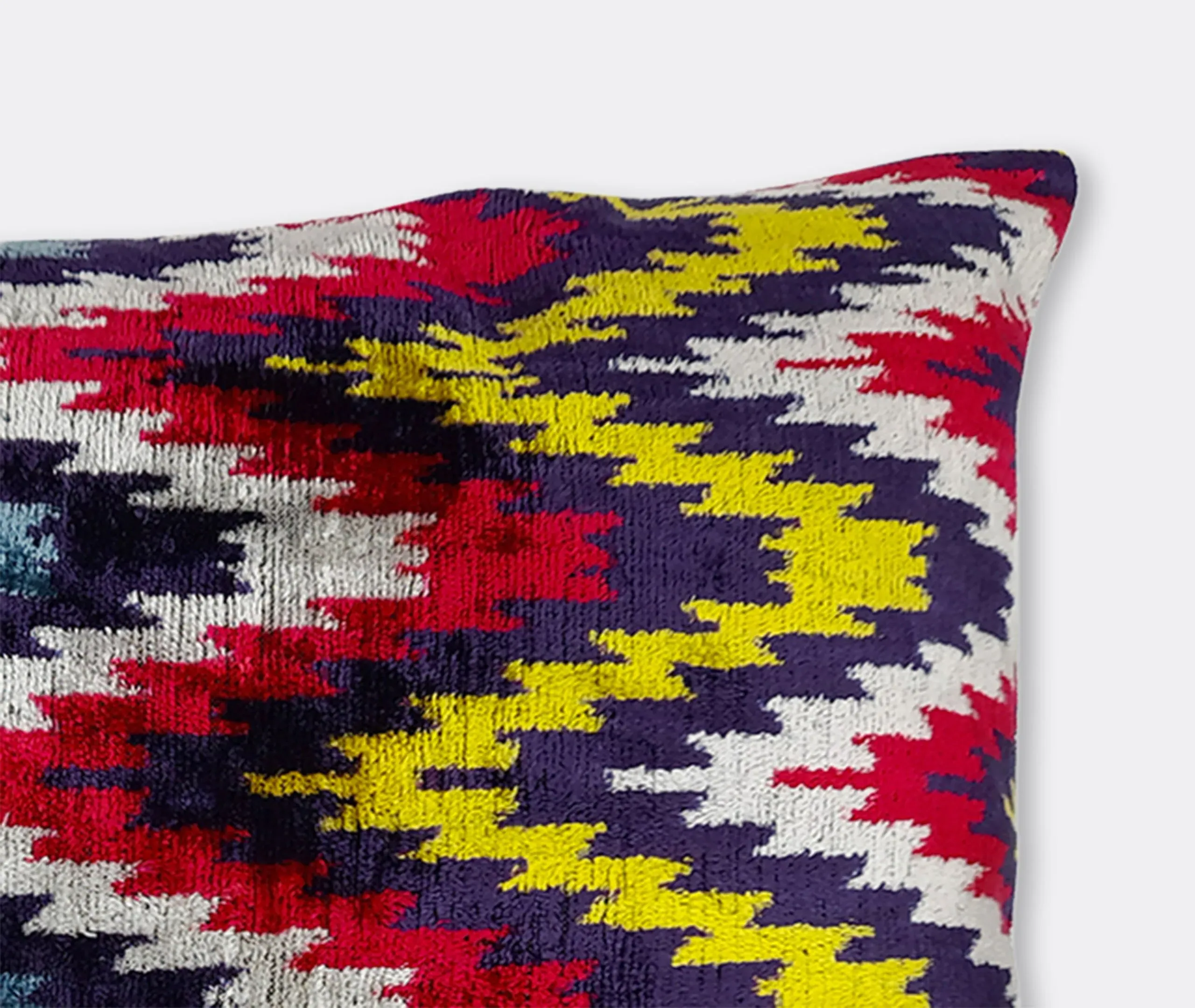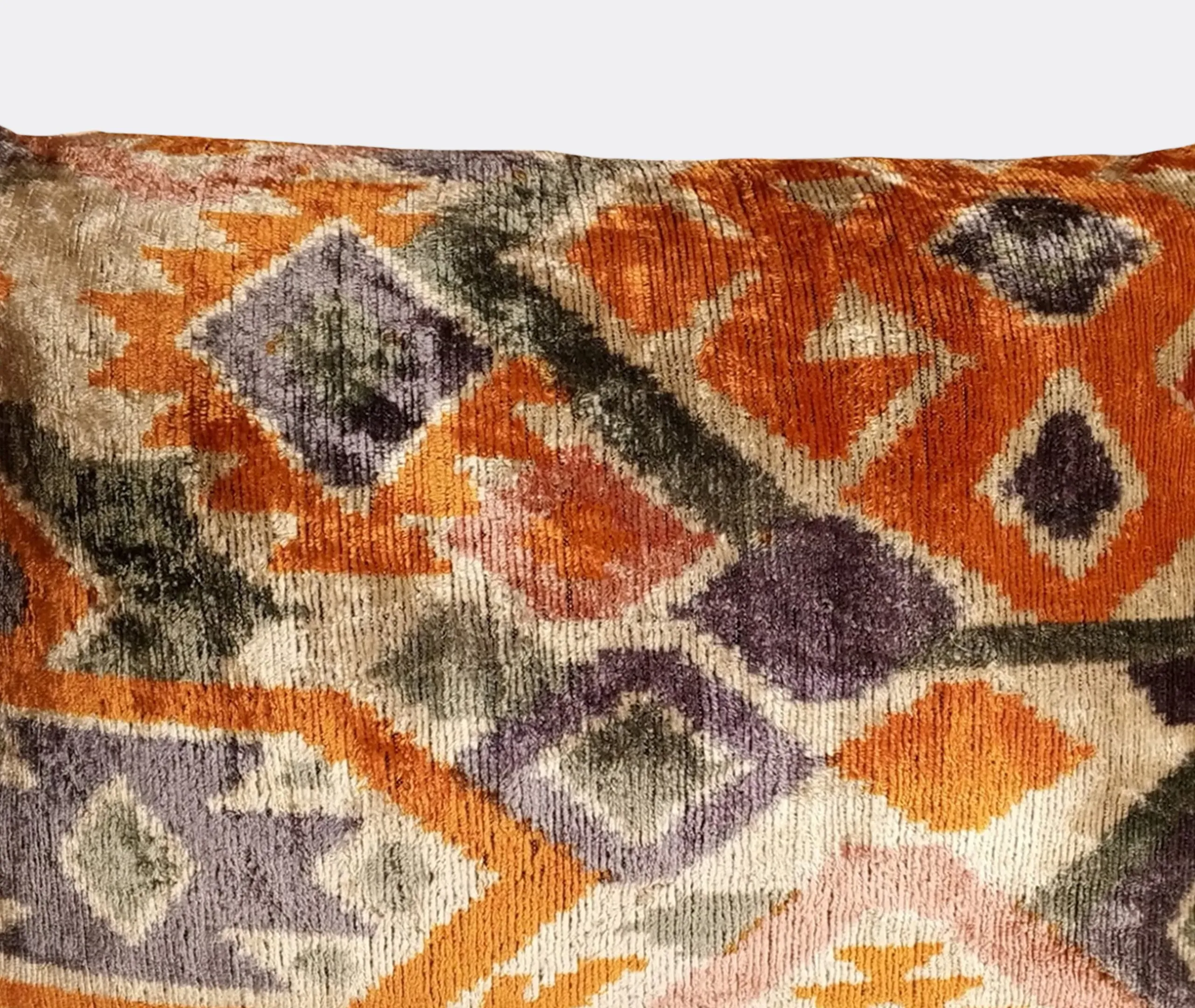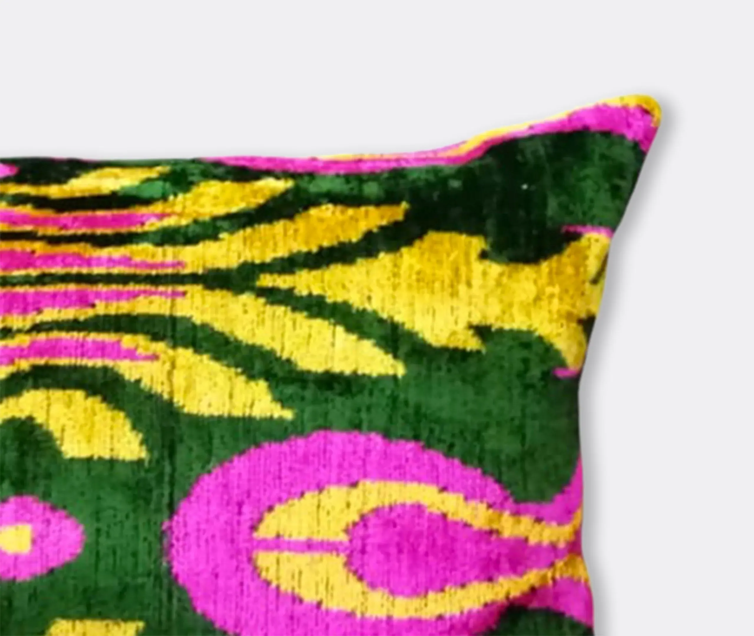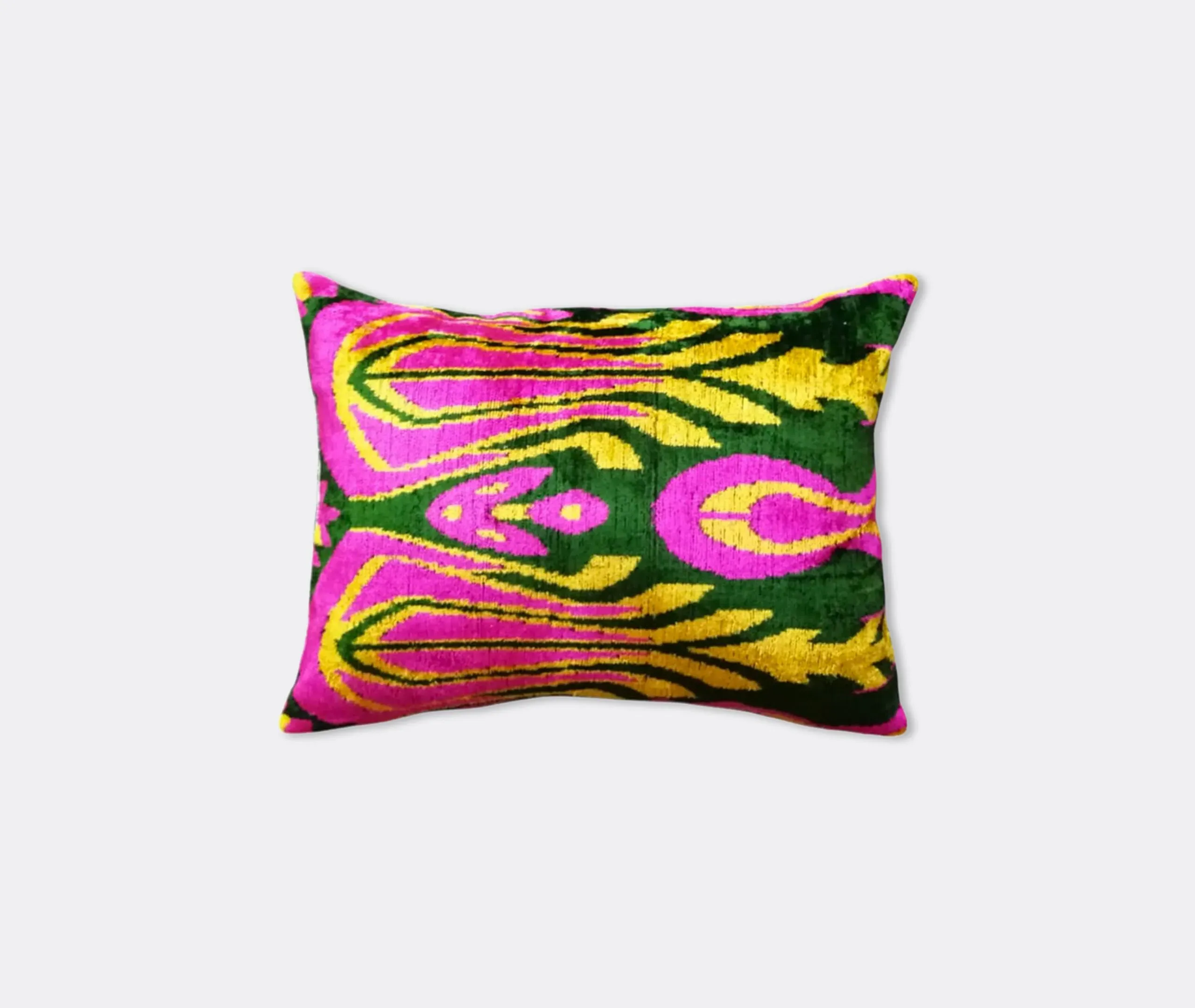 The cushion features luxurious silk velvet construction with an abstract botanical motif in rich pink, purple and green tones. Its handcrafted surface displays ornate floral patterns, while the sumptuous velvet material adds warmth and texture. The vibrant multicolor design complements other pieces in the collection, and the traditional craftsmanship ensures lasting quality.