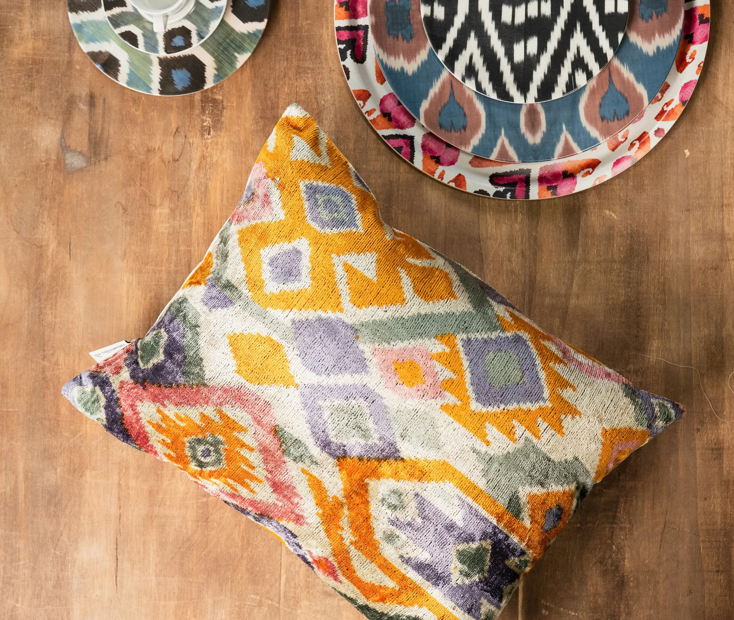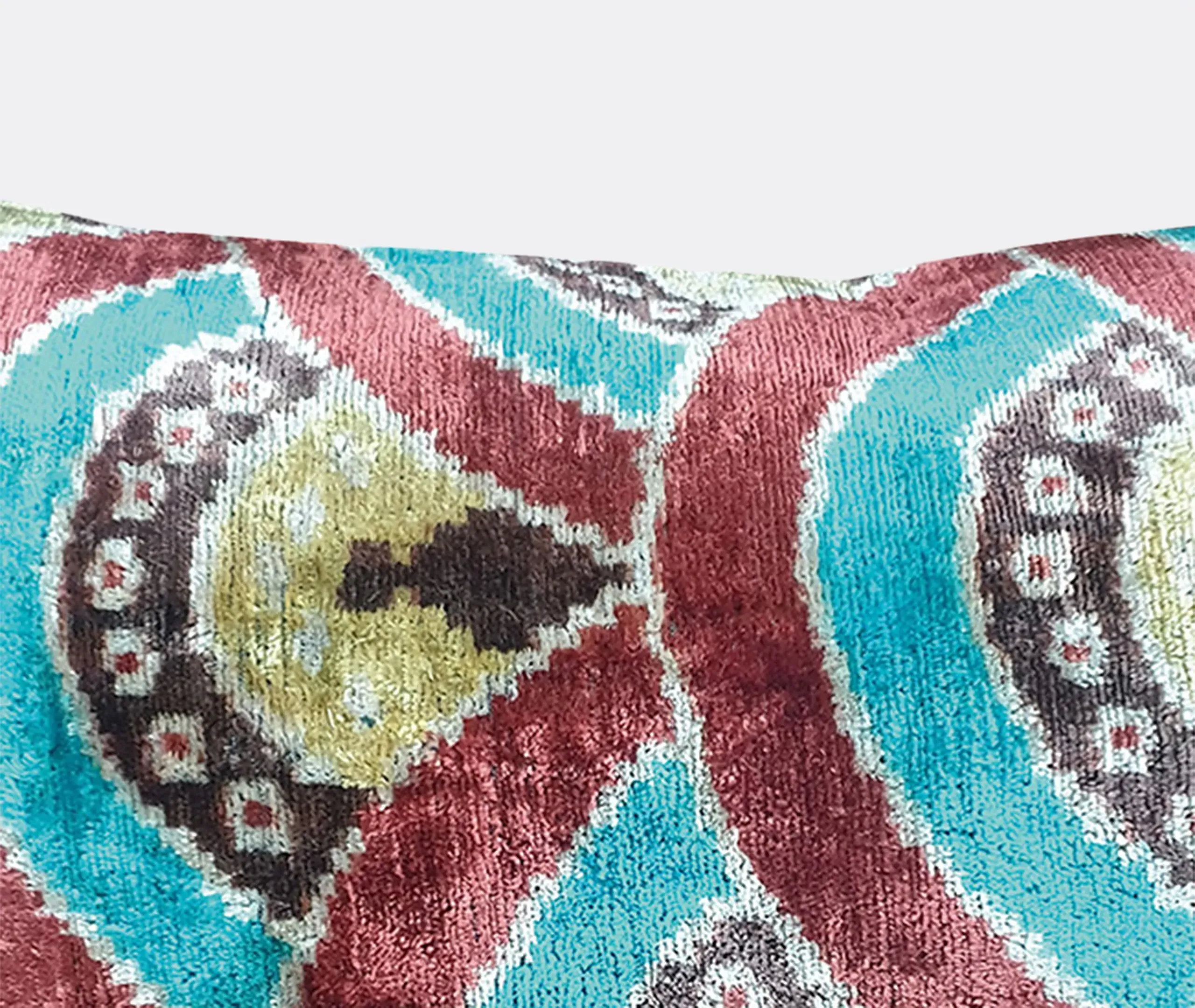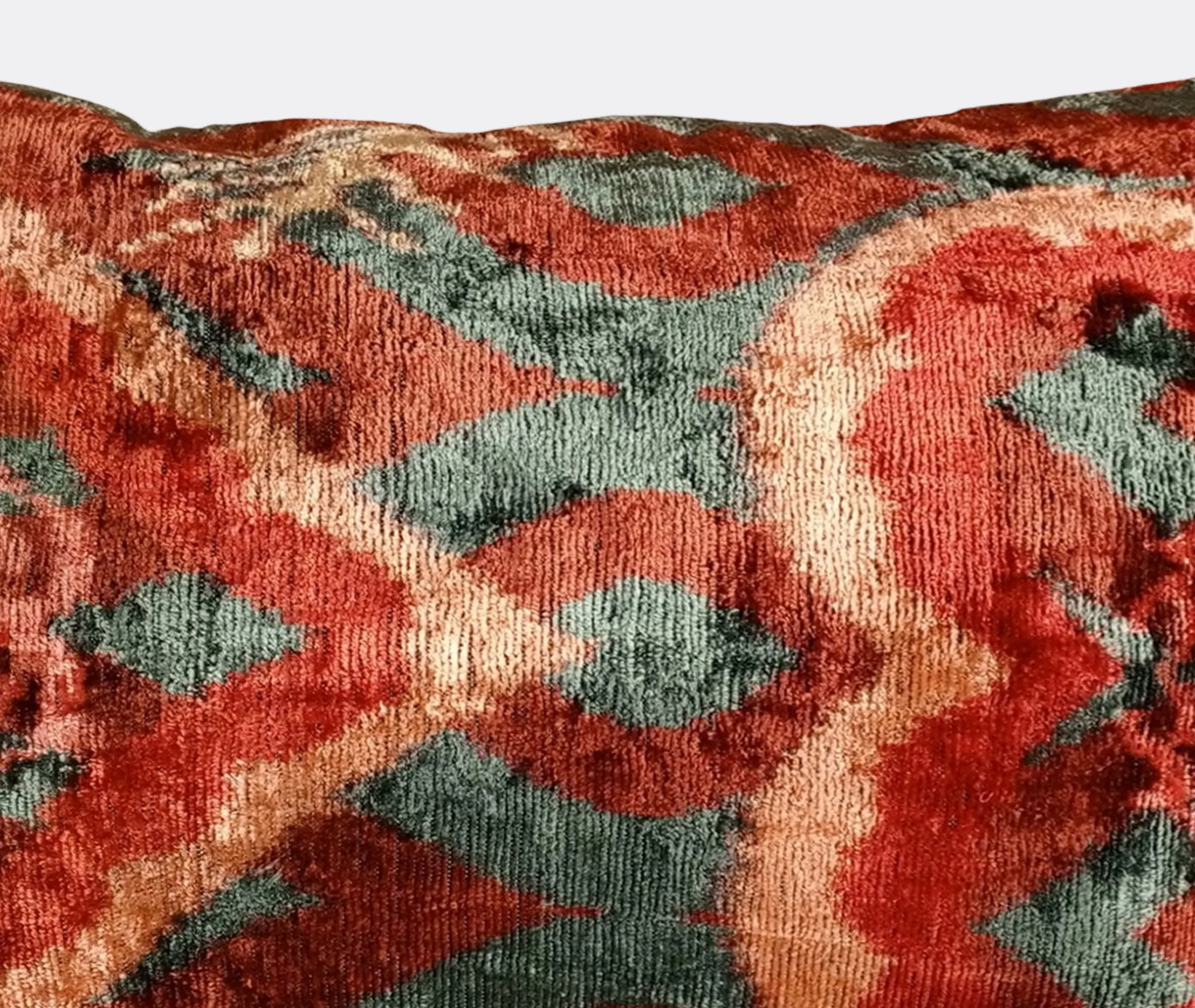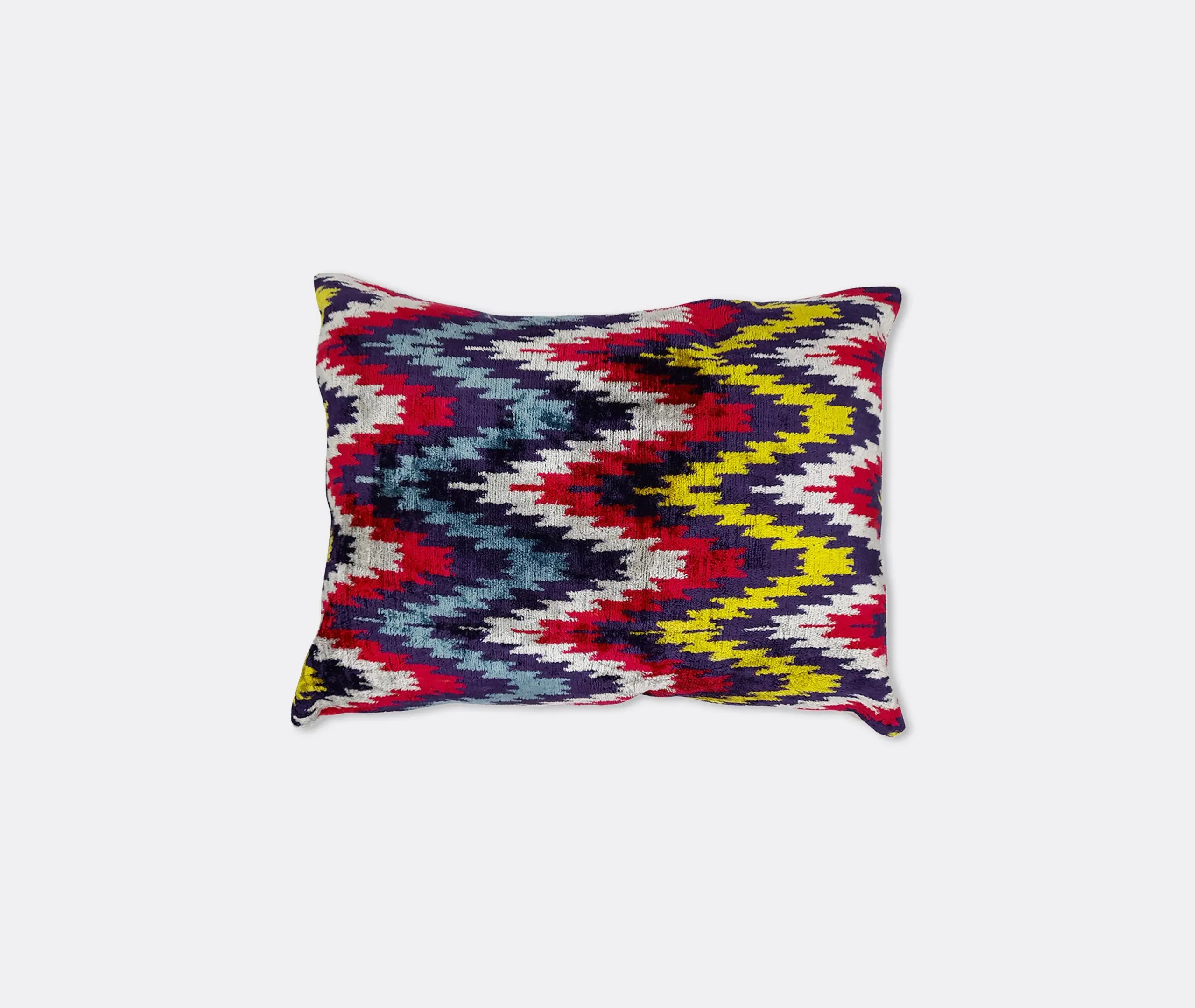 The cushion features luxurious silk velvet construction with an abstract botanical motif in rich pink, purple and green tones. Its handcrafted surface displays ornate floral patterns, while the sumptuous velvet material adds warmth and texture. The vibrant multicolor design complements other pieces in the collection, and the traditional craftsmanship ensures lasting quality.