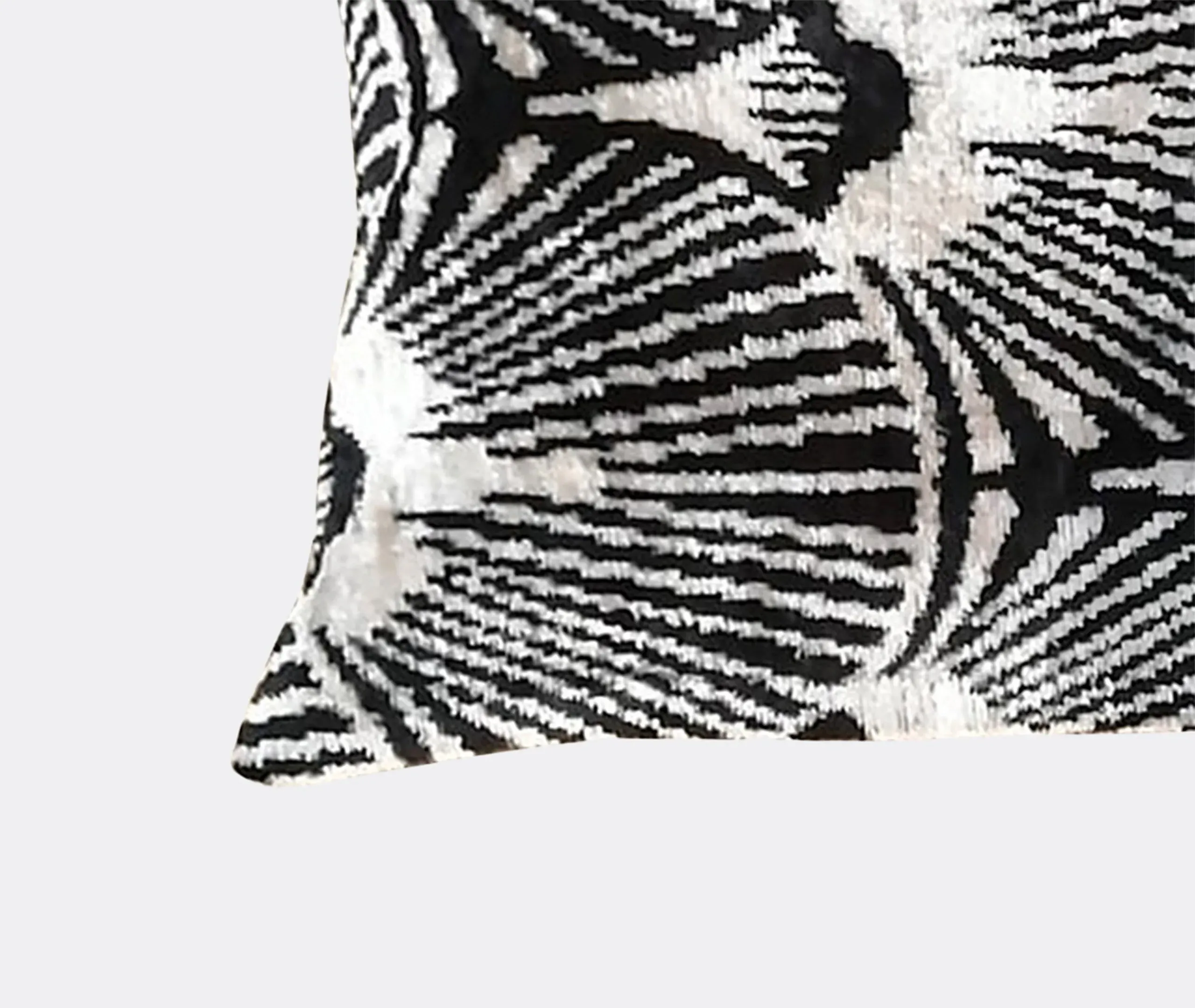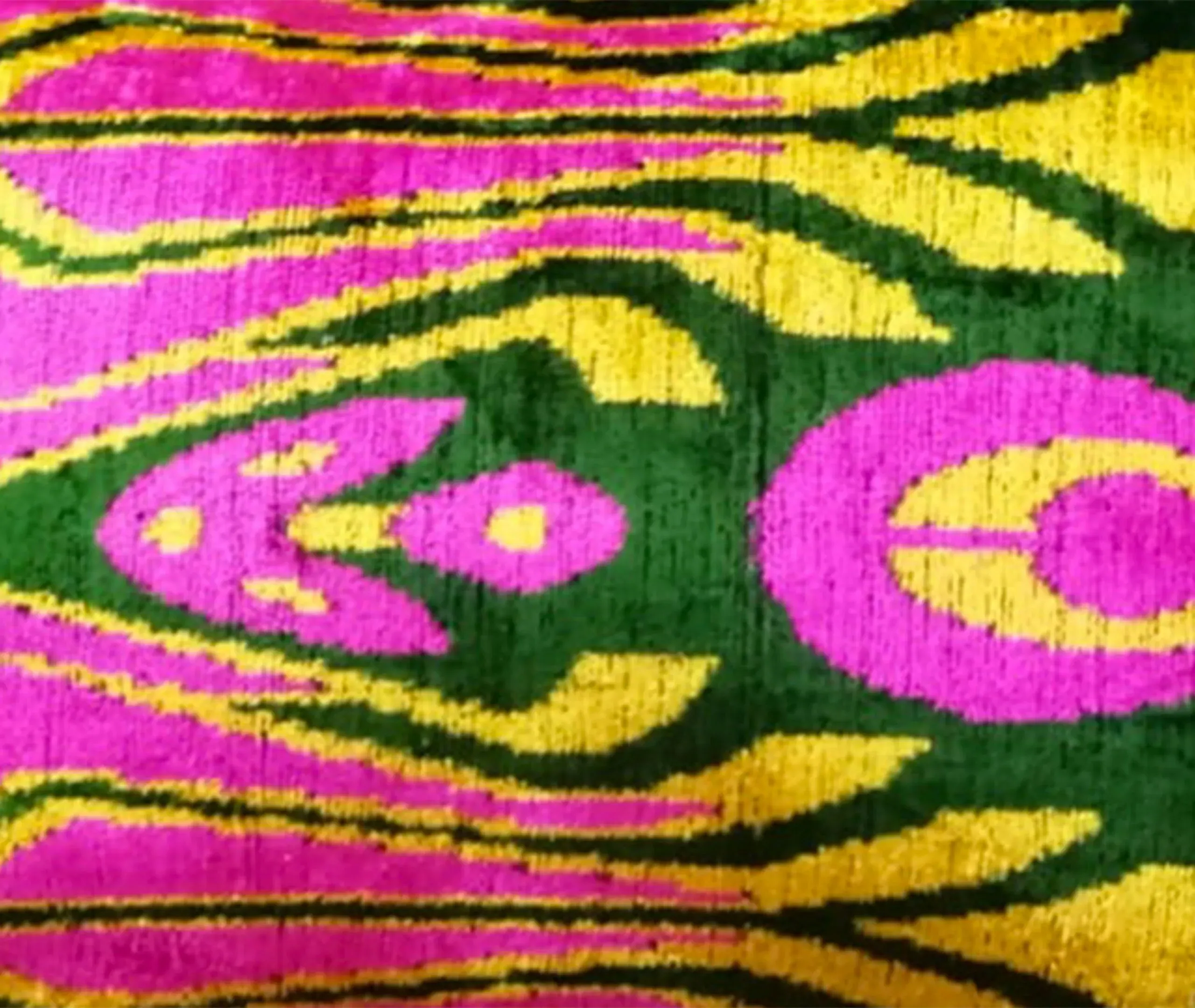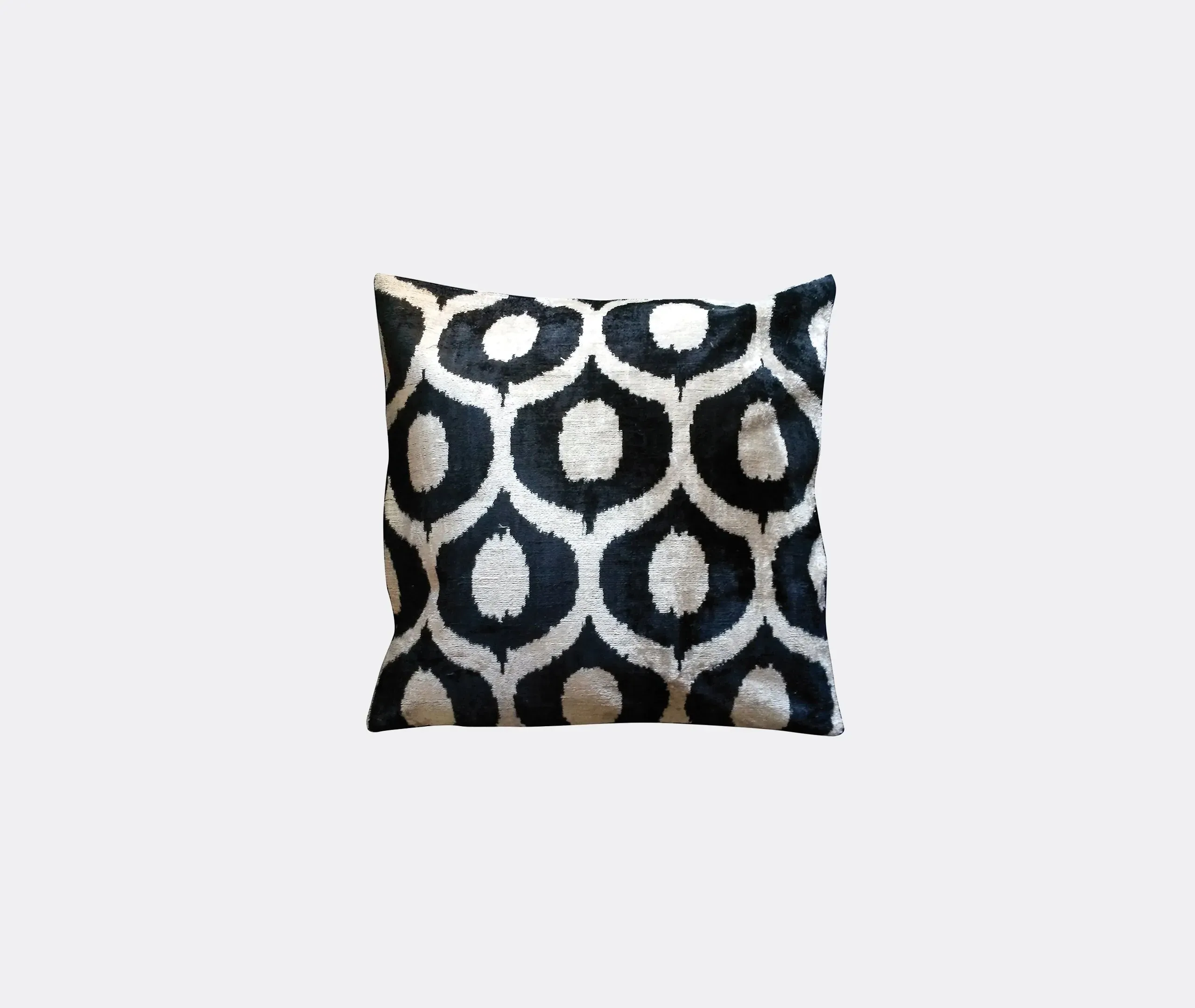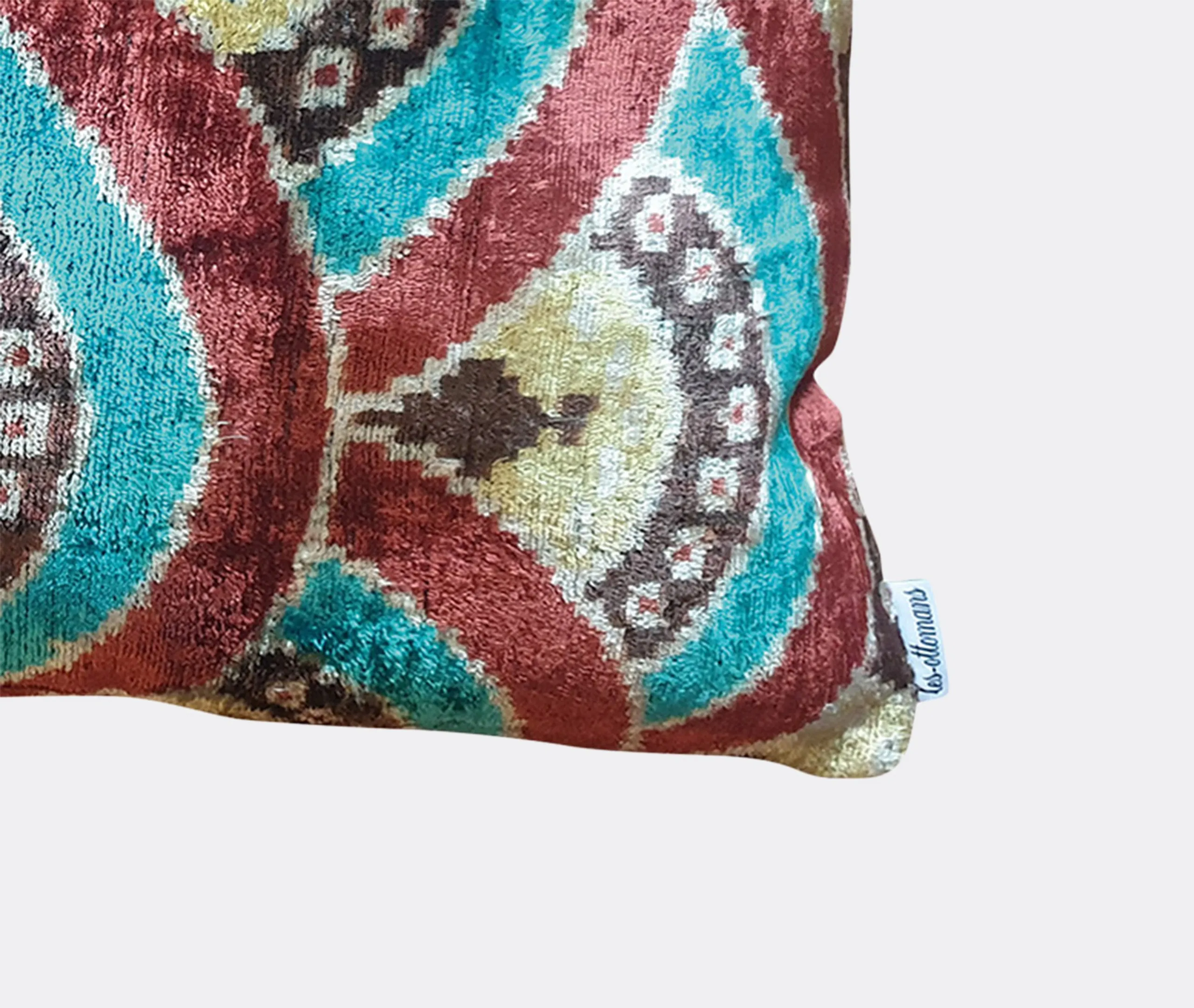 The cushion features luxurious silk velvet construction with an abstract botanical motif in rich pink, purple and green tones. Its handcrafted surface displays ornate floral patterns, while the sumptuous velvet material adds warmth and texture. The vibrant multicolor design complements other pieces in the collection, and the traditional craftsmanship ensures lasting quality.