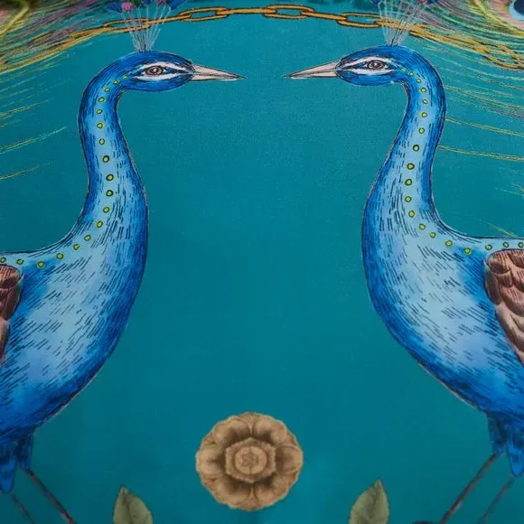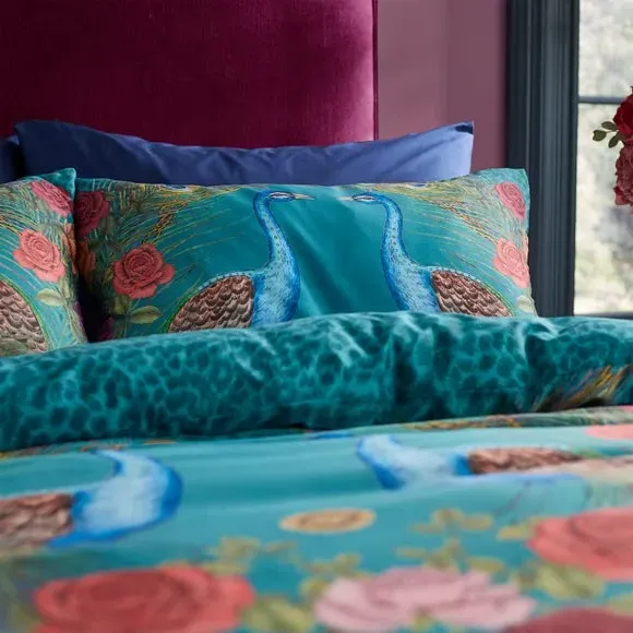 * Pure Cotton: The natural fibres of cotton create a fabric that is smooth and comfortable to touch.* Sateen Weave: A smooth and lustrous handle for an elegant feel.* Fully Reversible: For two stylish looks in one.* Button Fastening: To keep your duvet securely in place.* Durability: Made to withstand regular use and washing. Elevate your living space with this statement piece. A pair of majestic mirrored peacocks stand proud in the centre of this design. Crafted from 200 thread count cotton and adorned with a garland of roses and leopard print for maximalist impact. Bringing a unique & unrivalled use of pattern & colour from the world of fashion into home interiors, creating an uplifting inspirational home collection. This collection is verified by OEKO-TEX and independently tested for harmful substances as well as manufactured using sustainable processes under socially responsible working conditions.