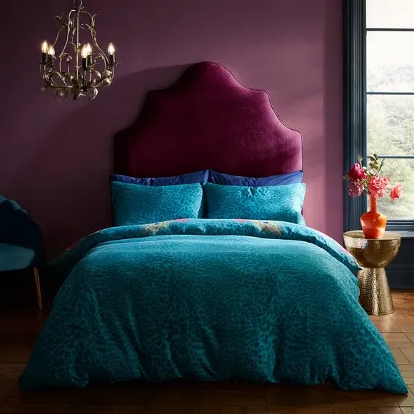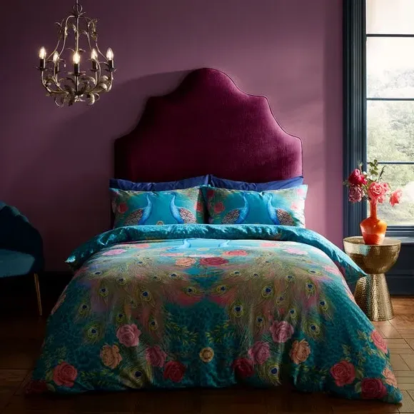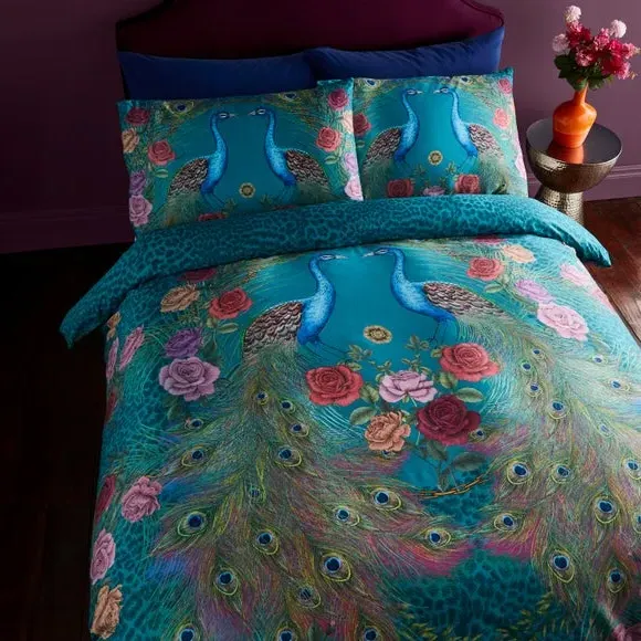 The duvet cover set features mirrored peacock motifs with rose garlands and leopard print accents. Its 200 thread count cotton construction offers smooth comfort, while the sateen weave provides a lustrous finish. The fully reversible design gives two styling options, and button fastenings keep the duvet securely in place.