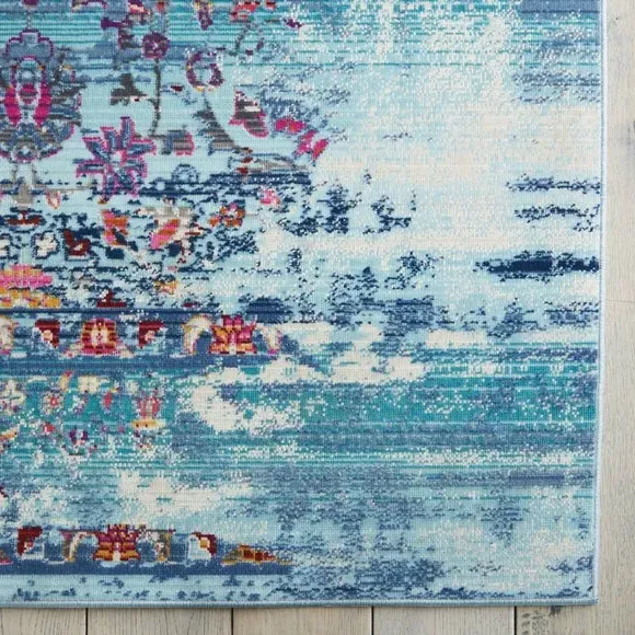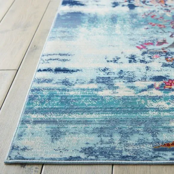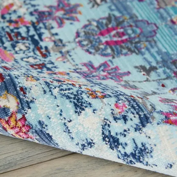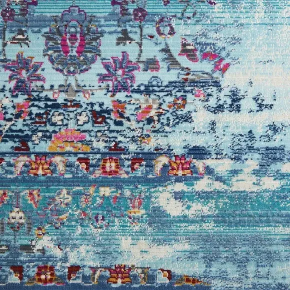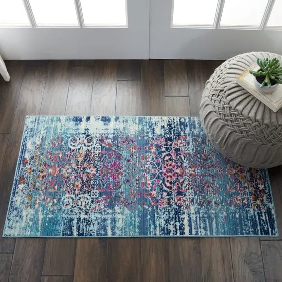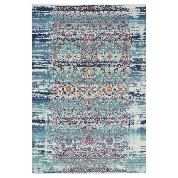 The area rug features a deeply distressed ultra-low-cut pile at 5mm thickness, creating an authentic vintage appearance. Its classic multi-coloured palette provides the look and feel of a Persian heirloom piece, while the low-profile construction offers easy maintenance. The rug may require a settling period of a few days to weeks to lay completely flat after unrolling.