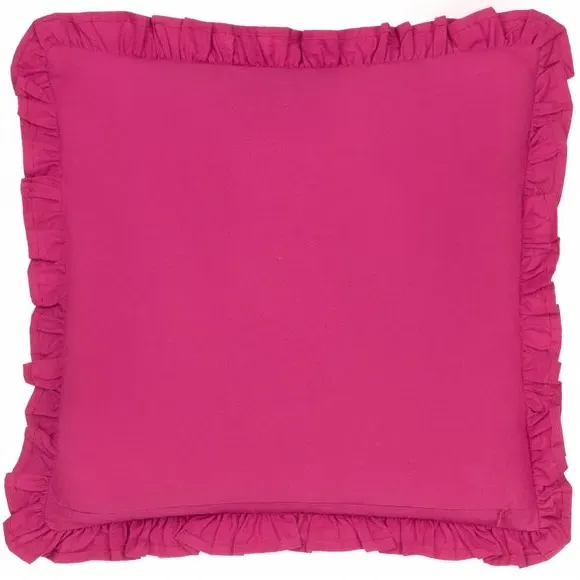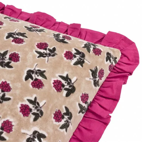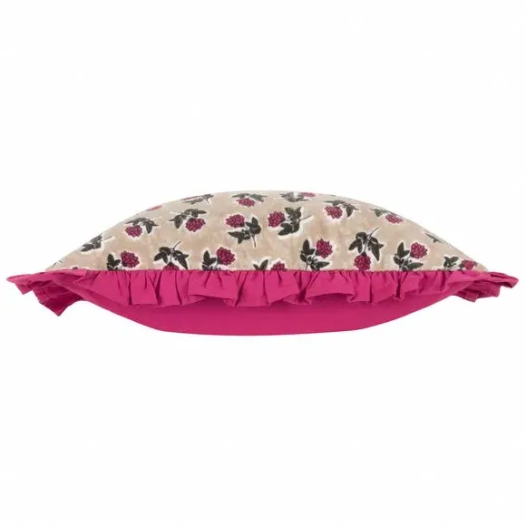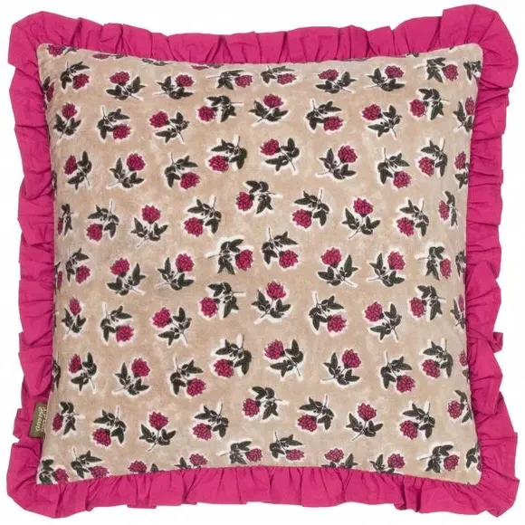 The cushion features a classic floral design printed on 100% cotton, with a ruffled frill trim that adds textural interest. Its plain reverse provides balance and versatility, while the cotton construction offers natural breathability and comfort. The ruffle edge detail creates visual depth, and the square shape suits various styling arrangements.