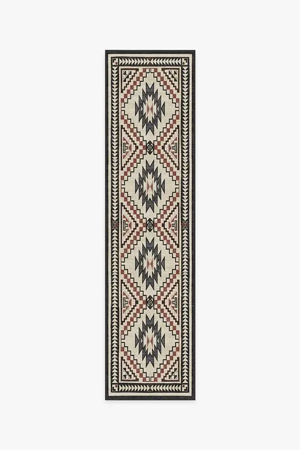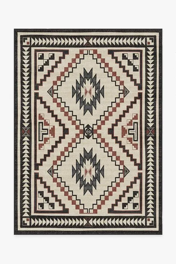 Desert Sumac is inspired by Southwestern motifs. It features a central diamond emblem, surrounded by zigzags and corner triangles in neutral hues of grey and charcoal with red accents. 60x90 | Machine Washable Area Rug | Kid & Pet Friendly | Indoor Rugs | Desert Sumac Rug Neutral | Ruggable