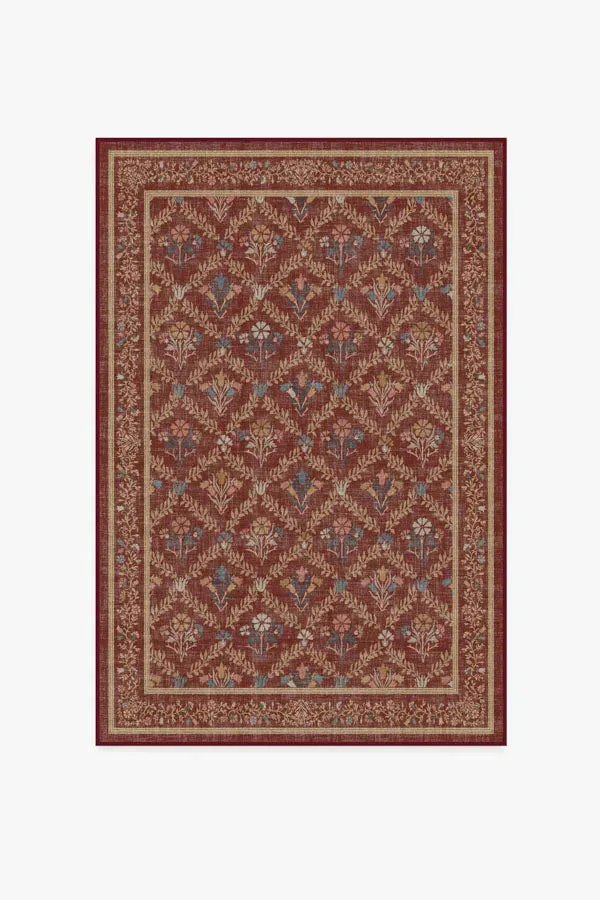 Gaze at the organic beauty of the Morris & Co. Bellflowers Amber Red Rug. Our interpretation of William Morris's famed carpet design from the late 1800s, this rug boasts a beautiful lattice vine design and delicate bouquets that evoke the promise of spring. A harmonious border of floral buds and leaves frames the design in intricate detail. Rich red grounds the design, while softened pops of coral, yellow, and blue make it sing. Water-resistant, stain-resistant, and machine-washable. Rug colours may vary slightly according to your device and the lighting in your space. 60x90 | Machine Washable Area Rug | Kid & Pet Friendly | Indoor Rugs | Bellflowers Amber Red Flatwoven Rug by Morris & Co. | Ruggable