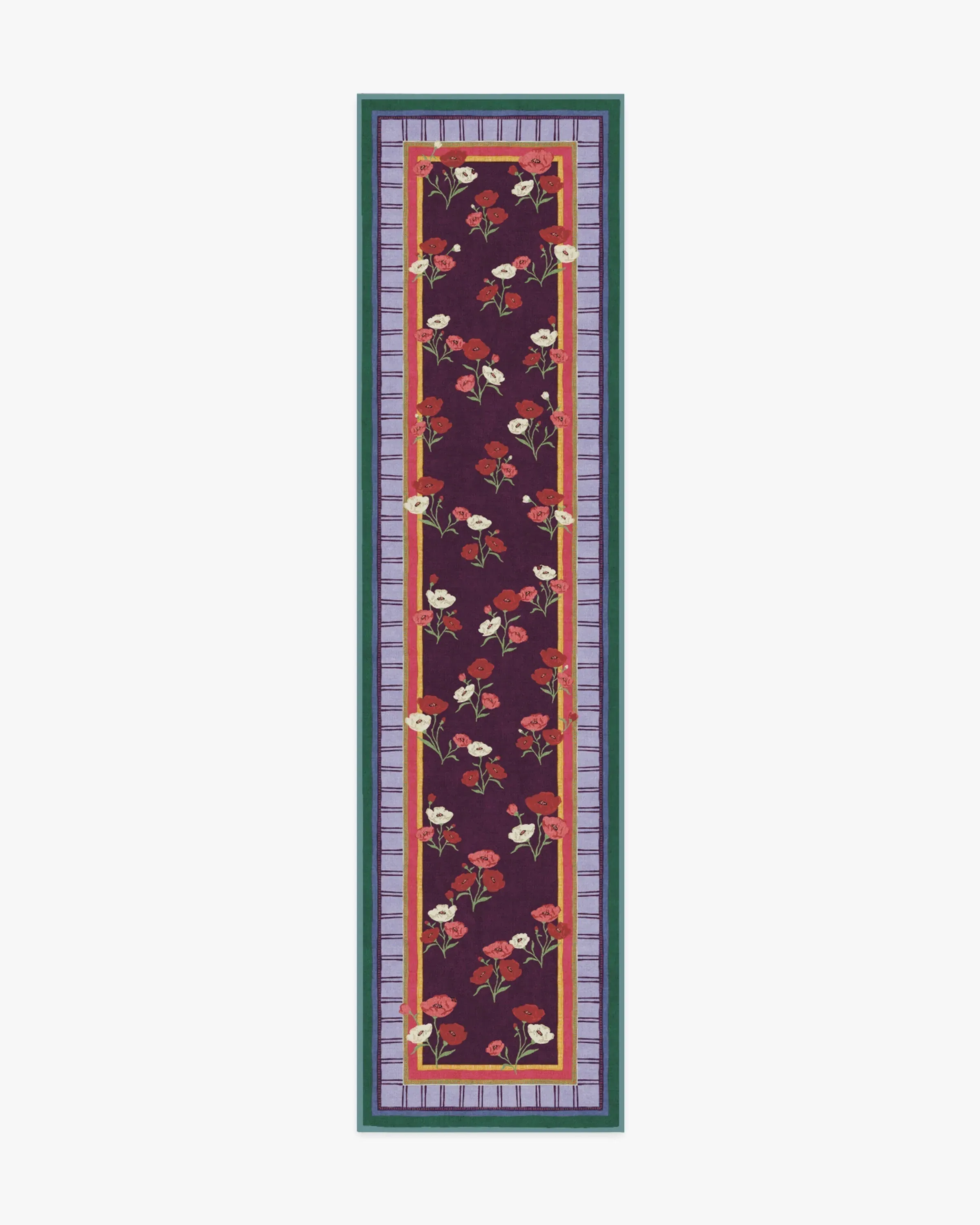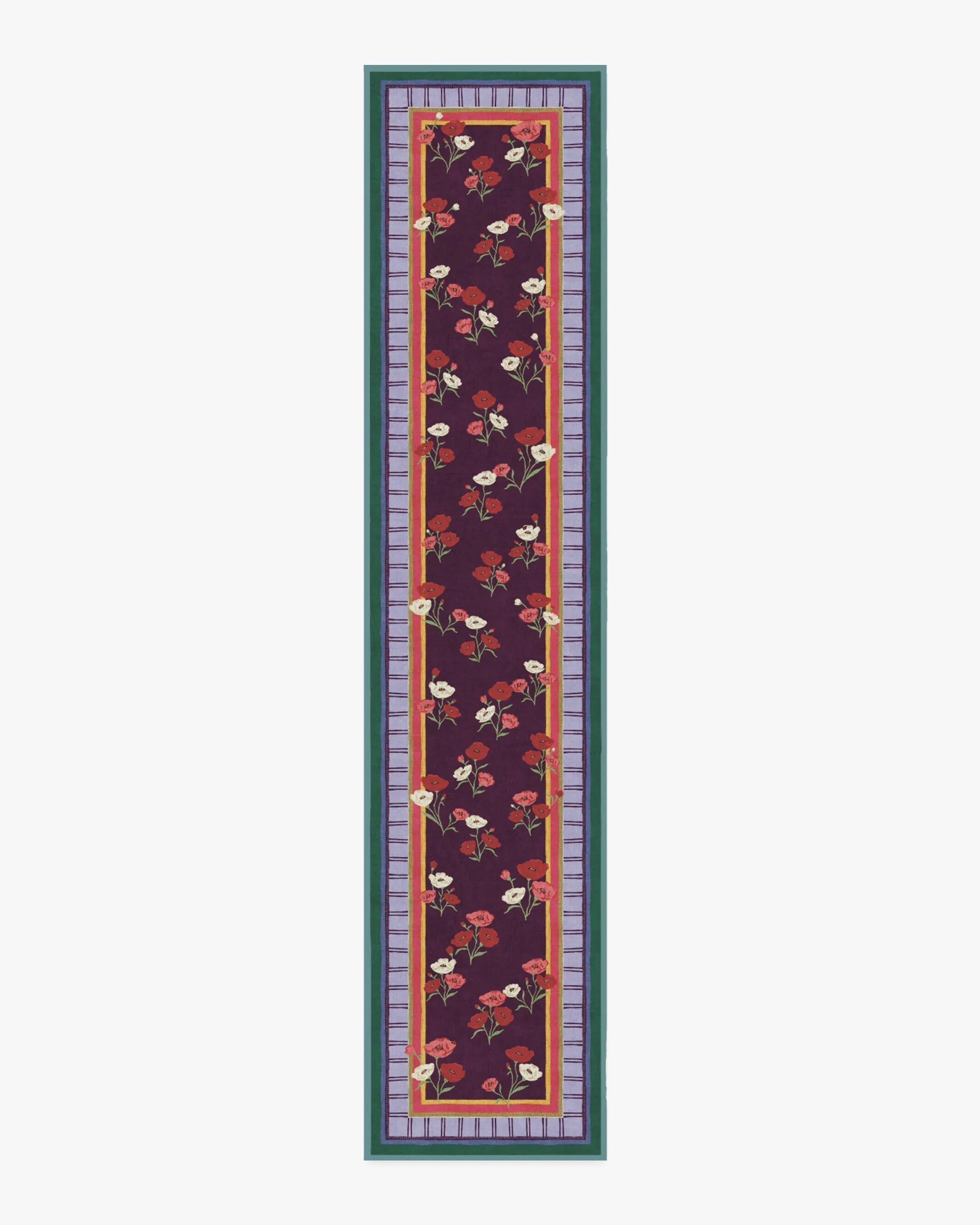 BACK BY POPULAR DEMAND: Step into a garden of creativity with our Iris Apfel Ambroeus Royal Plum Tufted Rug. Inspired by Iris' collection of vintage textiles and heirloom, hand-painted scarves, this blooming design features delicate floral motifs with������ladybirds hidden among the petals. An intricate border with varied line widths complements the crimson, pink, and white poppies that stretch beautifully against a royal plum background. Bright marigold, pinks, light purples, and deep blue-green blend in the lively-coloured border. Water-resistant, stain-resistant, and machine-washable. Rug colours may vary slightly according to your device and the lighting in your space. 60x90 | Machine Washable Area Rug | Kid & Pet Friendly | Indoor Rugs | Ambroeus Royal Plum Rug by Iris Apfel | Ruggable