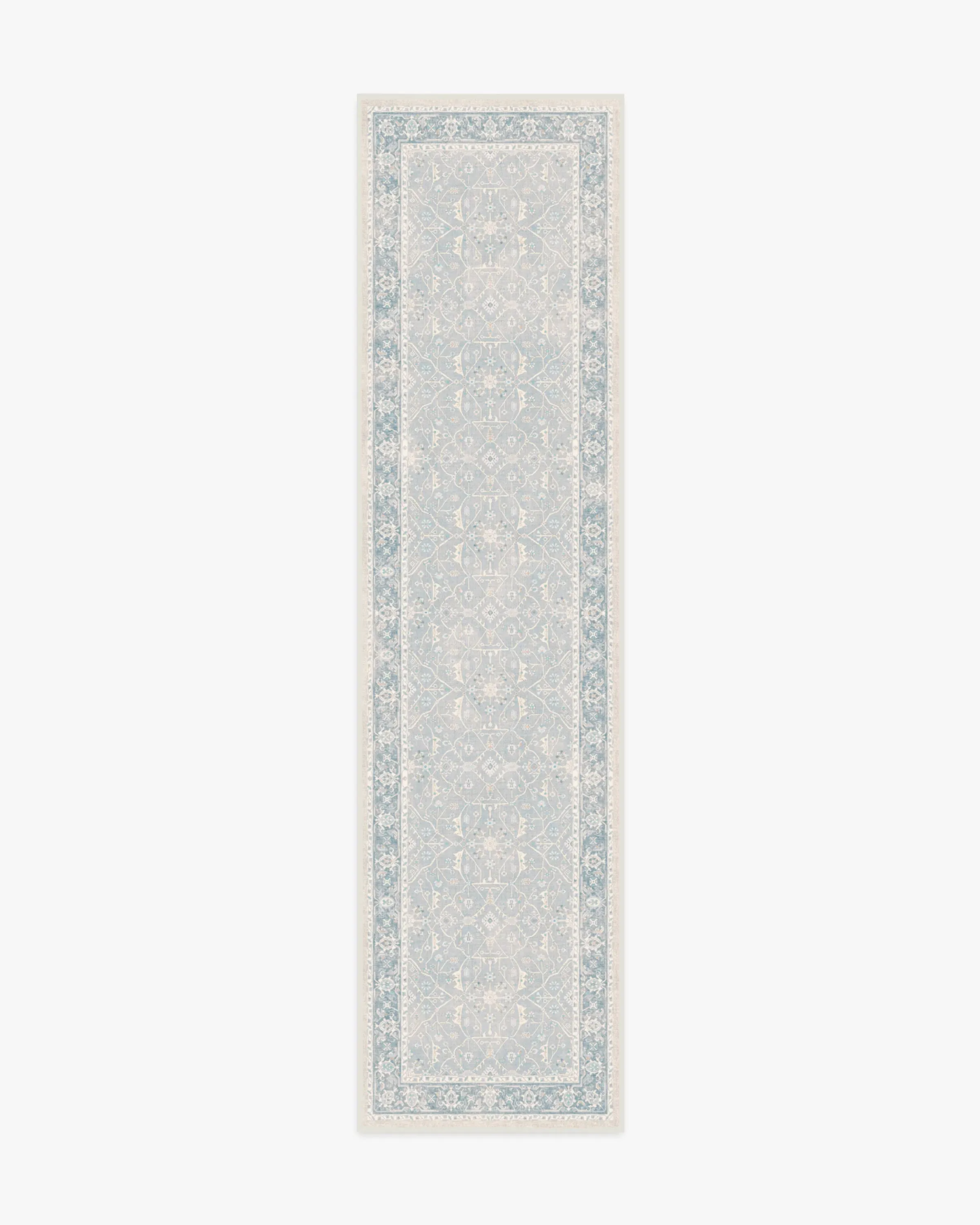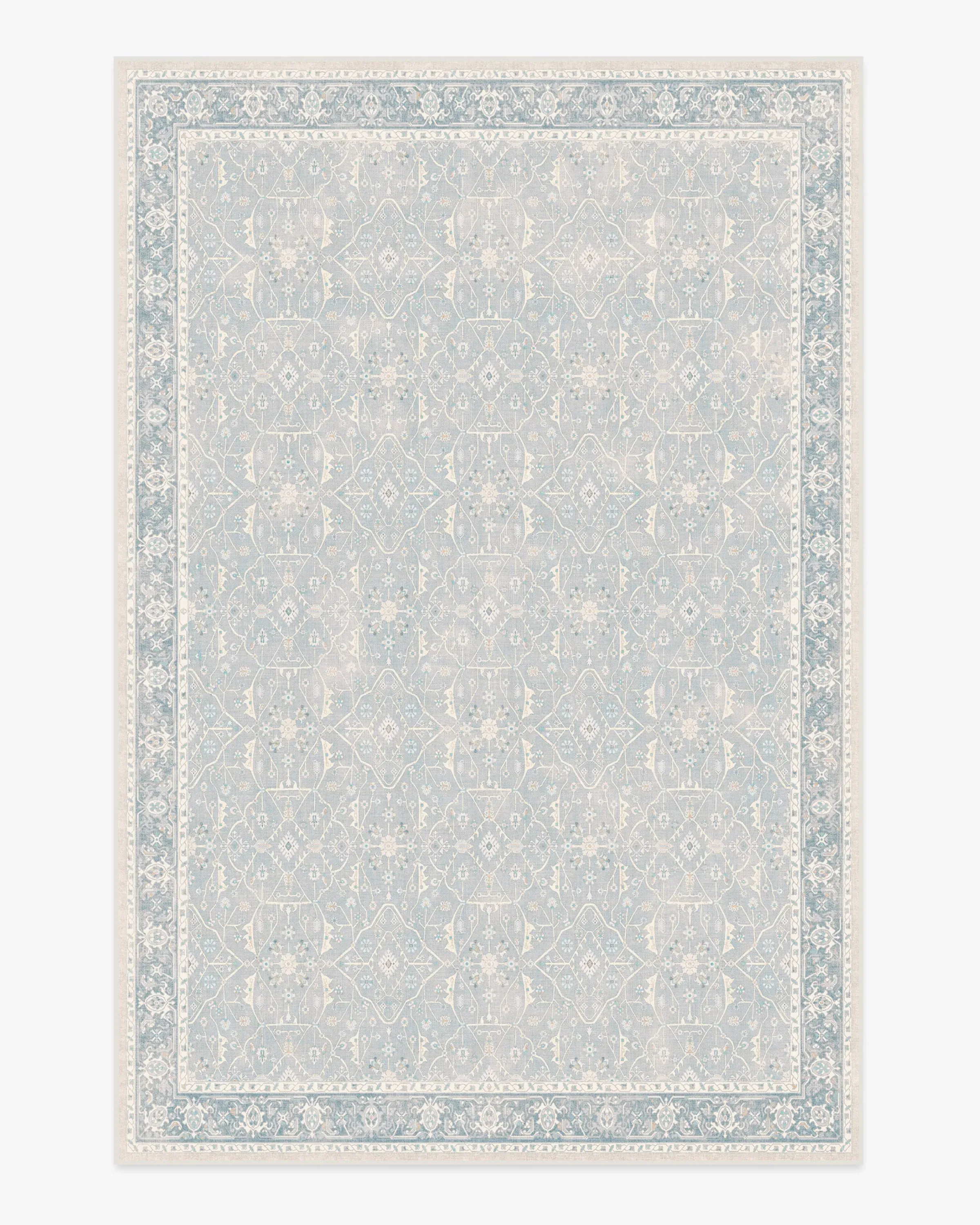 Dream in blue. Our vintage-inspired Celestine Soft Blue Rug exudes soothing blue pops of colour with hints of coral and a warm fog undertone. The whimsical floral theme sparks happiness with its intricate flowering vine lattice panel design. Made from our water-resistant, stain-resistant, and machine-washable low-pile Chenille material. 60x90 | Machine Washable Area Rug | Kid & Pet Friendly | Indoor Rugs | Celestine Soft Blue Rug | Ruggable