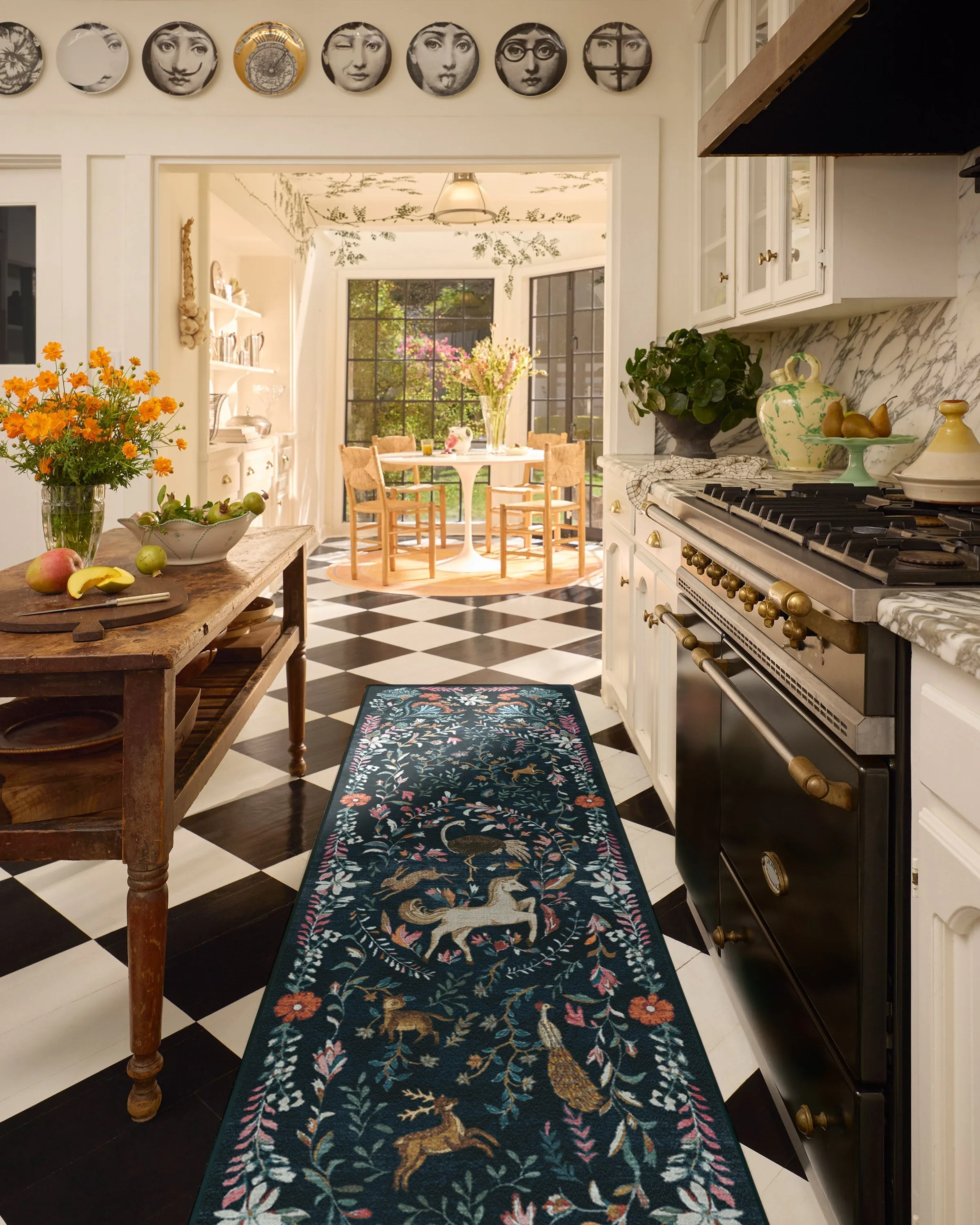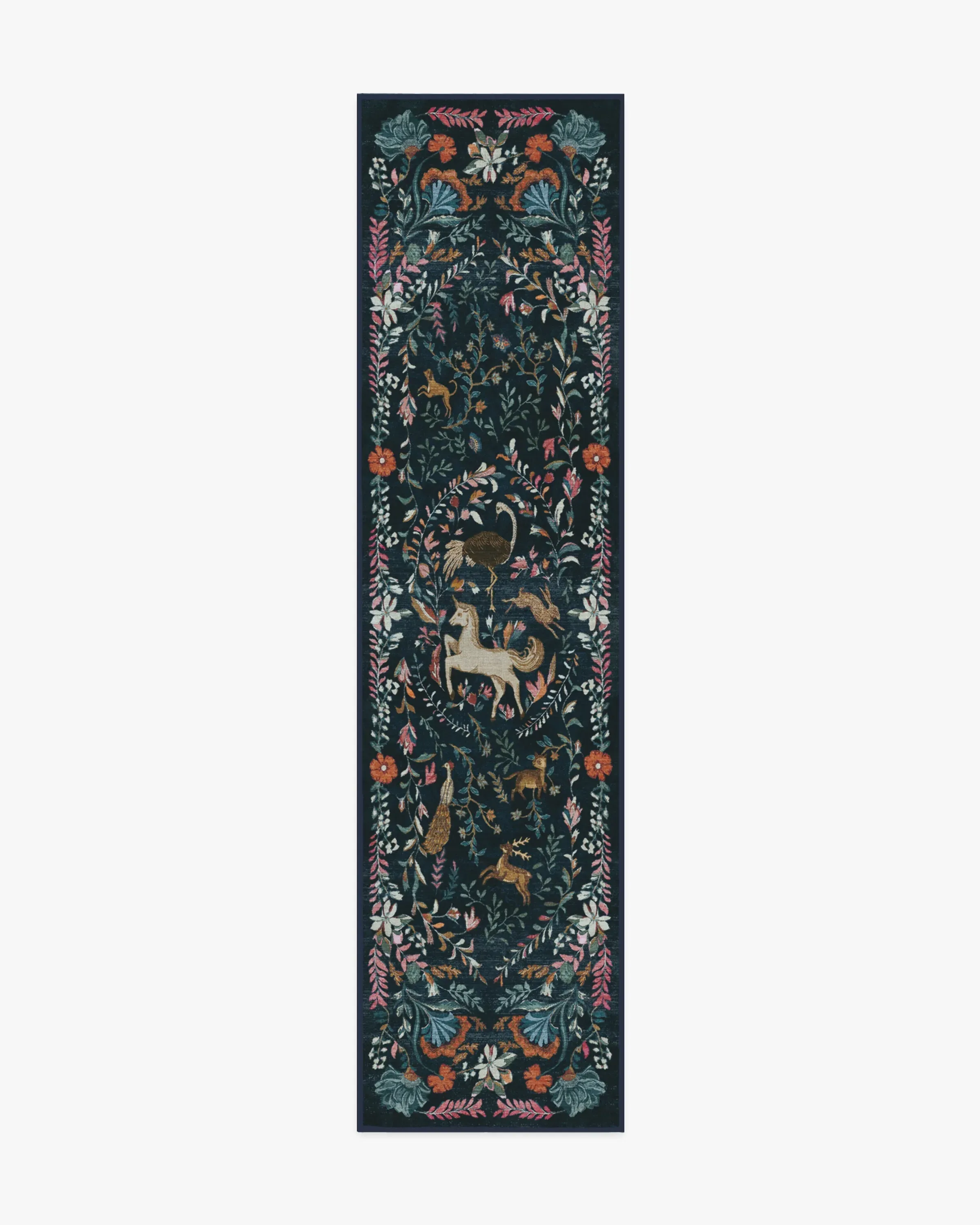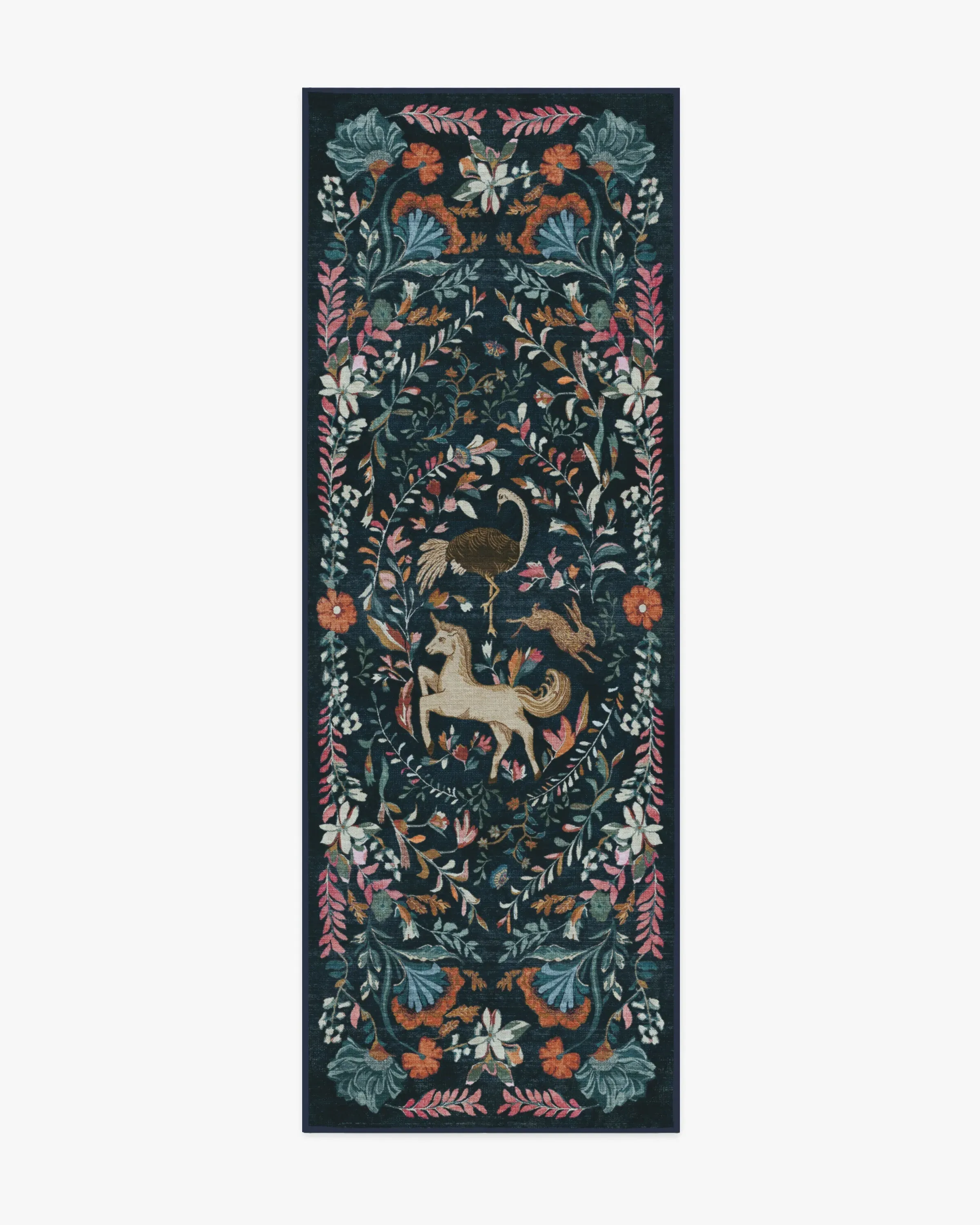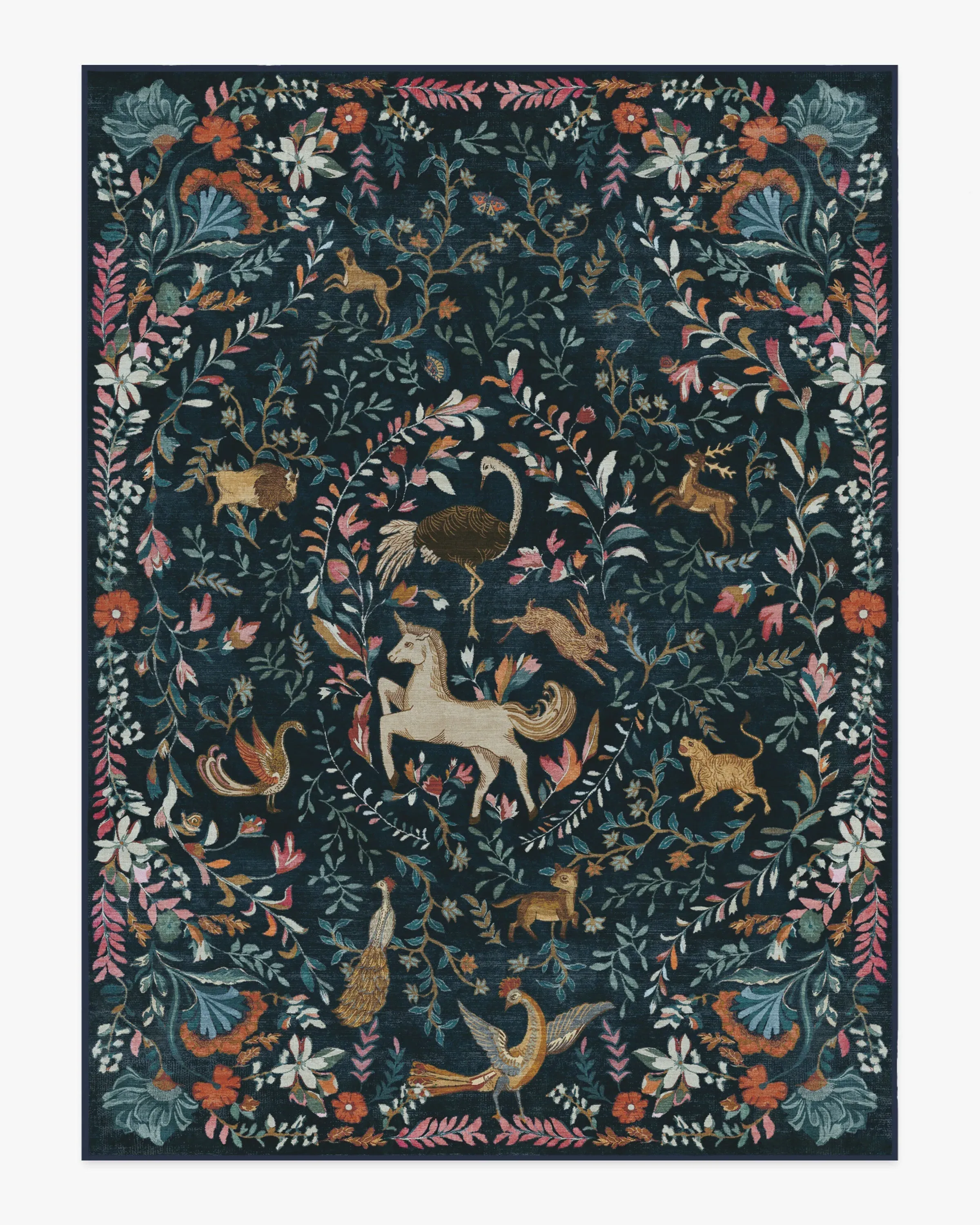 Unleash your inner unicorn with our Iris Apfel Dreamweaver Blue Multicolour Rug. Inspired by Iris' tendency to combine sophistication and fantasy, this dreamy tapestry design features whimsical flora and fauna in a plethora of azure hues. The rest of its dreamlike palette is complemented by blush pink, gold, verdigris green, cerulean blue, cream, and brown ��������� all against a midnight blue background. Water-resistant, stain-resistant, and machine-washable. Rug colours may vary slightly according to your device and the lighting in your space. 60x90 | Machine Washable Area Rug | Kid & Pet Friendly | Indoor Rugs | Dreamweaver Blue Flatwoven Rug by Iris Apfel | Ruggable
