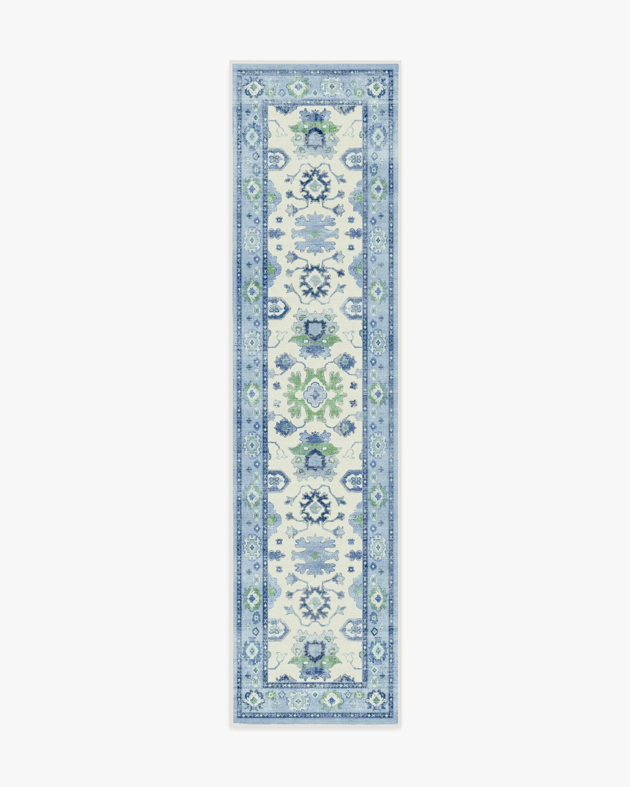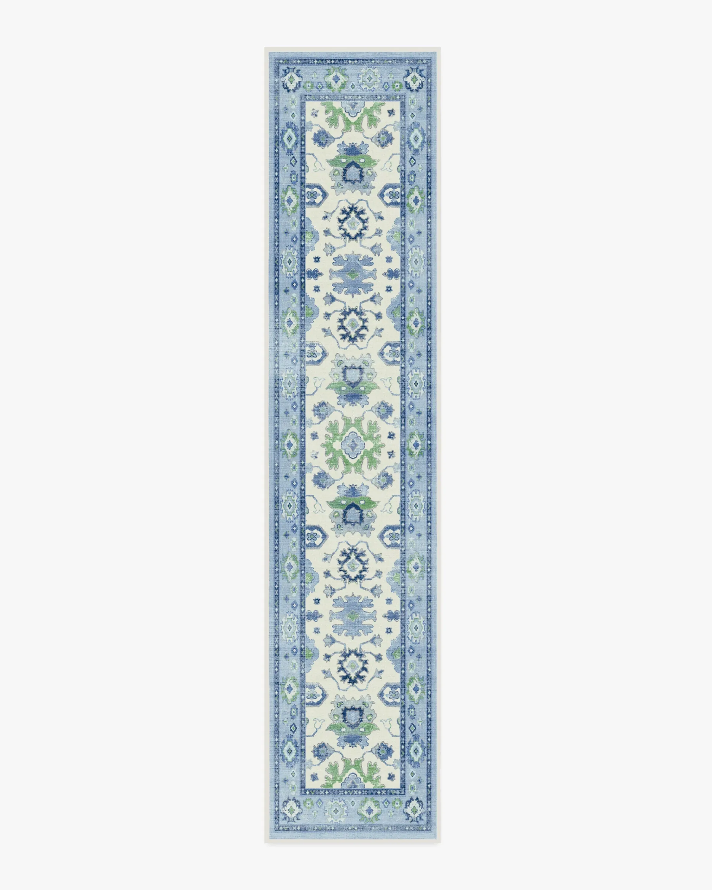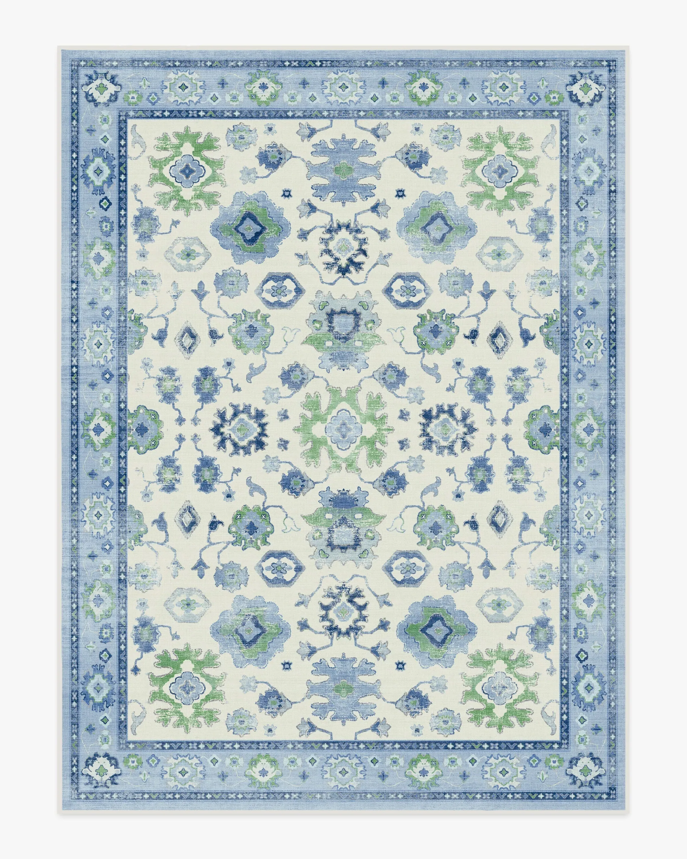 Inspired by Persian designs, this charming style features hand-drawn floral motifs that echo Mrs. Aliceâs signature aesthetic. Soft and saturated shades of blues and greens blend seamlessly with warm beige tones, creating a harmonious palette that is both rich and inviting. Water-resistant, stain-resistant, and machine-washable. Rug colours may vary slightly according to your device and the lighting in your space. 60x90 | Machine Washable Area Rug | Kid & Pet Friendly | Indoor Rugs | Serena Blue Rug by Mrs. Alice | Ruggable