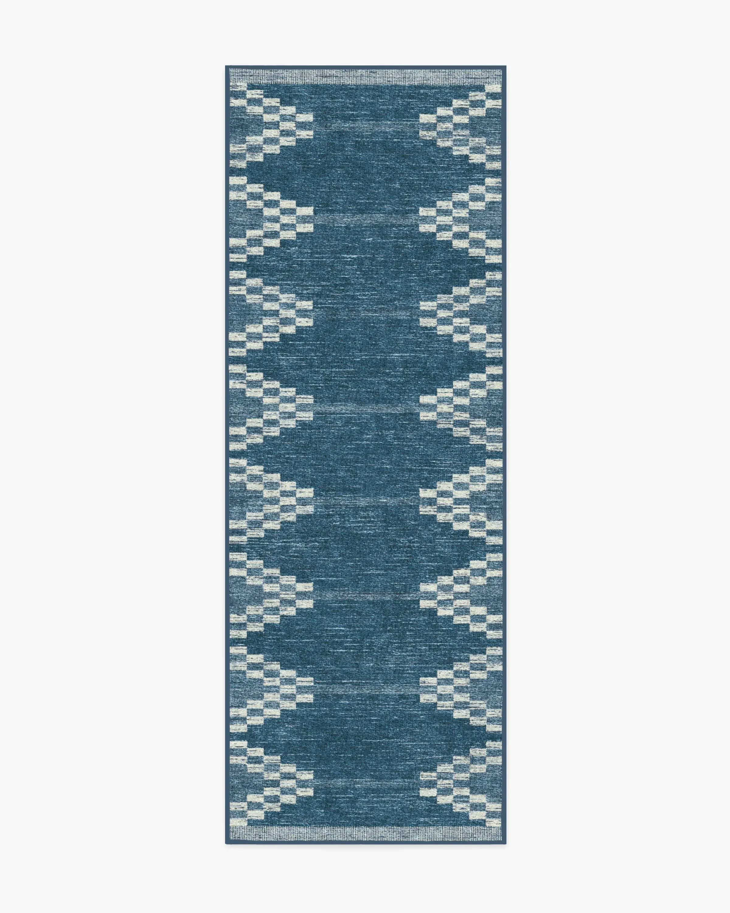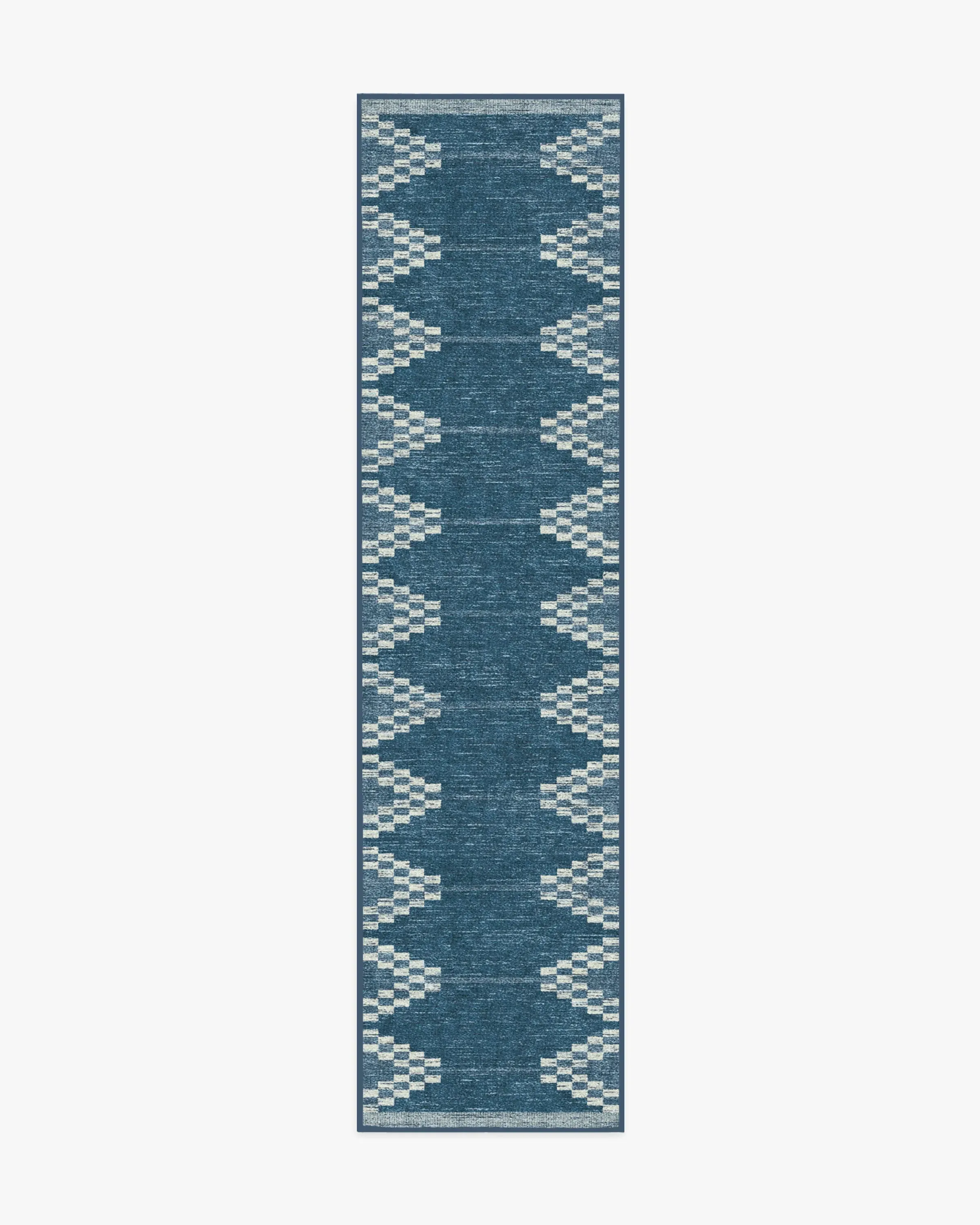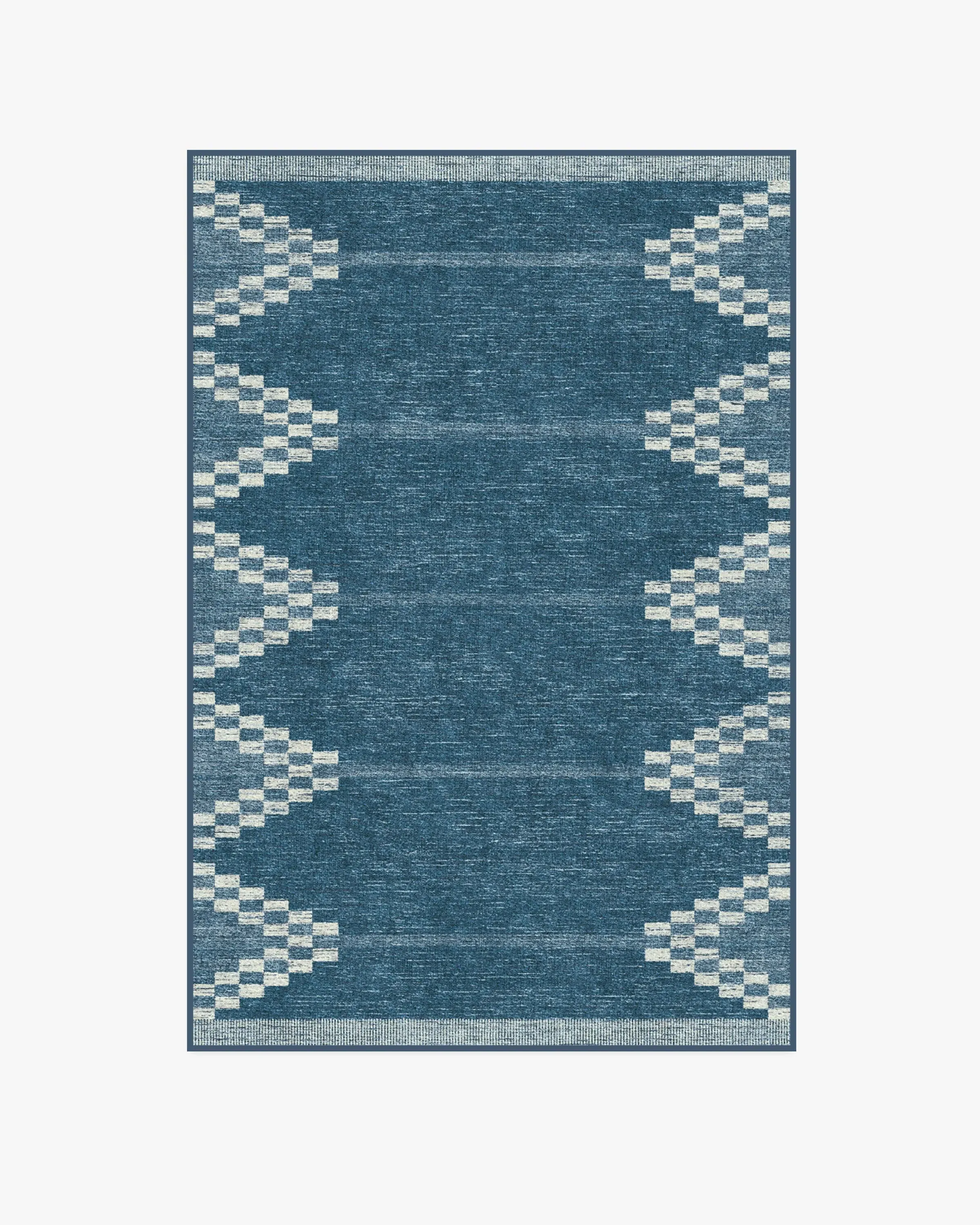 Inspired by a rustic hand loom, our Sloane Blue Rug features an intriciate geometric design in tonal blues complemented by soft cream accents. Water-resistant, stain-resistant, and machine-washable. Rug colours may vary slightly according to your device and the lighting in your space. 60x90 | Machine Washable Area Rug | Kid & Pet Friendly | Indoor Rugs | Sloane Blue Rug | Ruggable