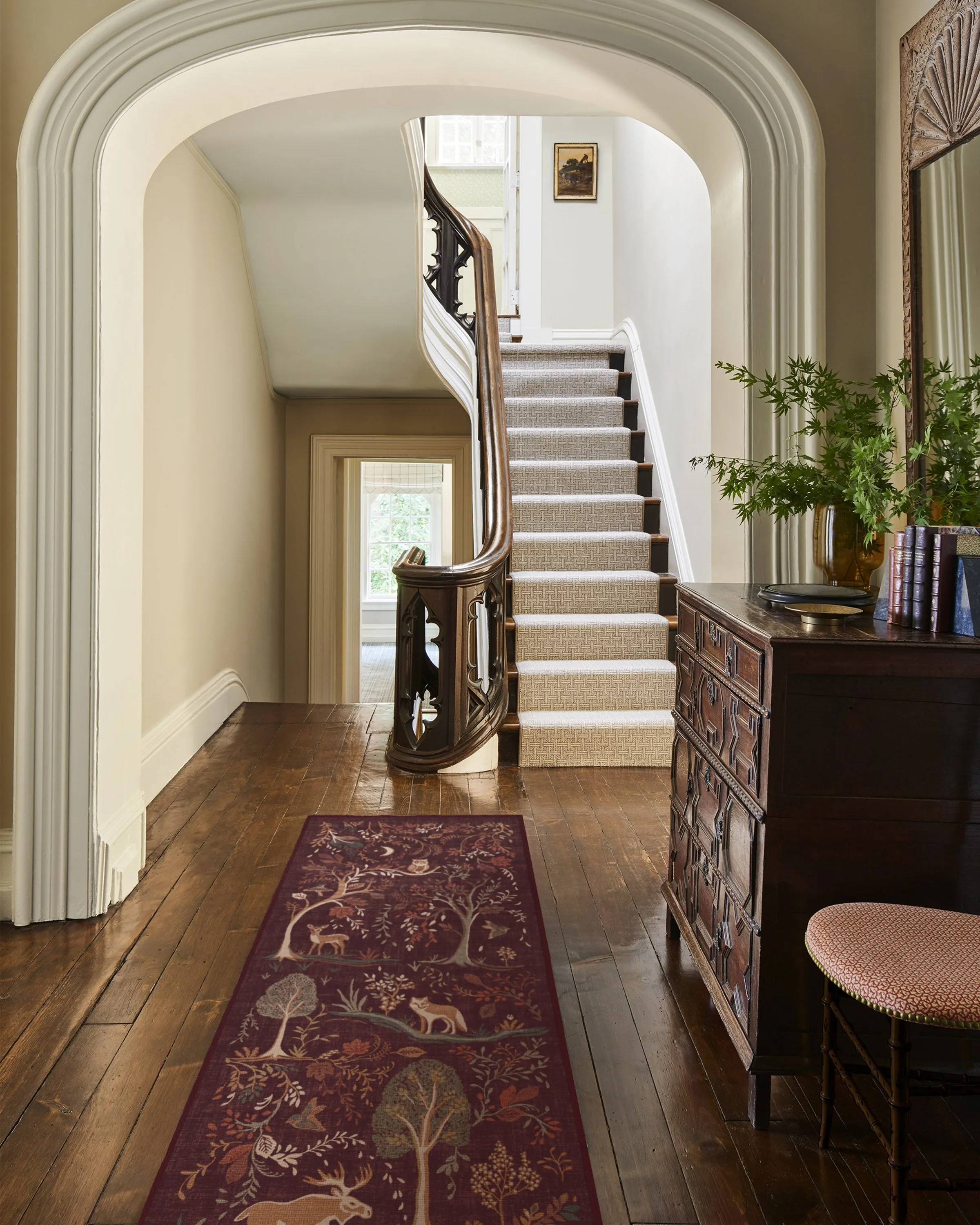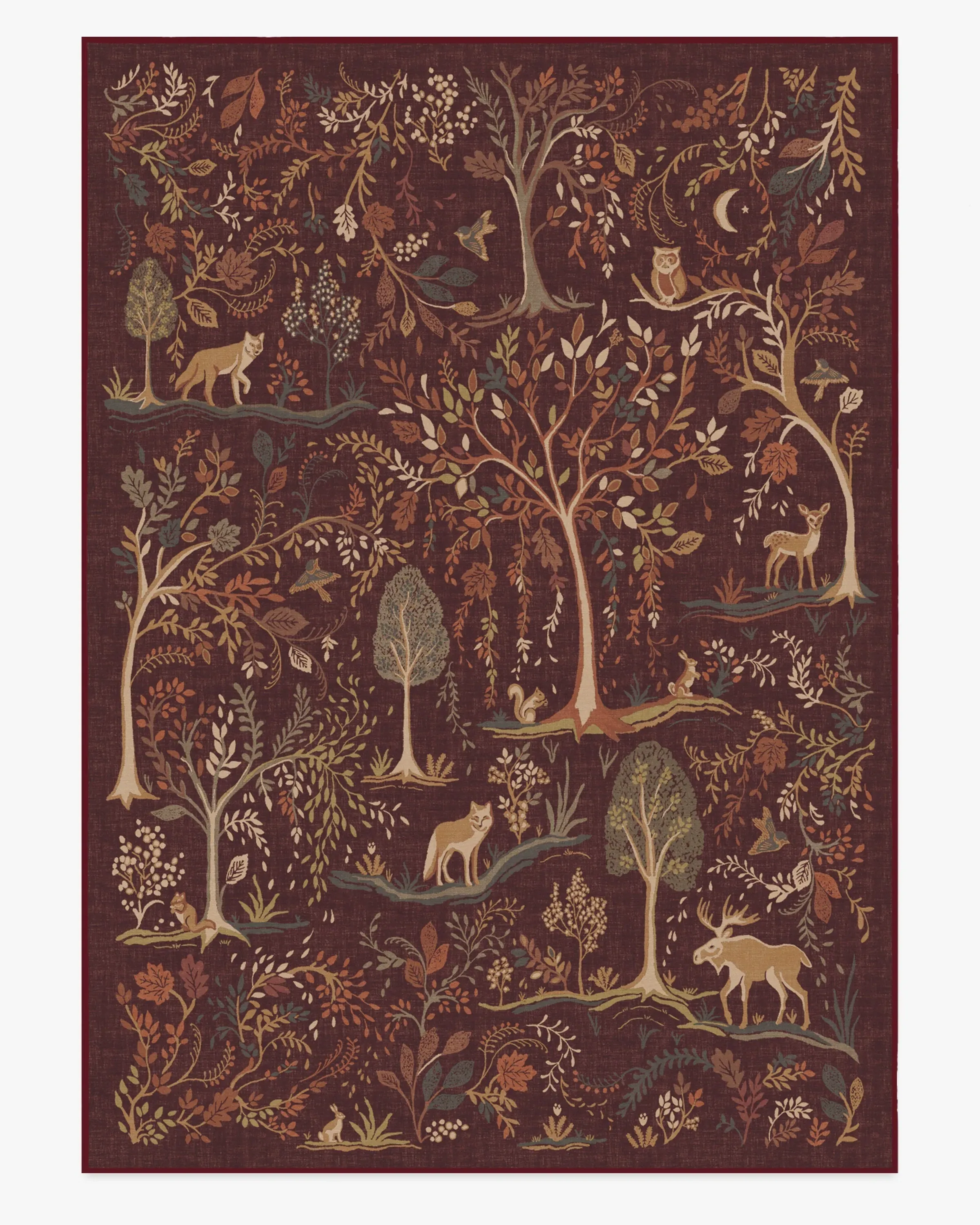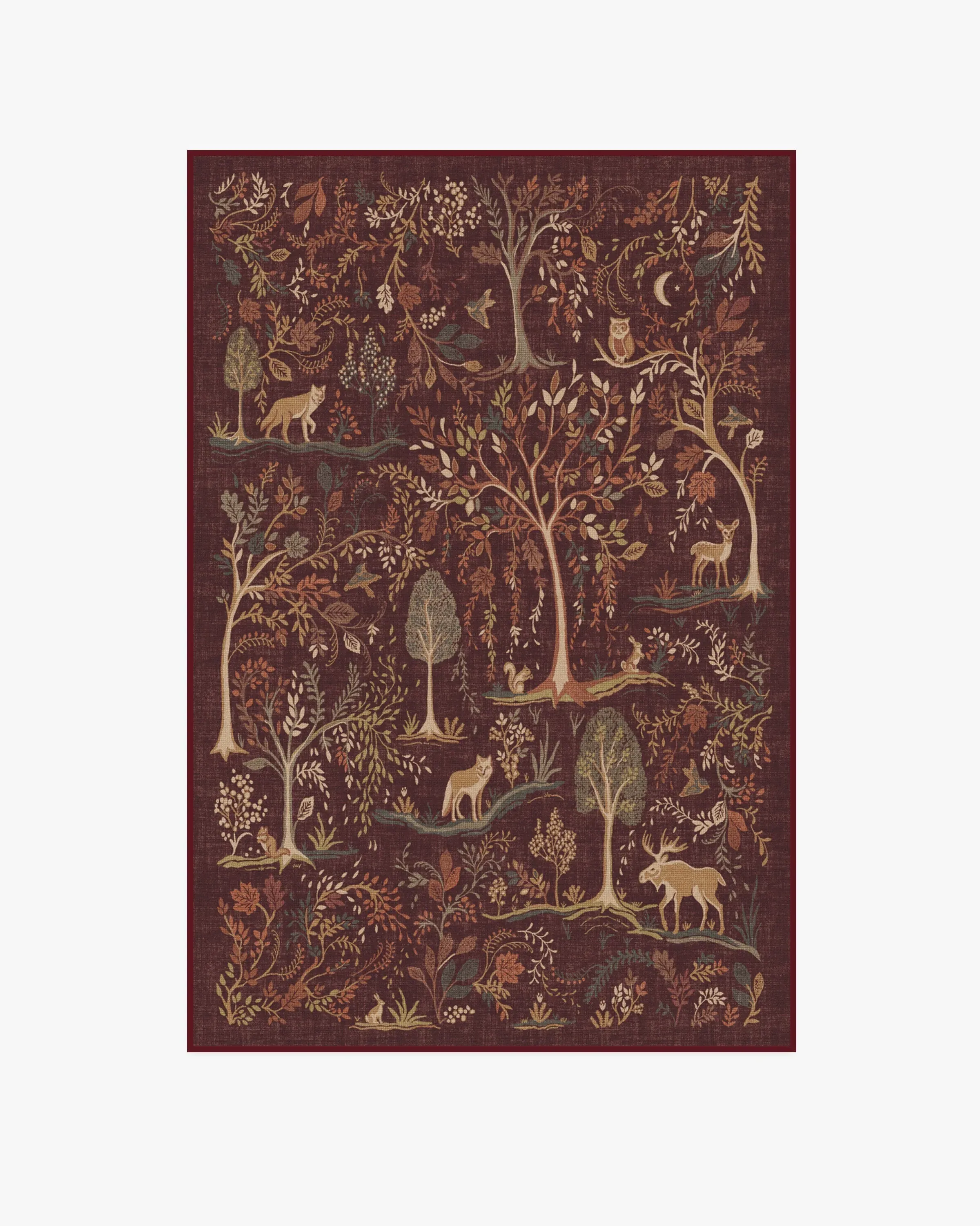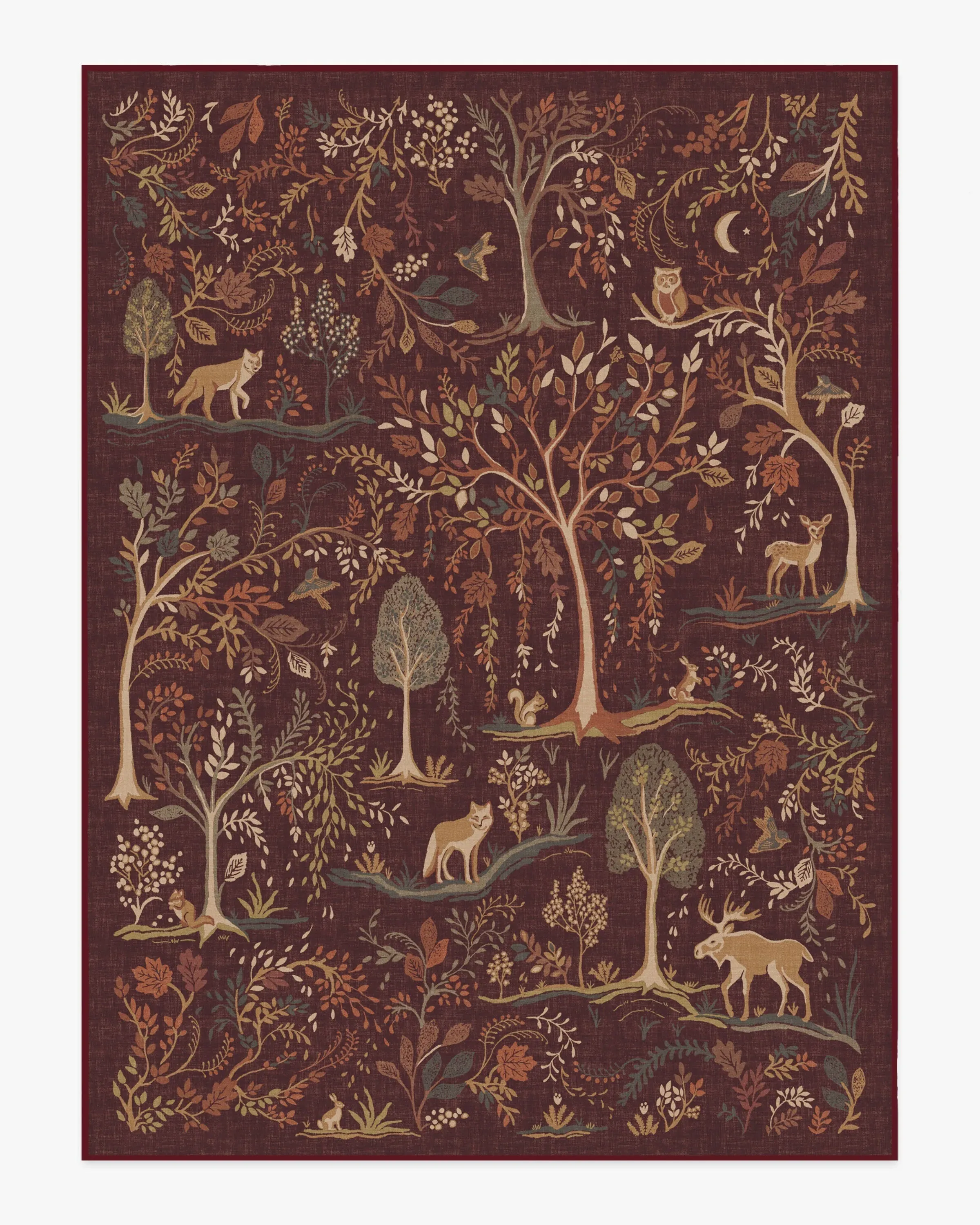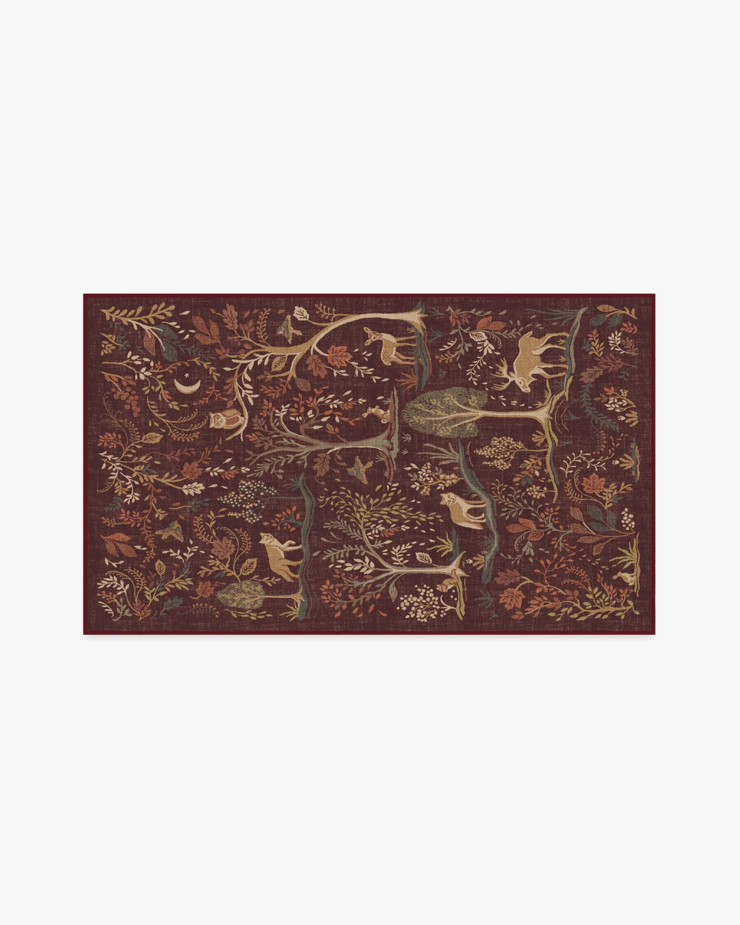 Refresh your space for autumn with our Wilder Burgundy Multicolour Rug. This whimsical design depicts a woodland landscape where animals roam amidst falling leaves and tall trees. The fall palette features soft sages, browns, coppers, neutrals, and greens, complemented by accents of light cream���������all set against a rich burgundy background. Water-resistant, stain-resistant, and machine-washable. Rug colours may vary slightly according to your device and the lighting in your space. 60x90 | Machine Washable Area Rug | Kid & Pet Friendly | Indoor Rugs | Wilder Burgundy Flatwoven Rug | Ruggable