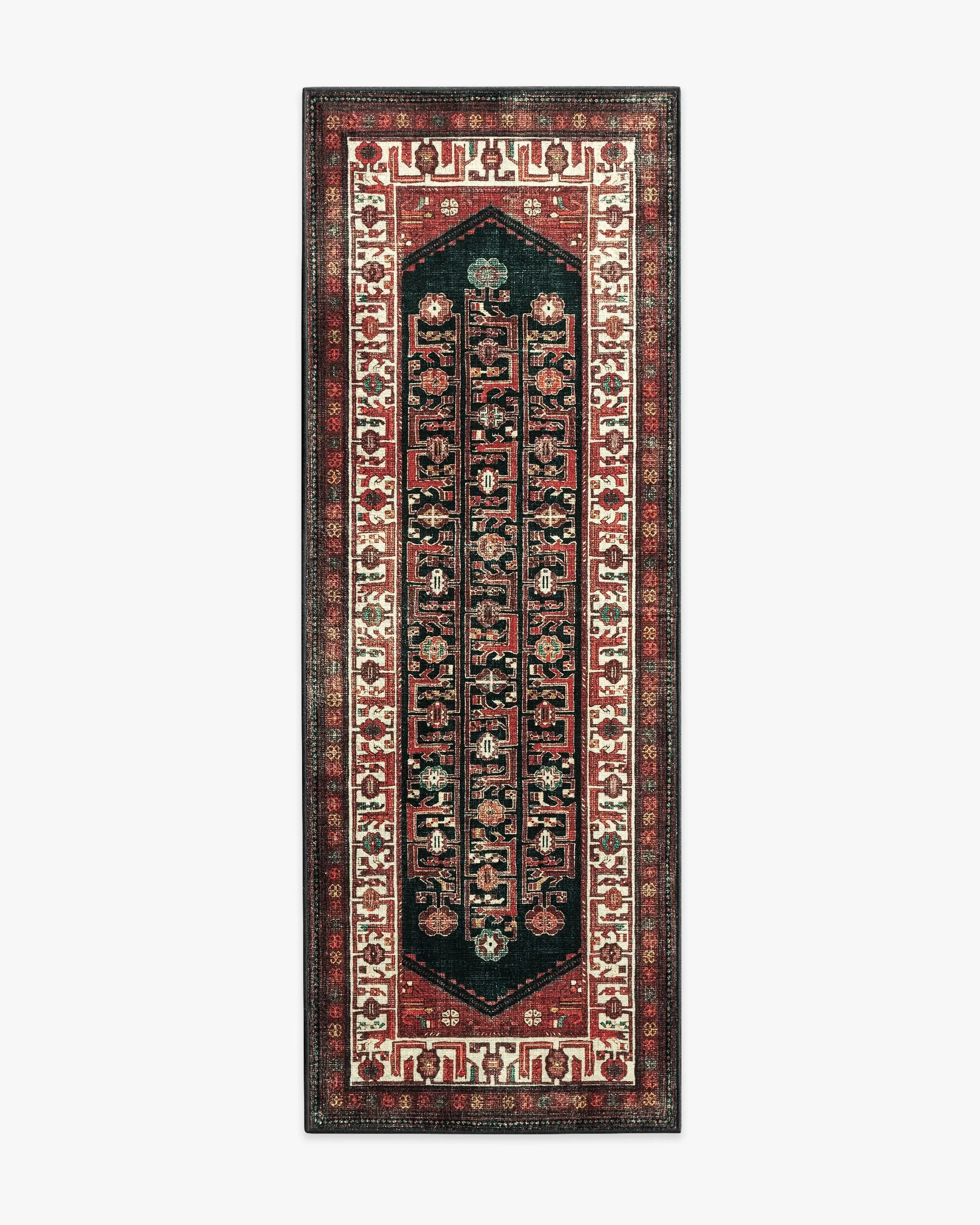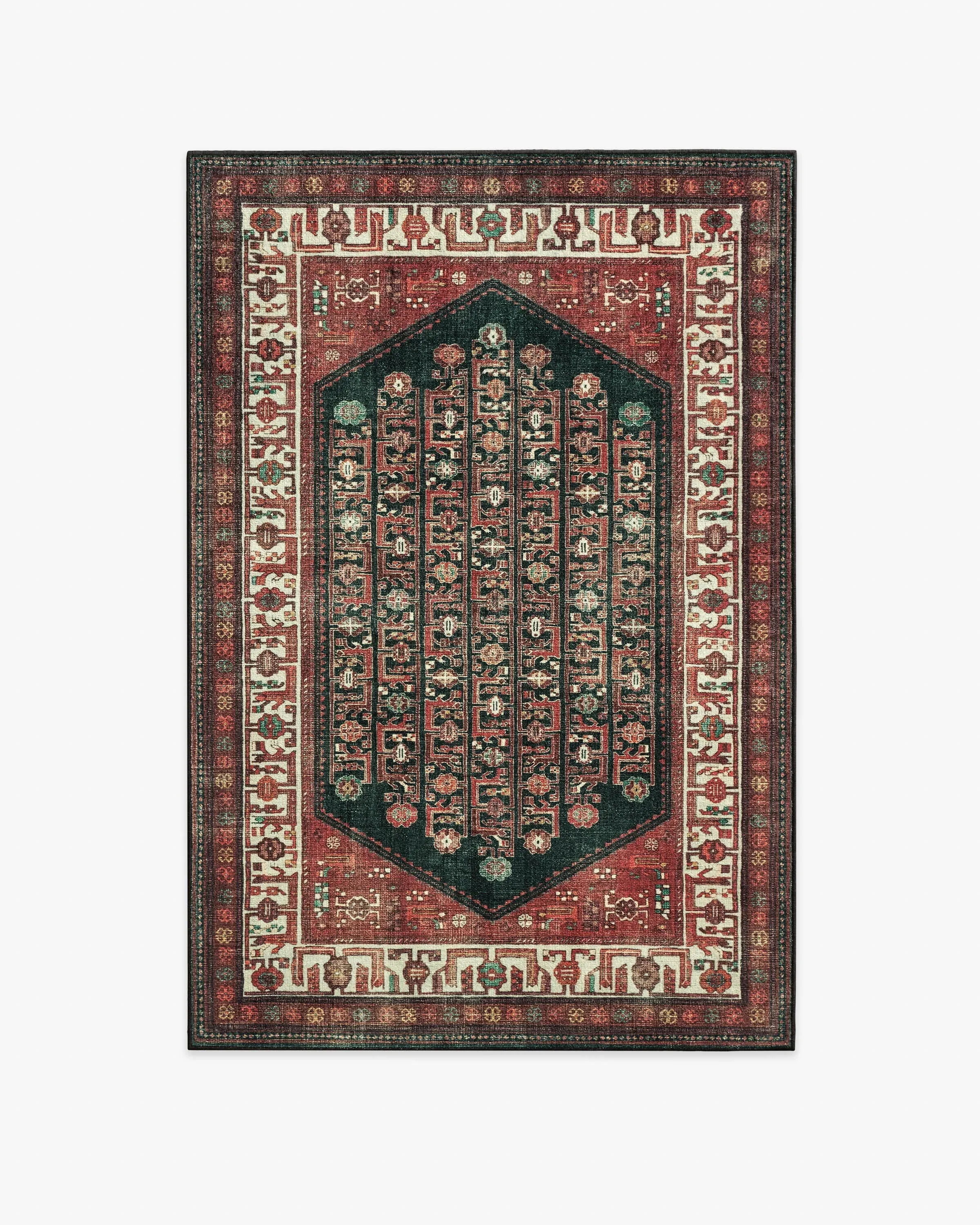 Inspired by vintage Turkish rugs, the Sevilla Crimson Rug leverages deep crimson with pops of jade, mustard, and rose within an intricately woven geometric design for a statement piece that will ground any room in rich colour. Water-resistant, stain-resistant, and machine-washable. Colours may vary by device and lighting. 60x90 | Machine Washable Area Rug | Kid & Pet Friendly | Indoor Rugs | Sevilla Crimson Rug | Ruggable