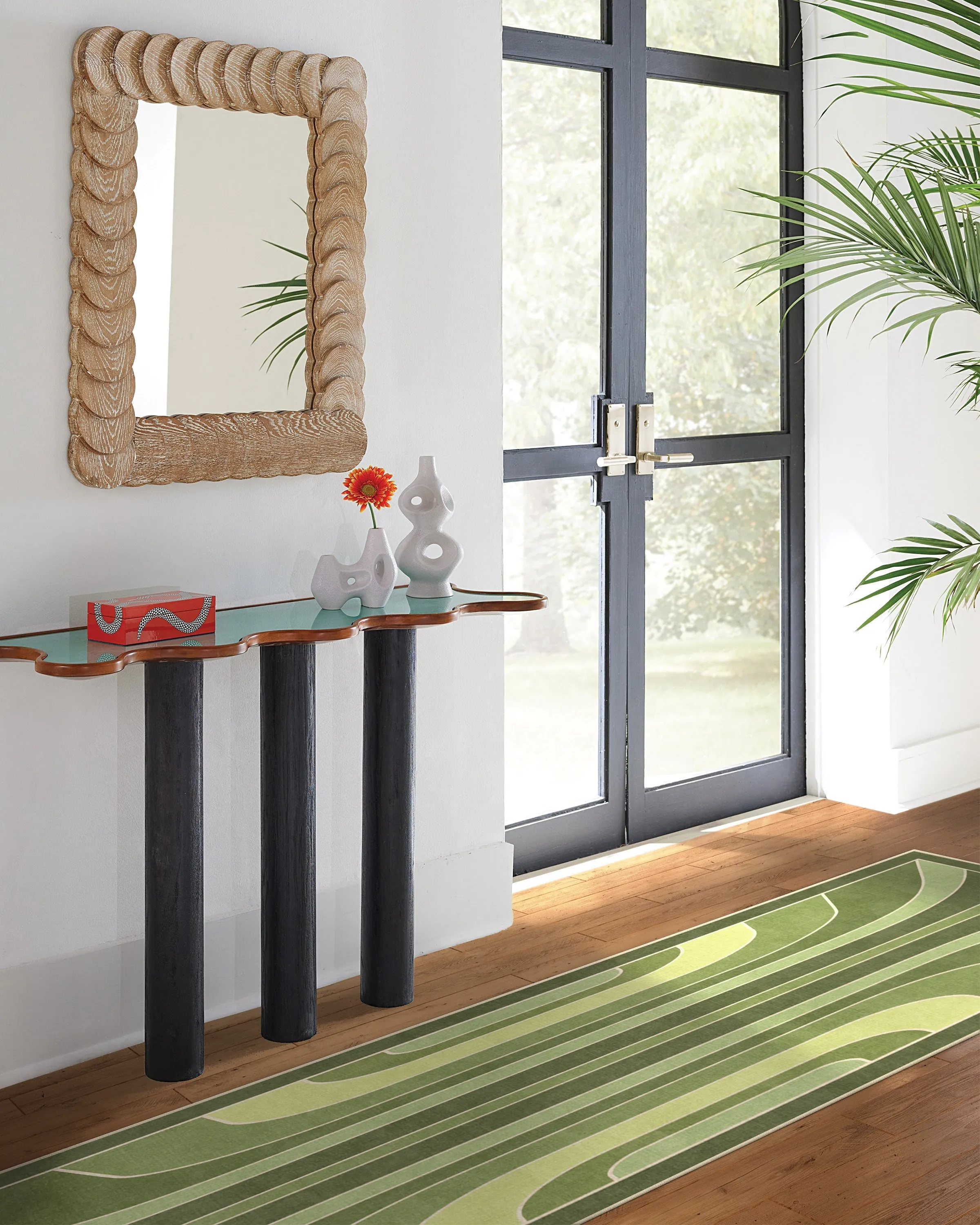 Make a statement with our Jonathan Adler Paradox Green Rug. This geometric design features an all over engineered design featuring large, graceful curved lines. Its palette of deep forest greens, warm citrus greens, and deep sages, adorned with soft grey linework, creates a harmonious blend of colours that exudes modern glamour. Water-resistant, stain-resistant, and machine-washable. Rug colours may vary slightly according to your device and the lighting in your space. 60x90 | Machine Washable Area Rug | Kid & Pet Friendly | Indoor Rugs | Paradox Green Flatwoven Rug by Jonathan Adler | Ruggable