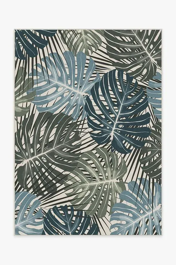 The area rug features hand-drawn layers of sage green and teal blue monstera leaves that criss-cross on a light background. Its flatwoven construction provides durability, while the machine washable design offers easy maintenance. The botanical pattern creates a calming rainforest-like atmosphere with its natural color palette.