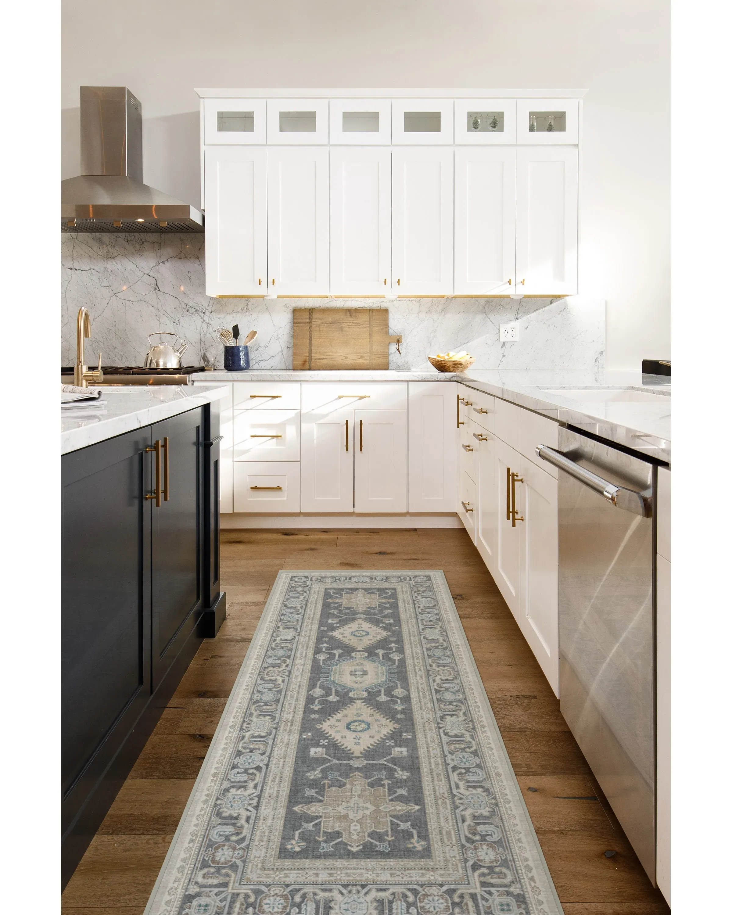 The Cambria Abalone Rug combines Turkish kilim inspiration with its detailed Persian pattern, accented by greige, sage green, and teal tones with cream highlights. Its flatwoven construction provides lasting durability, while the machine washable feature offers easy care. The pet and kid-friendly material handles daily use, and the washable design maintains appearance over time. W60 x D90 cm
